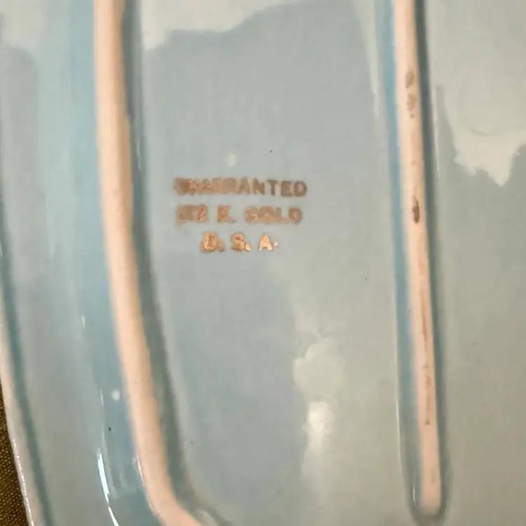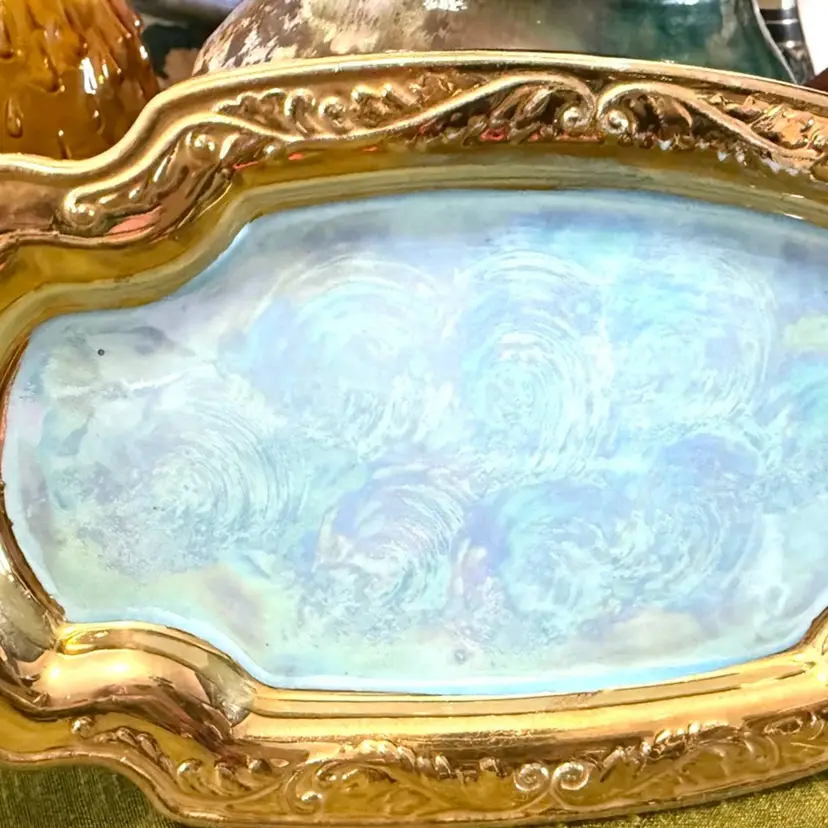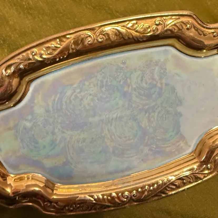 "Warranted 22K Gold" Made in U.S.A." on the bottom. It functions as a decorative accent for vanities, coffee tables, or dressers, and is used for holding small items like jewelry, perfume, or serving light snacks. Minor way wear on the gold edging