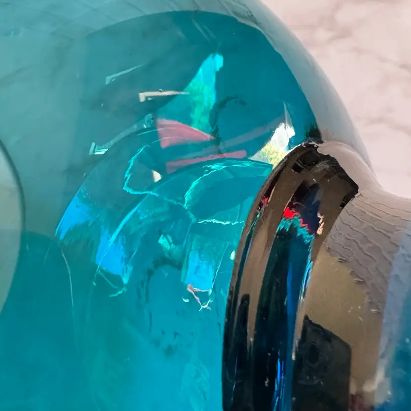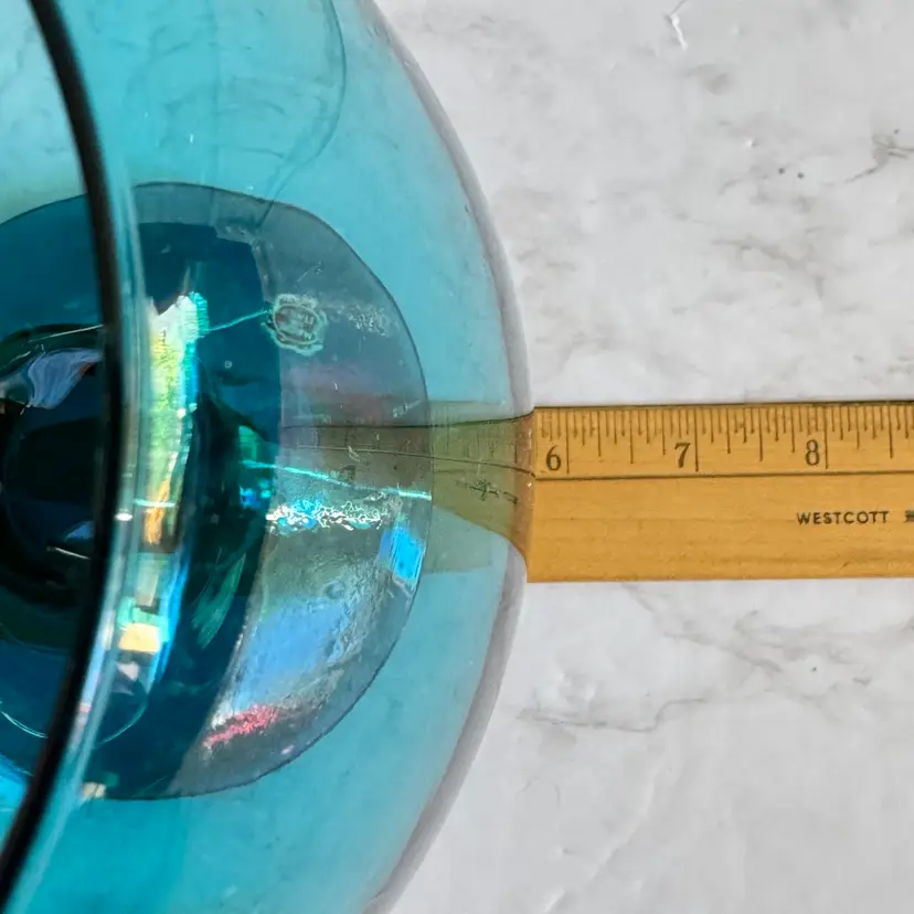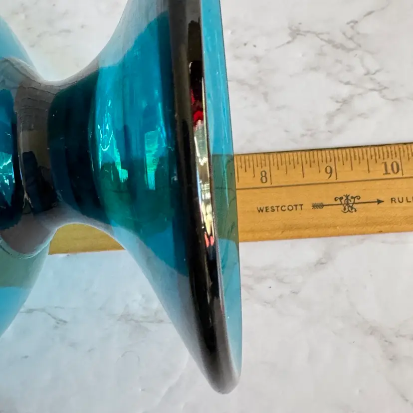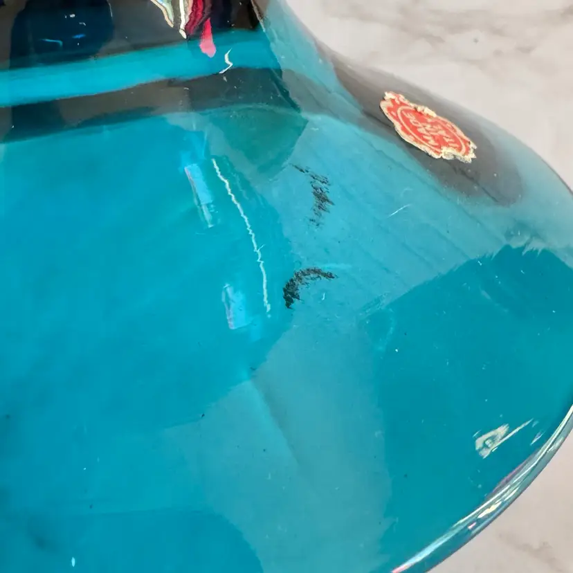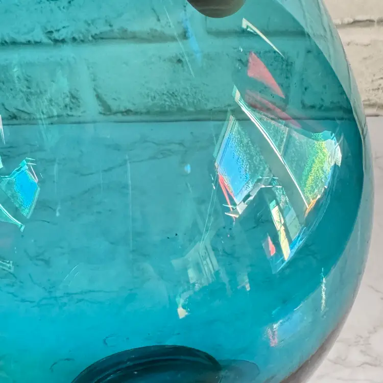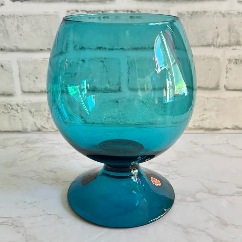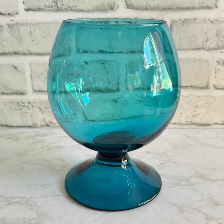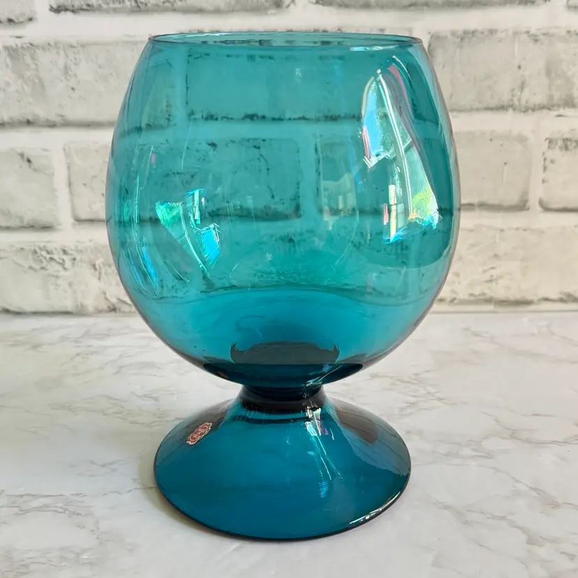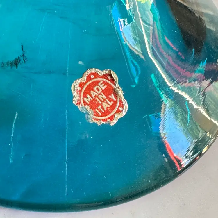 This striking Italian glass vase features a bold teal/blue color with a bubbled, textured surface and a wide, rounded bowl shape that tapers to a flared rim—classic mid-century modern style. The base has a red “MADE IN ITALY” foil sticker. Measures approximately 5-3/4” diameter x 7-1/2” high. Good vintage condition with some typical manufacturing imperfections (air bubbles, minor surface irregularities) but no chips, cracks, or repairs. Perfect as a statement piece for modern, retro, or coastal decor, or for holding flowers/branches. From a smoke-free home; ships securely packaged.