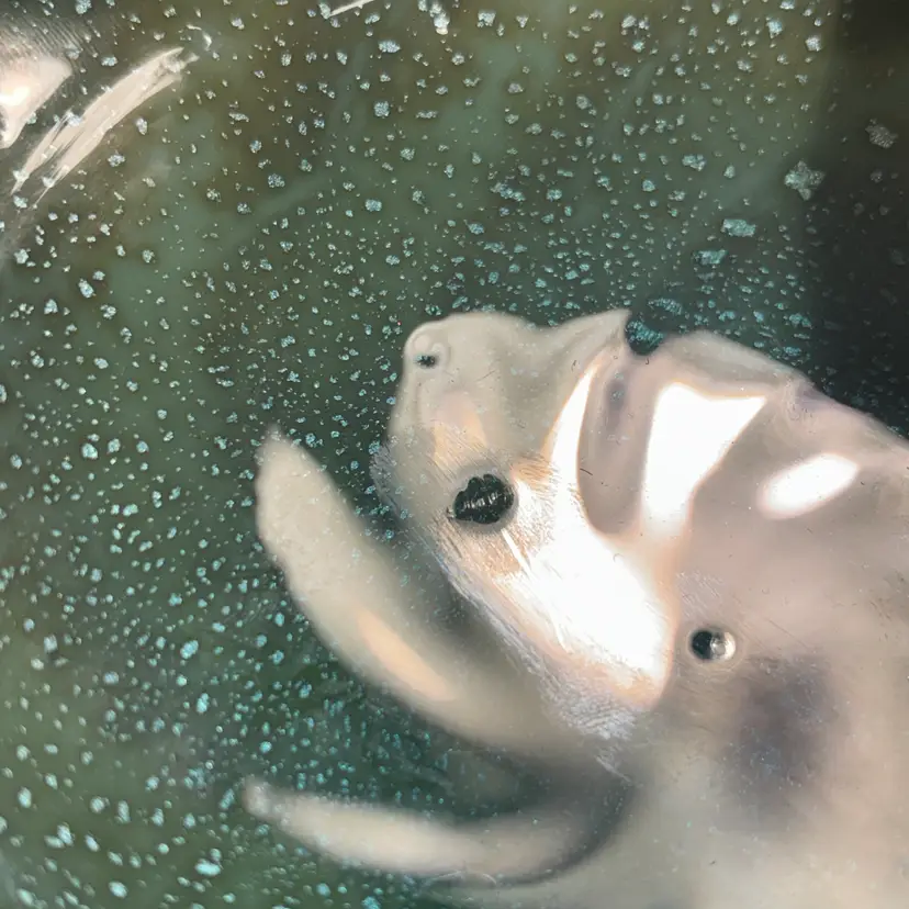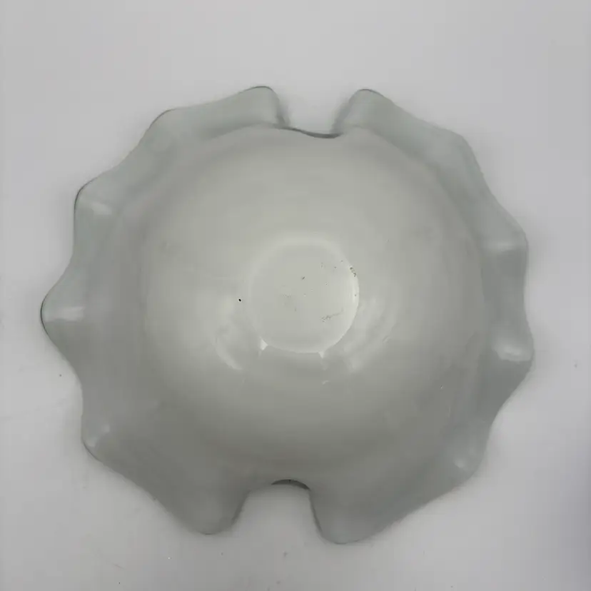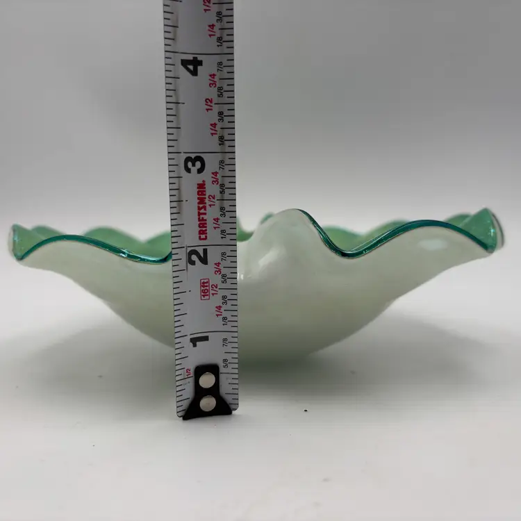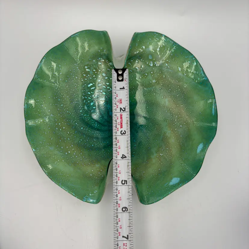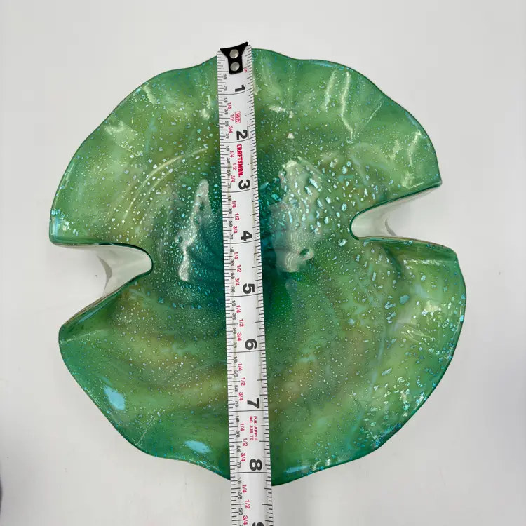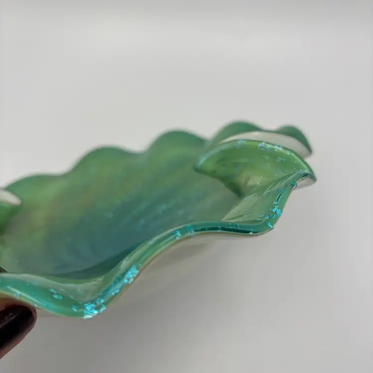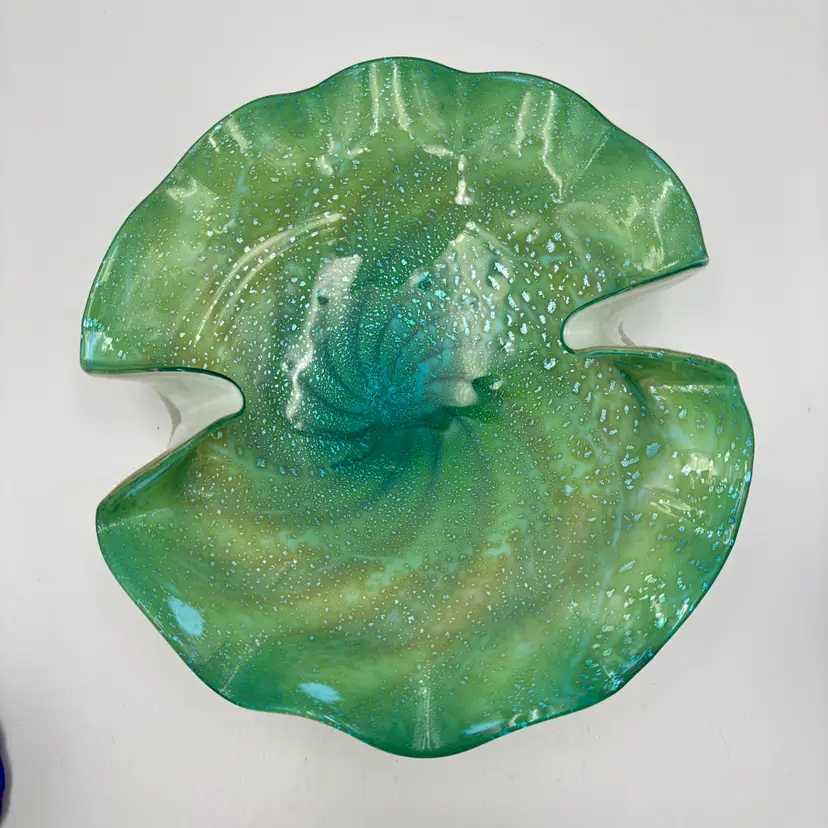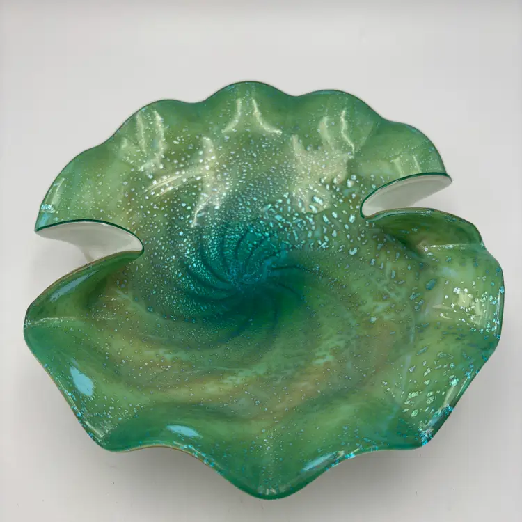Type: Decorative Art Glass Bowl Technique: Hand Blown Color: Green, Teal, Aqua Pattern: shelf shaped, with swirls in the center extending to about the mid-center of the bowl and silver flecks aventurine. The underside is encased in clear and white glass. Shape: Freeform with Ruffled Edge Finish: Glossy, Translucent