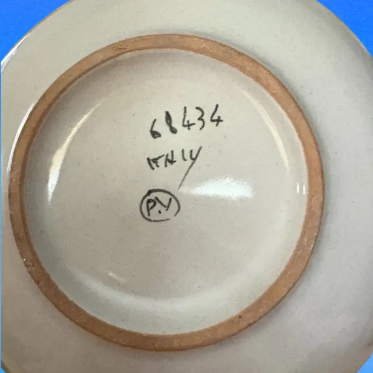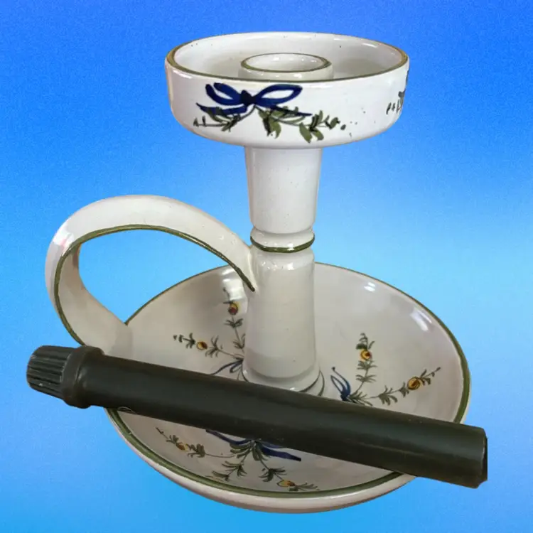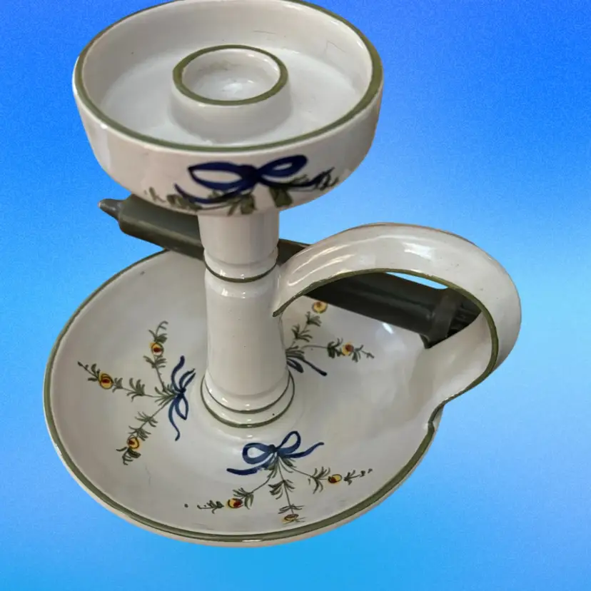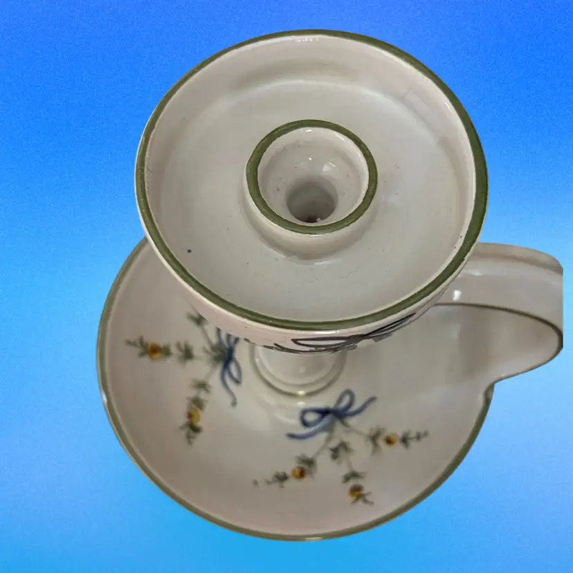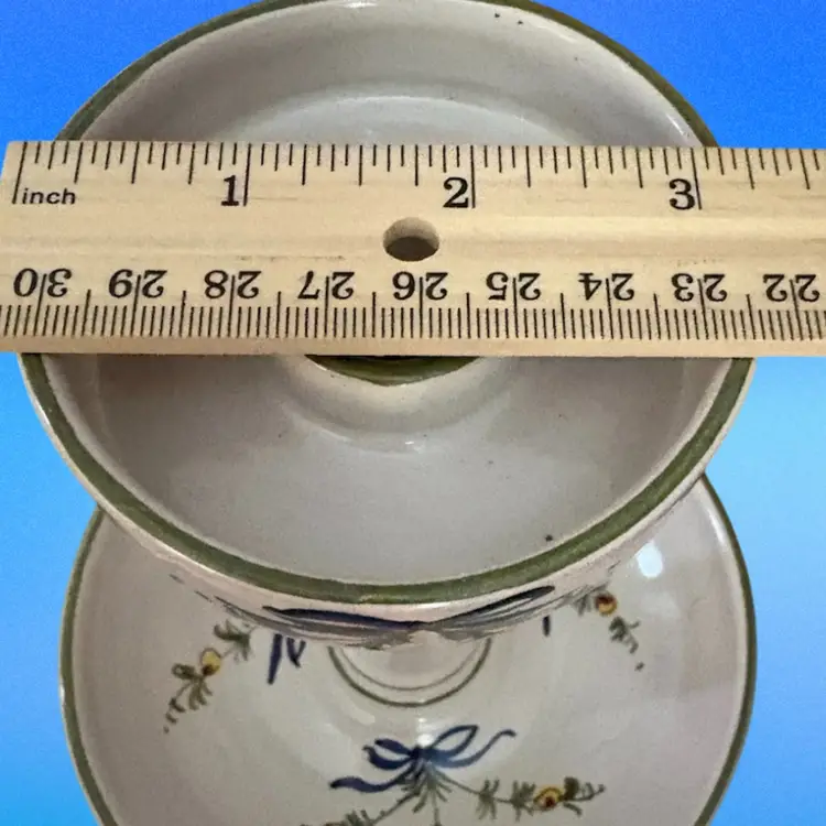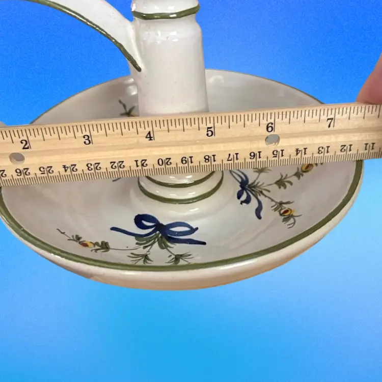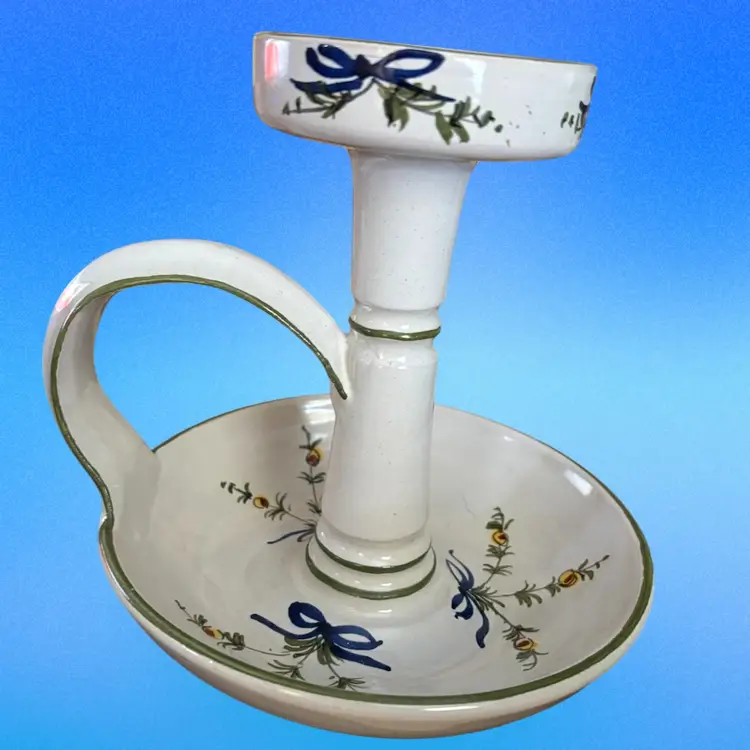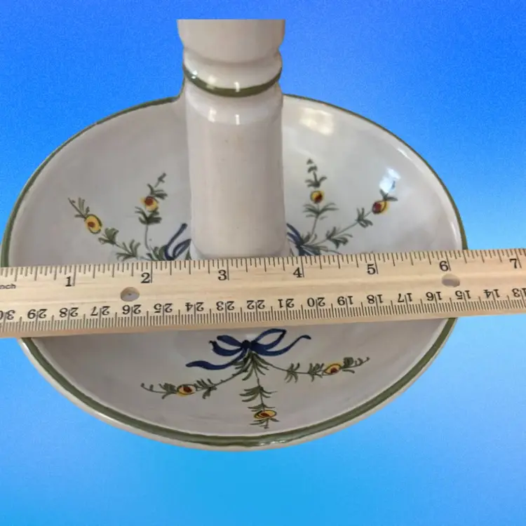 Italian Pottery Chamberstick Candle Holder Hand Painted and Signed 7.5 inches tall and 6.5 inches across on bottom. Upper candle holder is 3 inches wide Call out - glazed skip on lower dish - see picture 4 it is a tiny bit under the green candle.