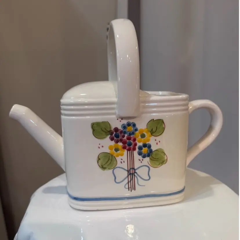 Beautiful Italian hand painted ceramic watering can. Awesome decor piece. Looks really good with a floral bouquet! No chips or cracks. Measures 9 inches to top of handle.