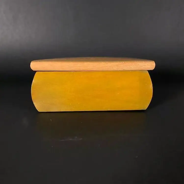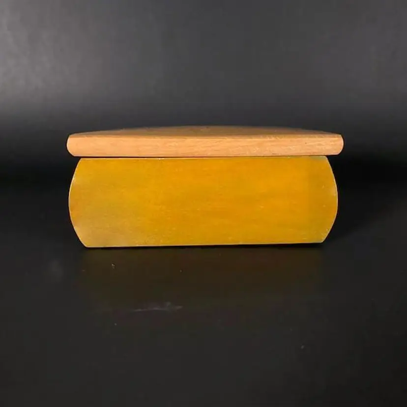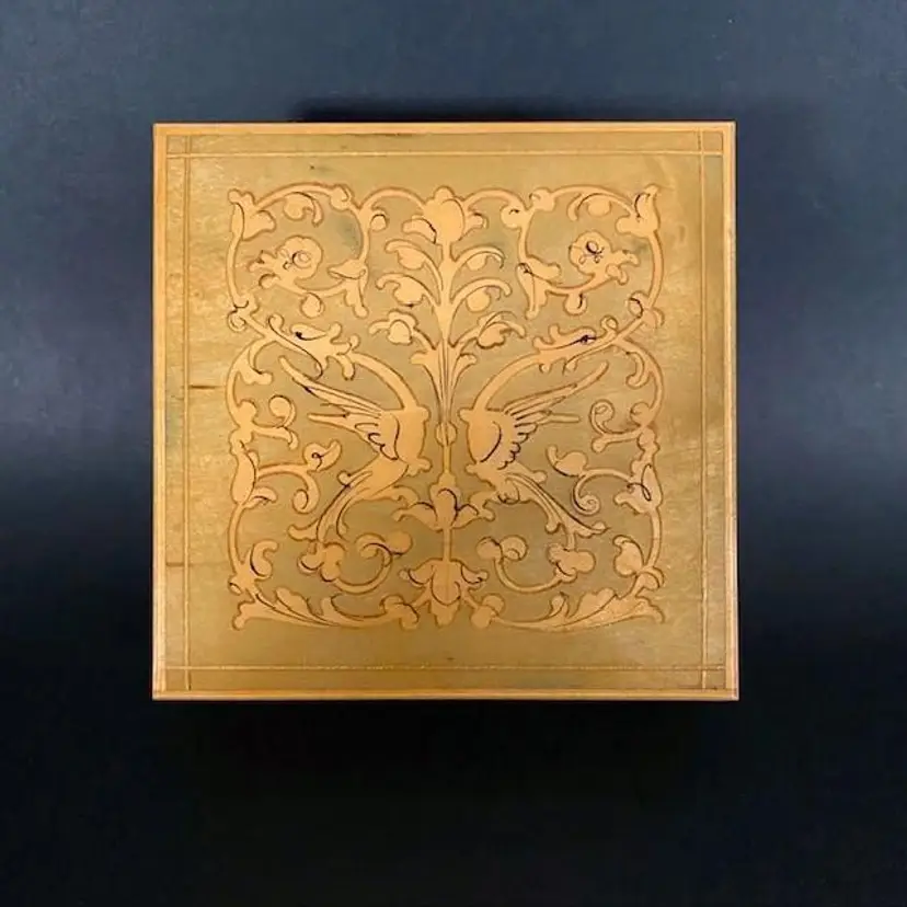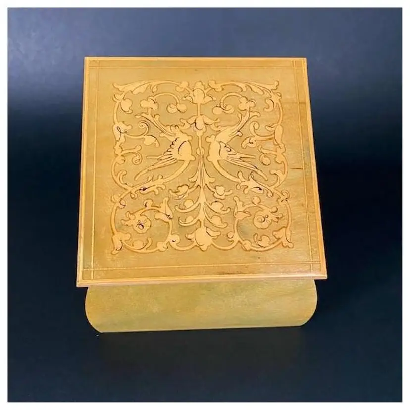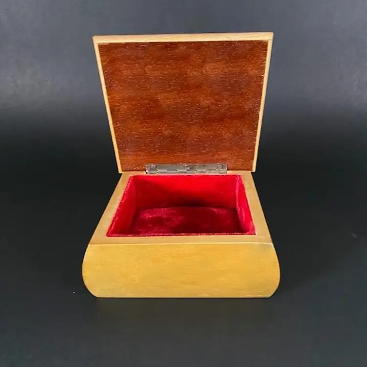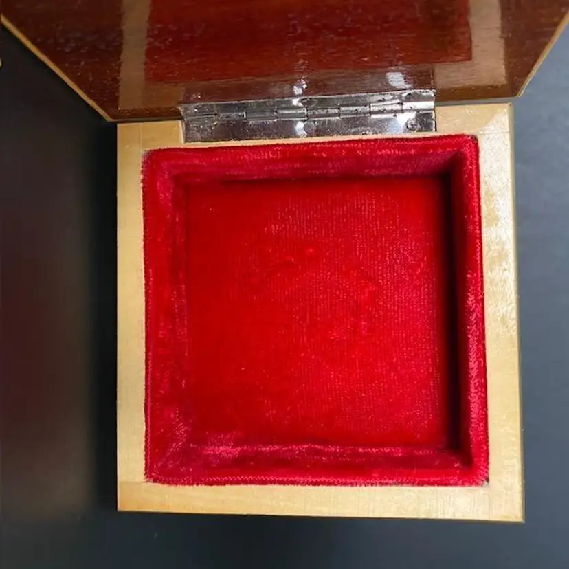 This vintage handmade trinket box features a hinged lid and is perfect for storing small accessories such as rings, earrings, cuff links, etc. The box is beautifully lacquered and lined with soft red velvet. The intricate design and attention to detail make it a perfect addition to any collection. There are dragon-like images in the pattern. No chips or dings. In good pre-owned condition. Measures: 4" x 4" x 1.5"