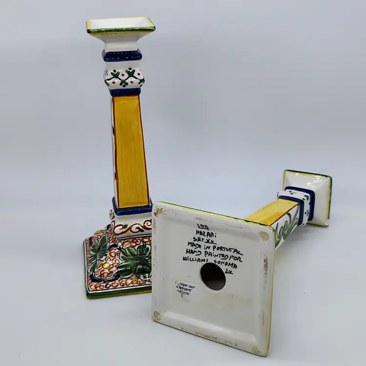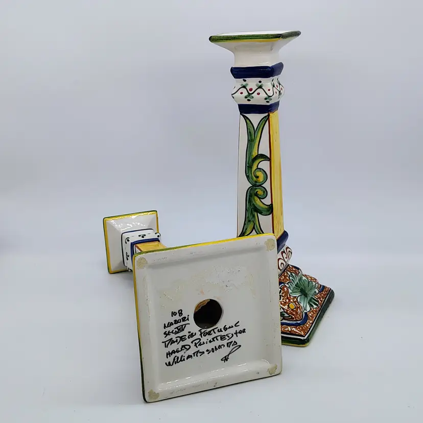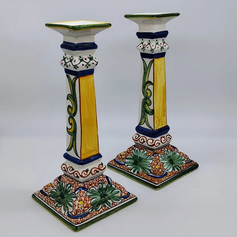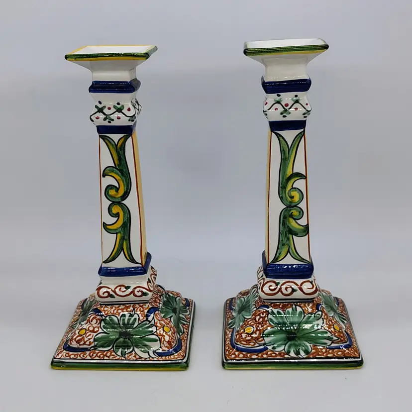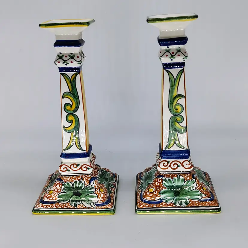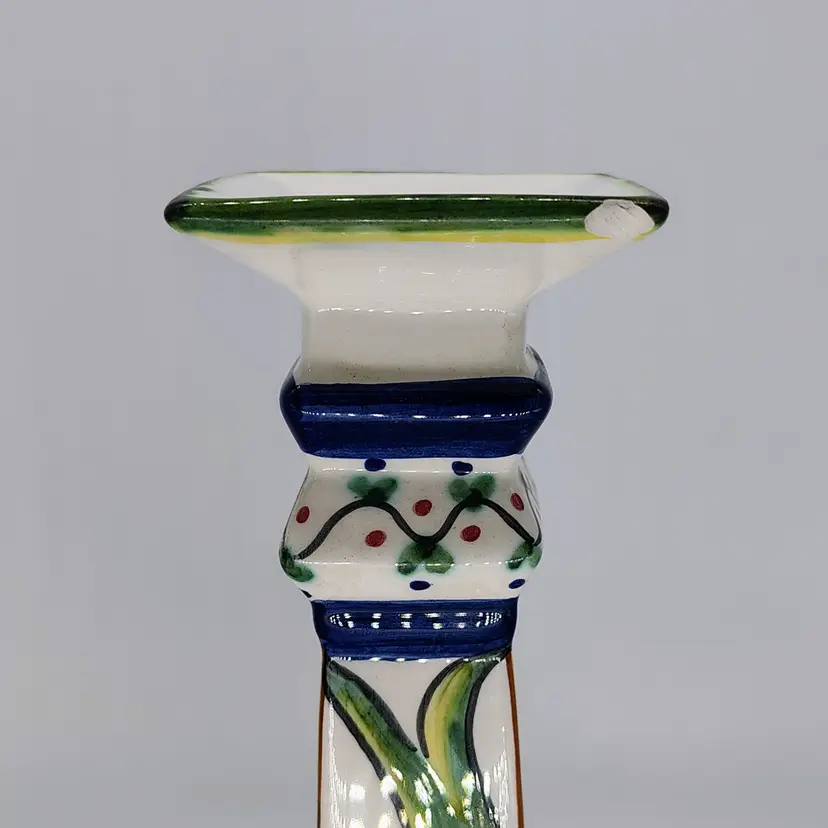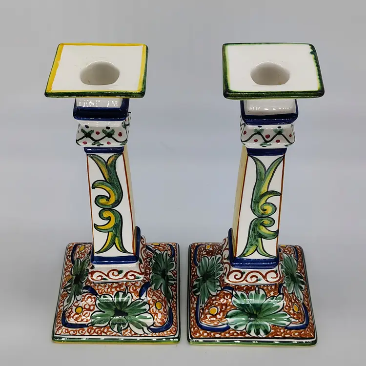 Made and handpainted in Italy. One flea bite chip noted on top rim of one candlestick as noted in pictures