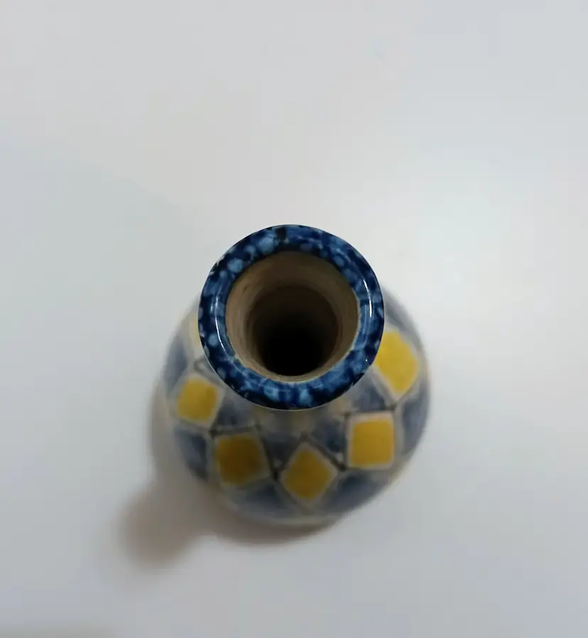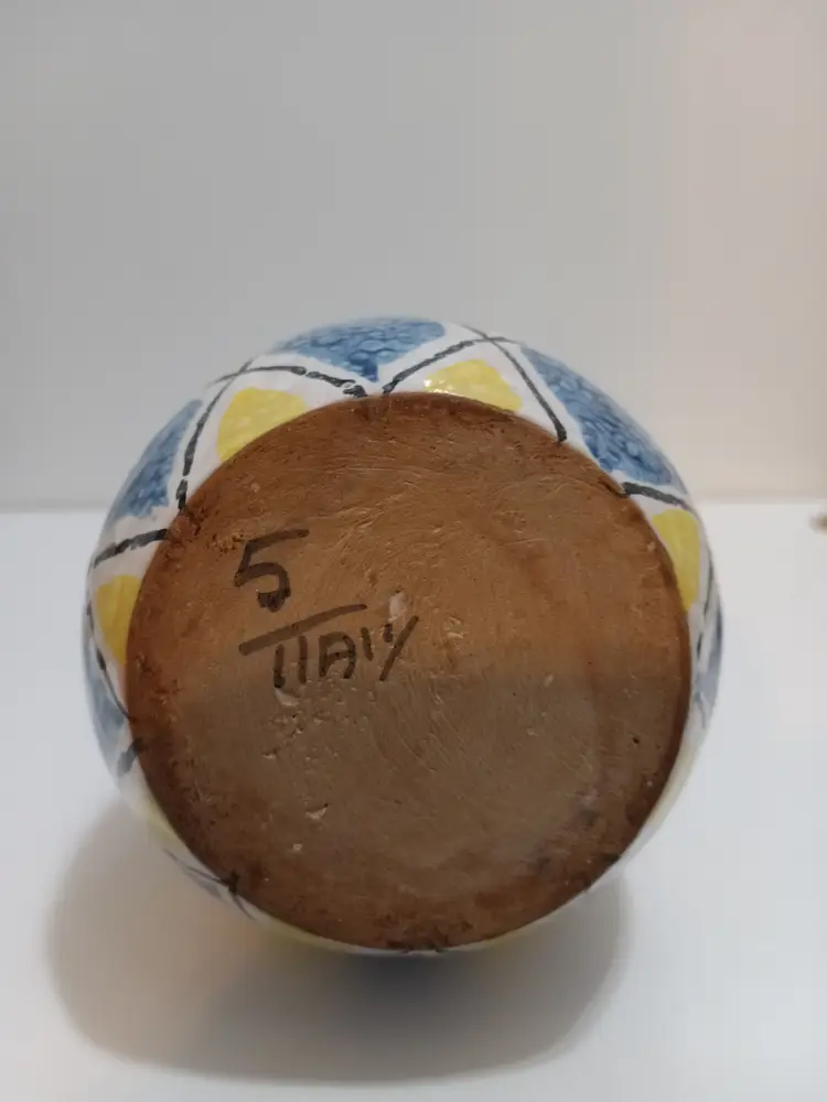 Vintage Italian Ceramic Vase Features Tri Colored Yellow, White,& Blue Harlequin Pattern; MCM Style; Beautiful Simplistic Form; Excellent Used Condition; No Chips or Cracks or Scuffs; 9.5" T x 3 7/8" W x 3 " Bottom; 1" Opening; Marked Italy 5