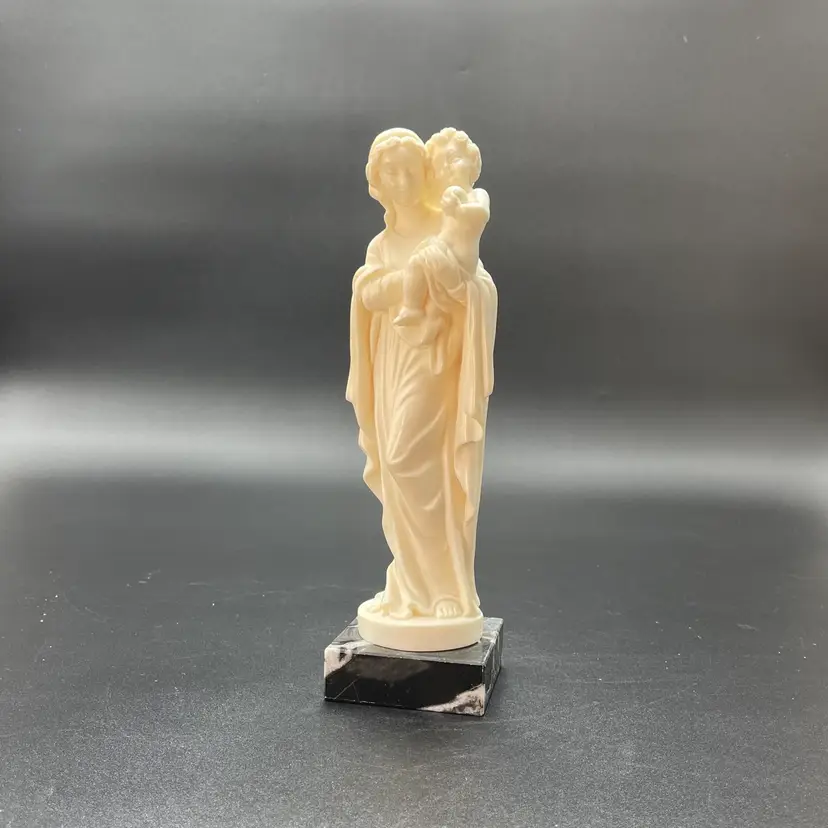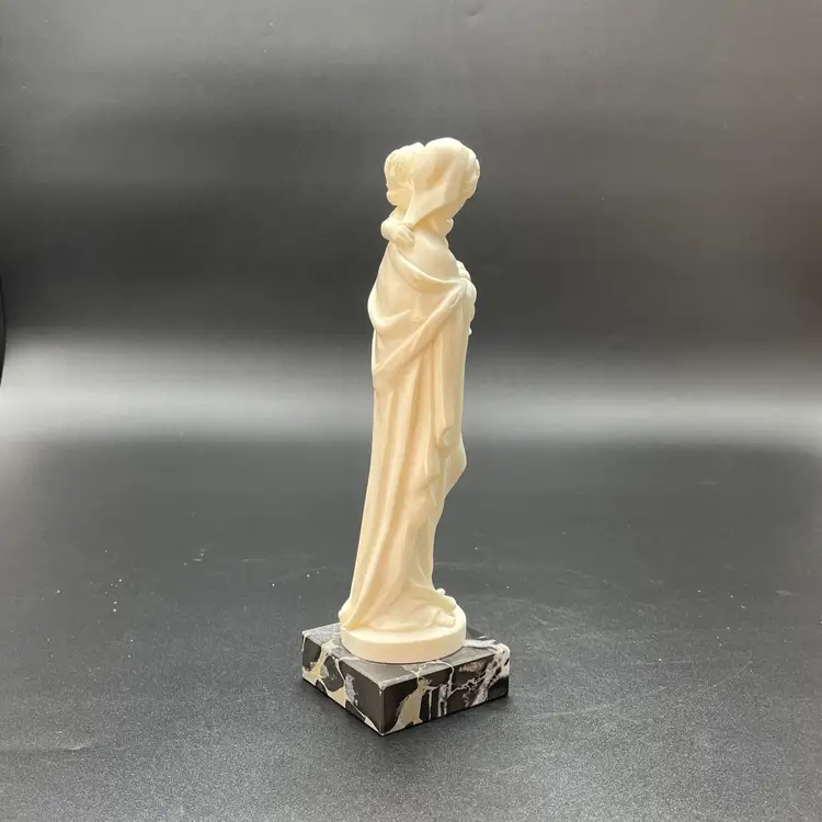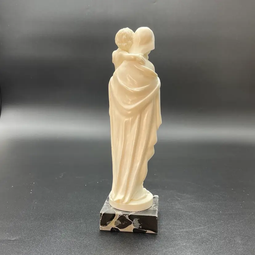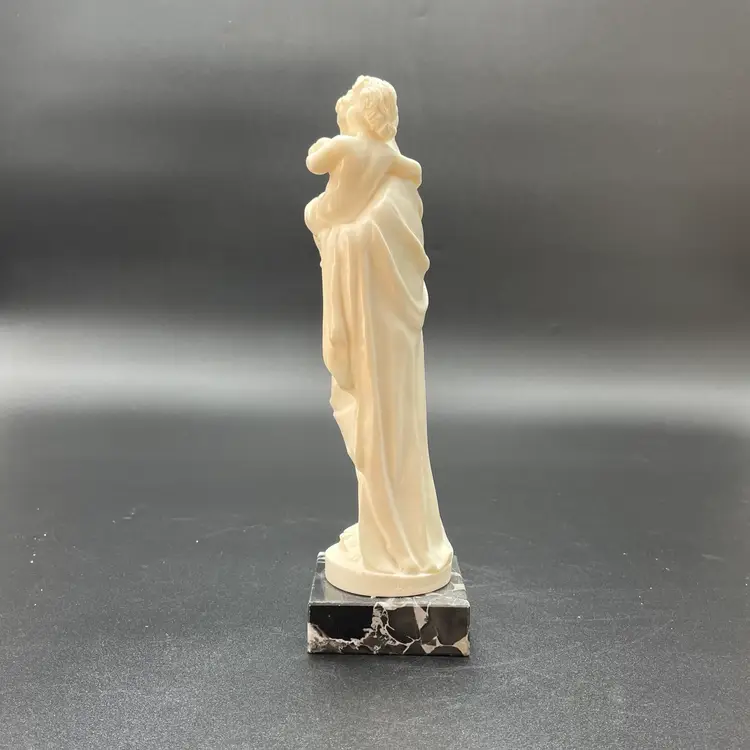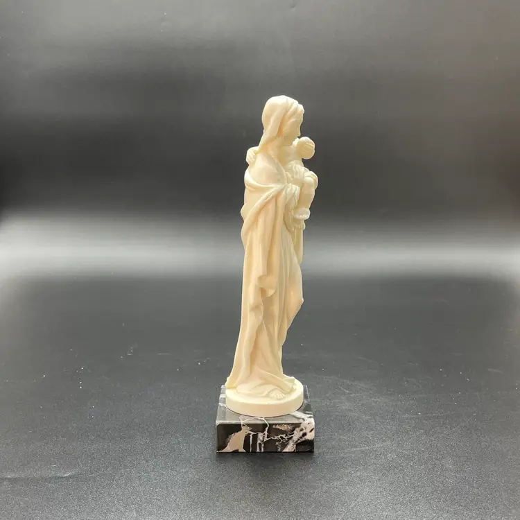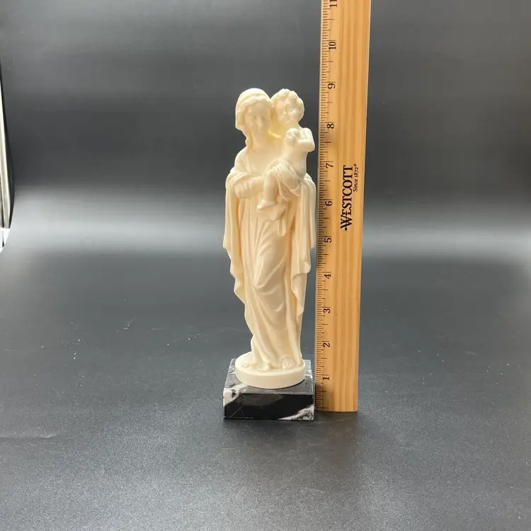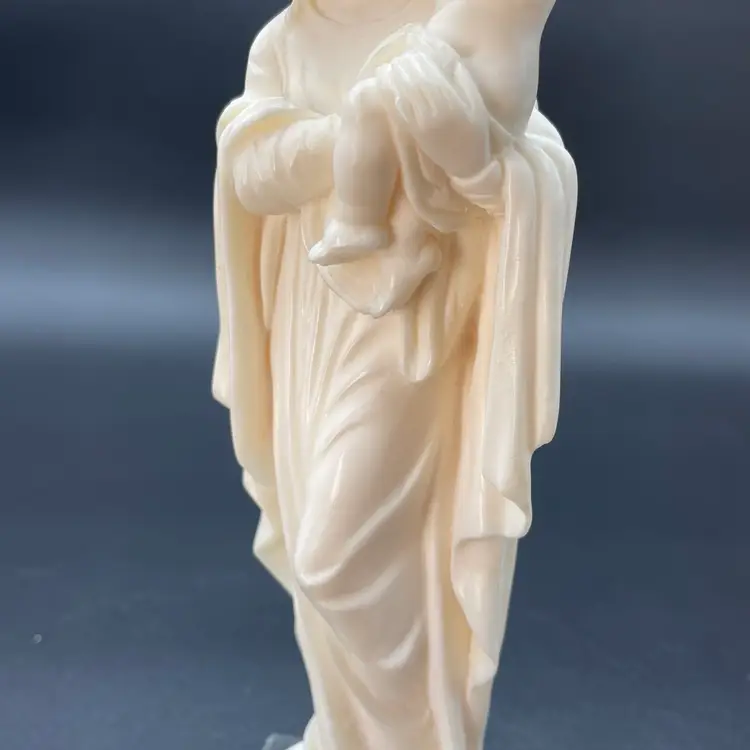This is Mother Mary and baby Jesus figurine sculpted by G. Ruggeri. Gino Ruggeri developed a method of mixing alabaster with resin to make it more durable and waterproof. This statue is a good example of the technique. Measures approximately 8.75” tall x 2.5" x 2.5". No chips or cracks.