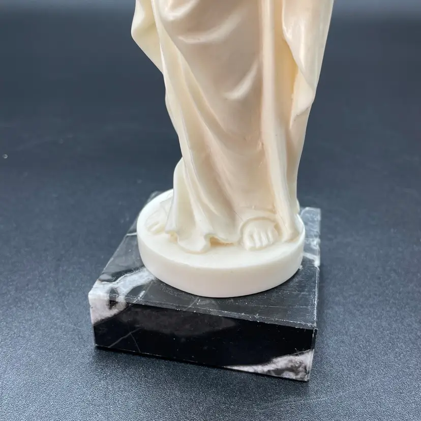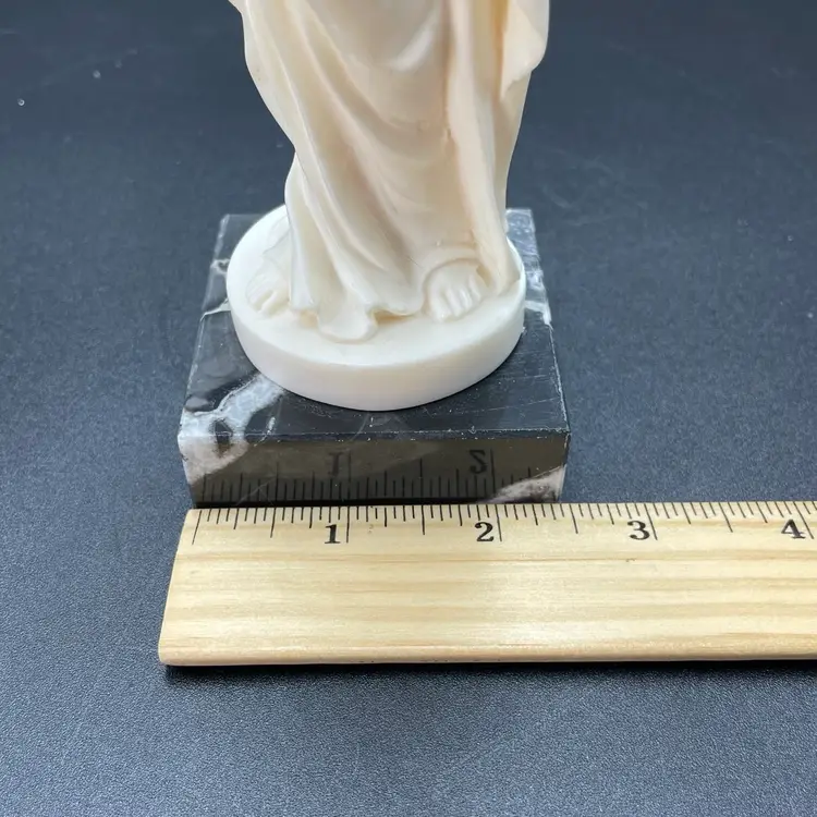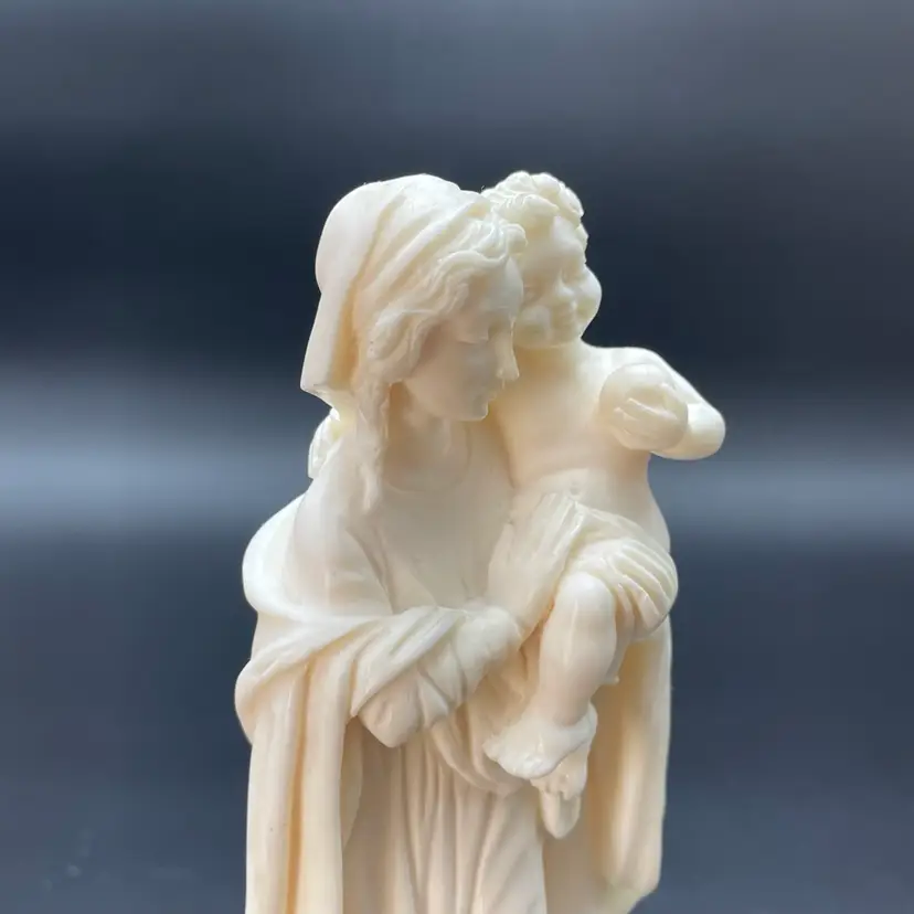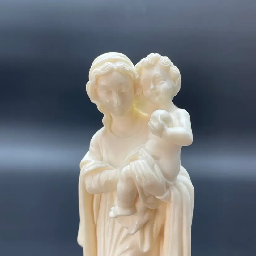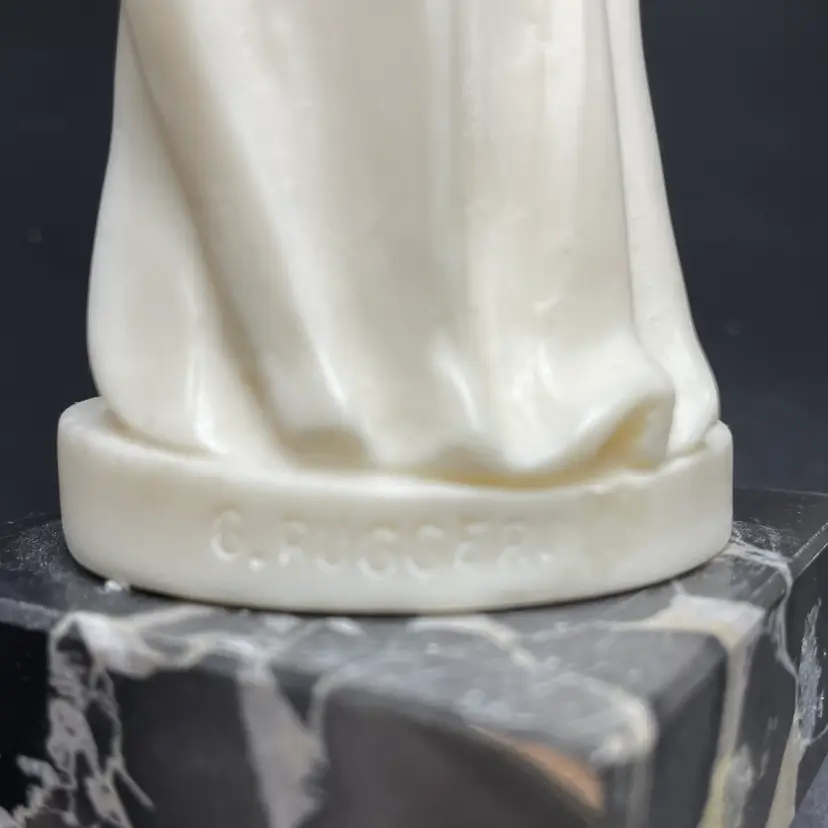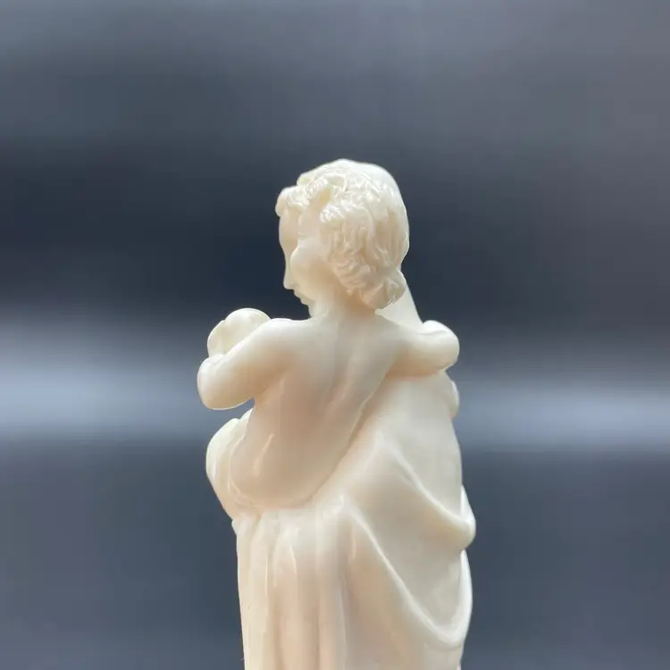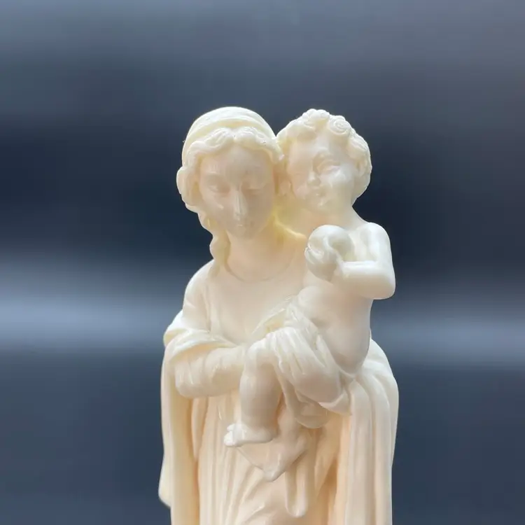 This is Mother Mary and baby Jesus figurine sculpted by G. Ruggeri. Gino Ruggeri developed a method of mixing alabaster with resin to make it more durable and waterproof. This statue is a good example of the technique. Measures approximately 8.75” tall x 2.5" x 2.5". No chips or cracks.