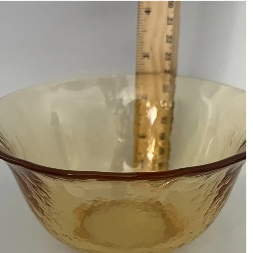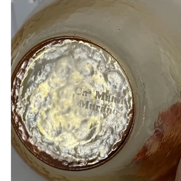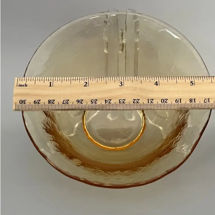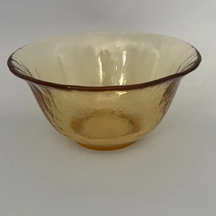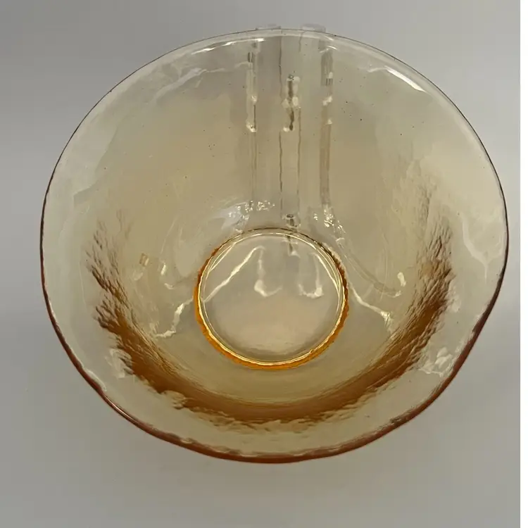 The is a true Murano glass bowl, dating back to the mid-20th century. Murano glass is renowned for its vibrant colors, intricate designs, and high-quality craftsmanship, originating from the island of Murano, Italy. This particular bowl features a textured surface and a warm amber hue, possibly achieved by adding uranium to the glass before melting. The color and texture suggests it is a piece from the 1950s or 1960s, a period when textured glass and warm colors were popular. The bowl's size and shape make it perfect to be used as a serving dish or decorative item.