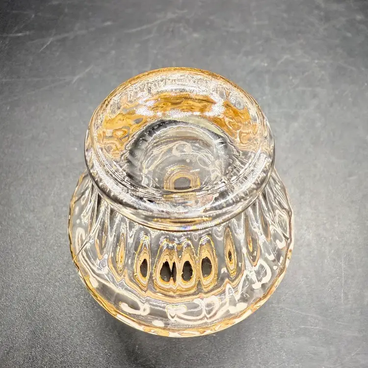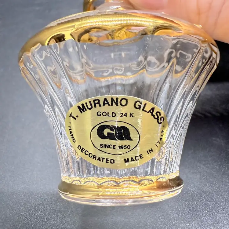 Italian "Murano" Florentine Glass Perfume Bottle Hand Decorated 24 Karat Gold. The colored stripes on the stopper alternate gold and silver. Not sure it if was actually made on the island of Murano. Labeled T. Murano Glass GM since 1950. No chips or cracks. Signs of light wear and use - there is some scuffing to the gold and some places where it has been rubbed off. Please see pictures.