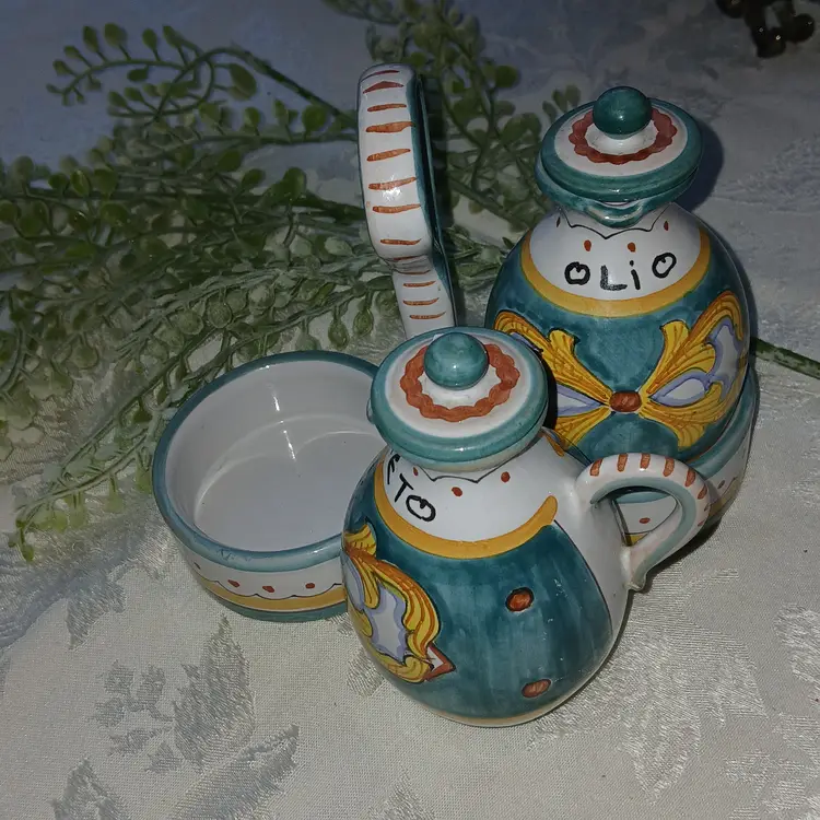 Hand painted from Deruta, Italy. Beautiful colors oil and vinegar set with matching caddy