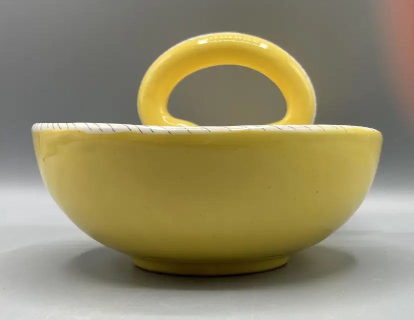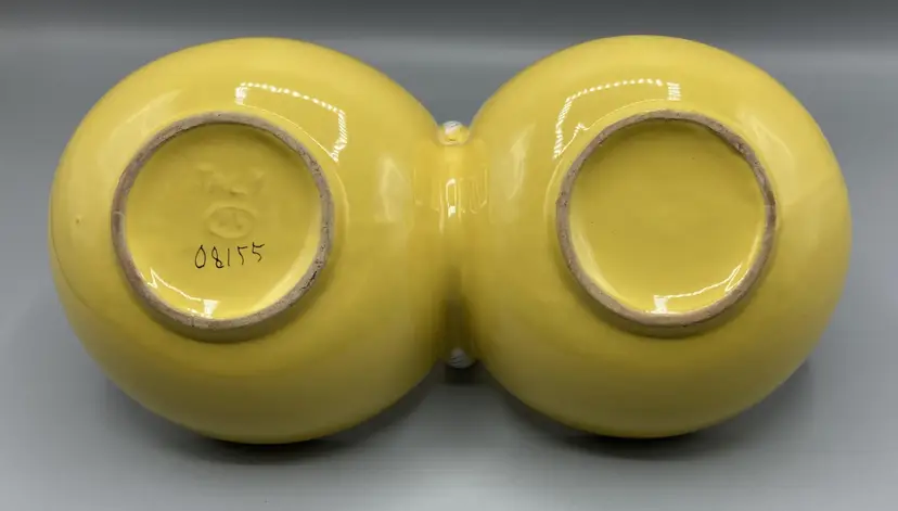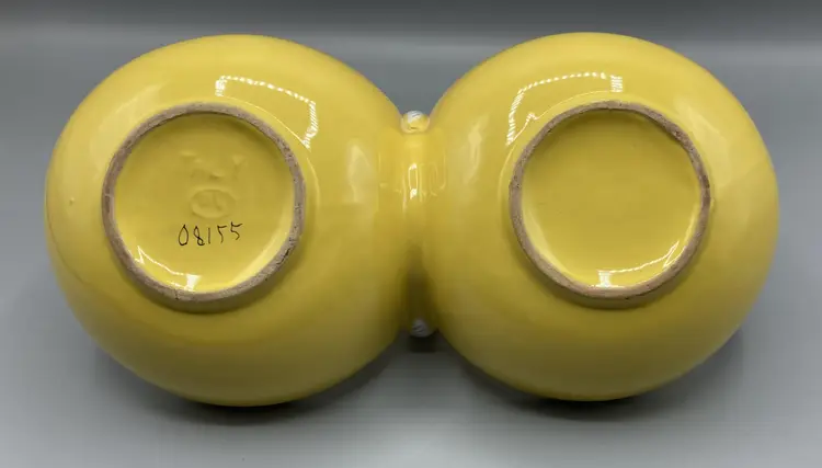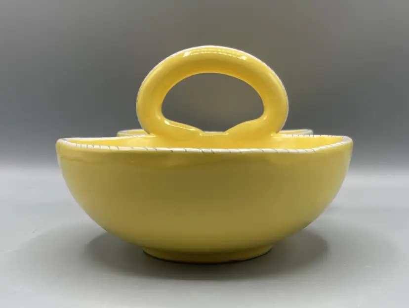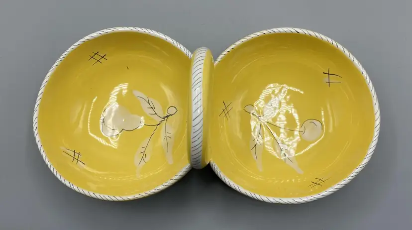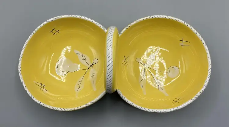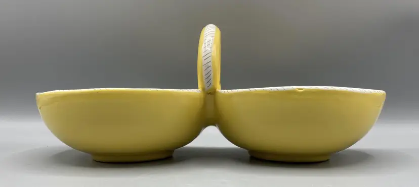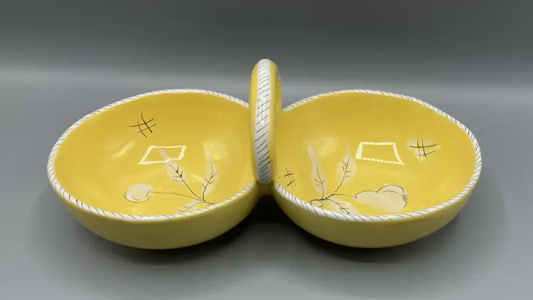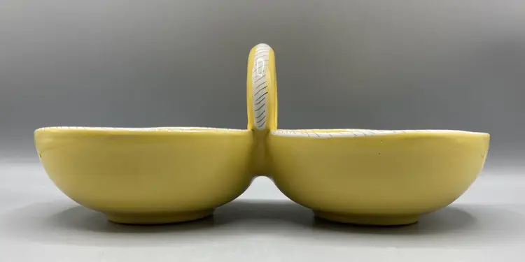 This double bowl is in good vintage condition. This bowl measures approximately 10" long x 5 1/4" wide by 4" tall.