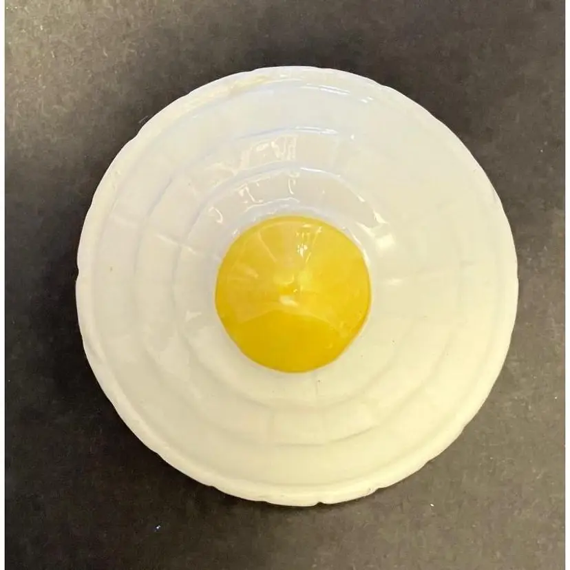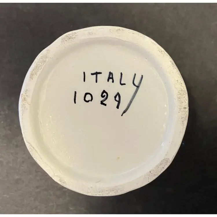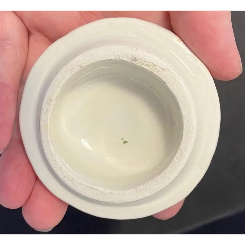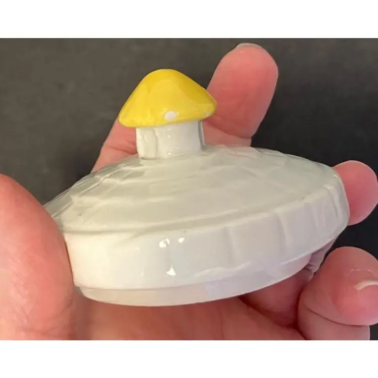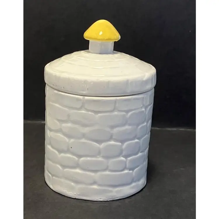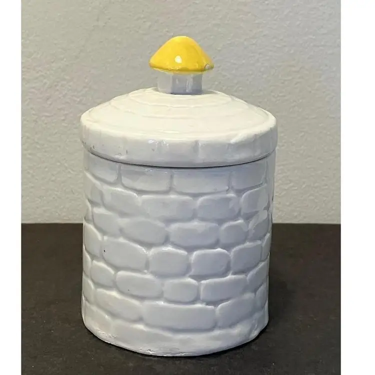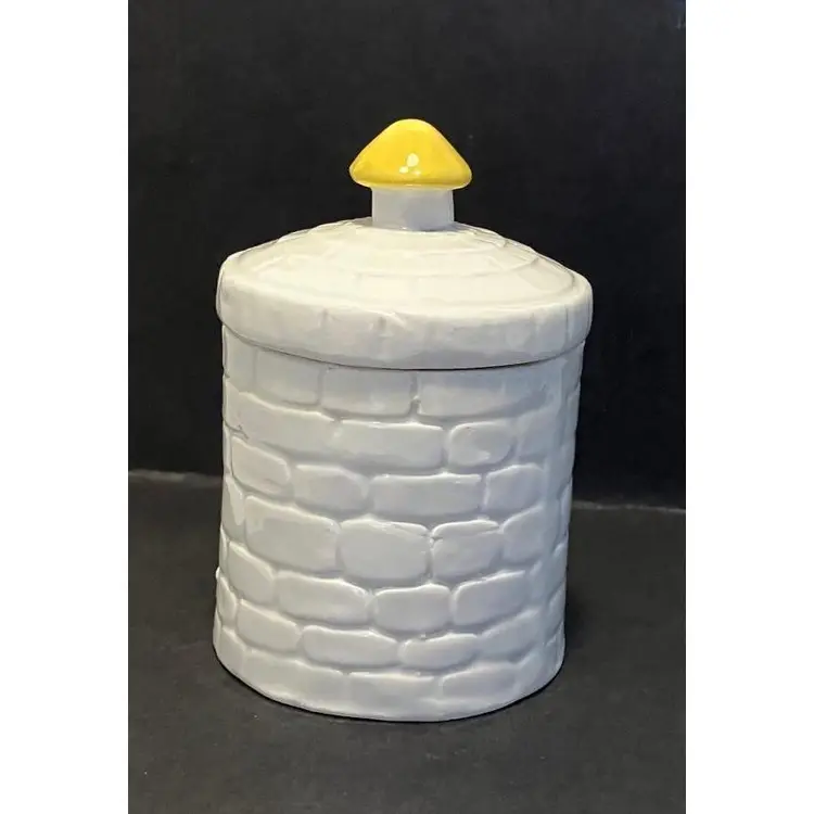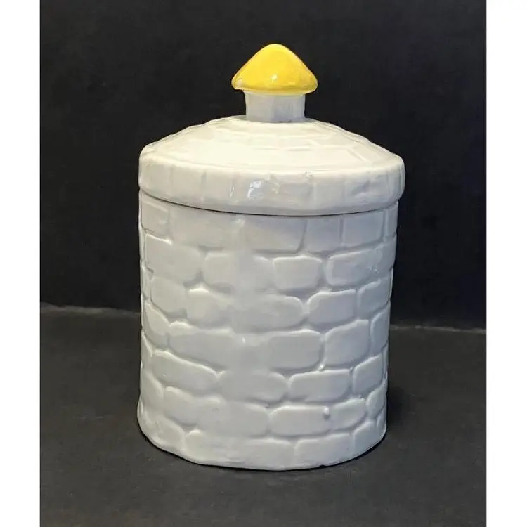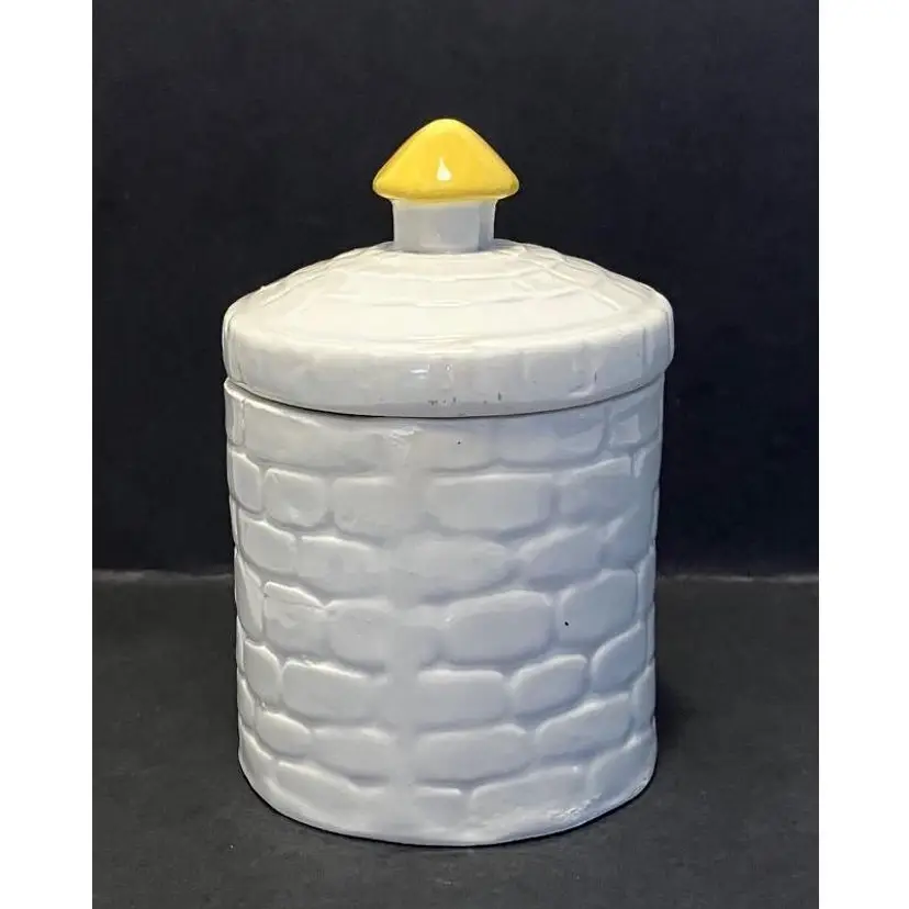 Beautifully made Porcelain/Ceramic covered container. There is a brick design on the outside and a roof-tiled design on the cover. The top handle of the top is yellow and resembles a mushroom shape. There is a chip in the paint of the side of the yellow handle (please all of the pictures). There are no chips or cracks to the container itself. Measures about 4" tall and 2 1/2" at the base.