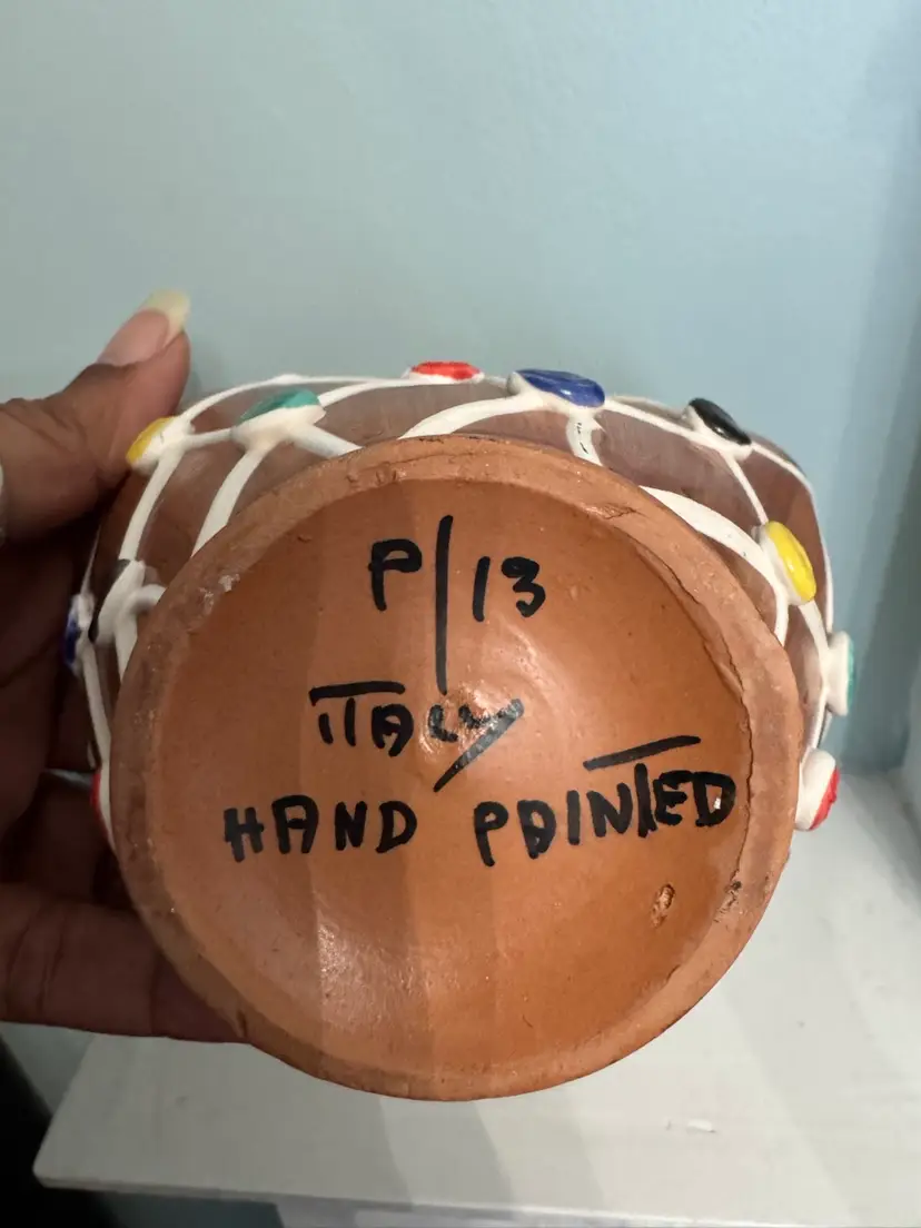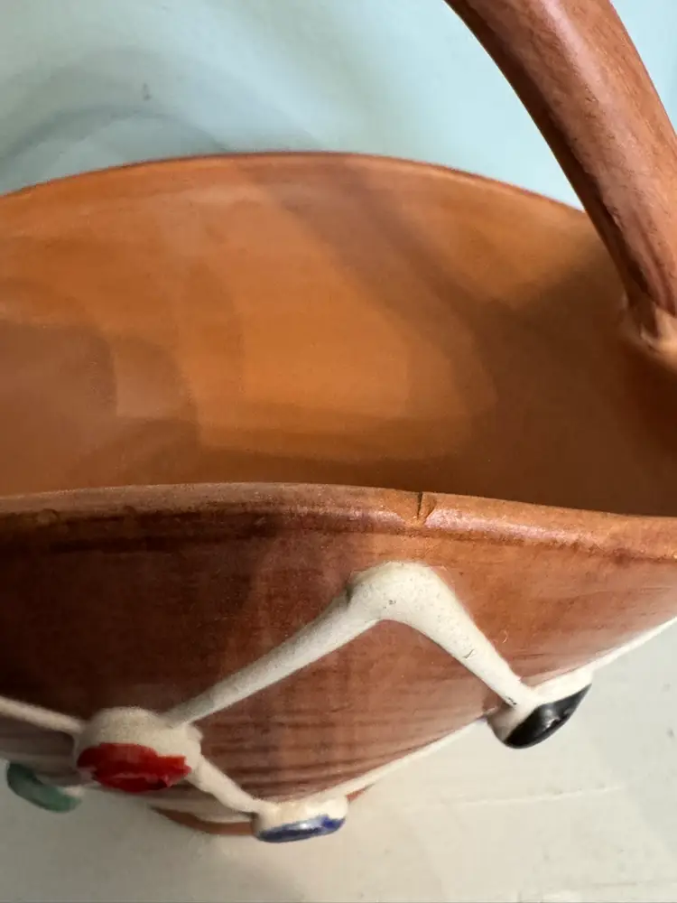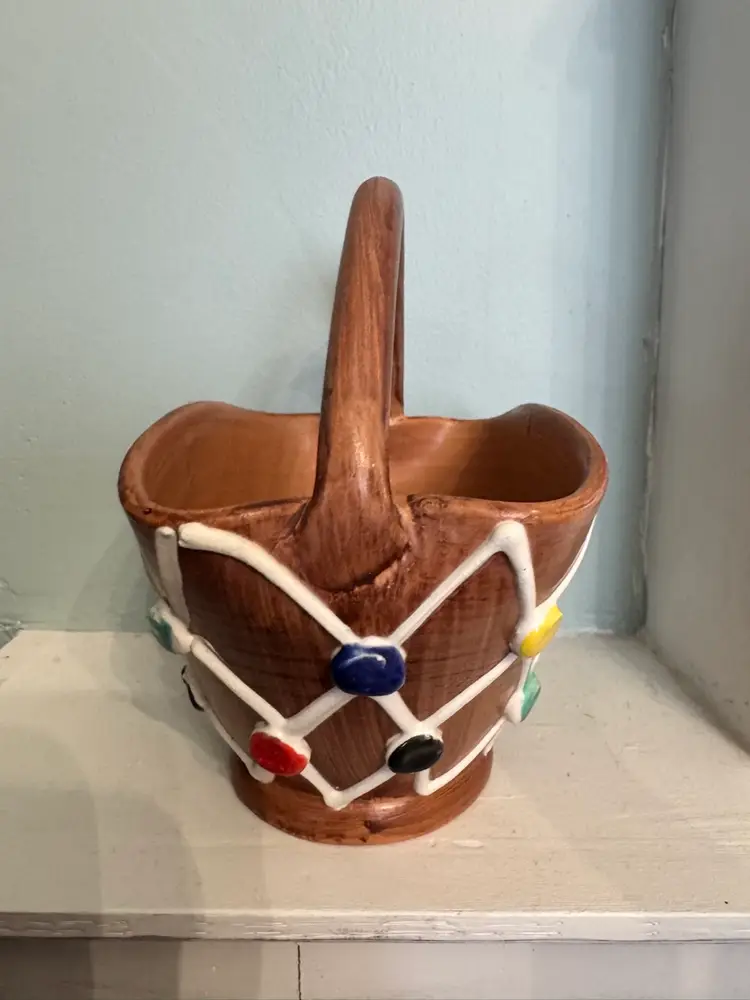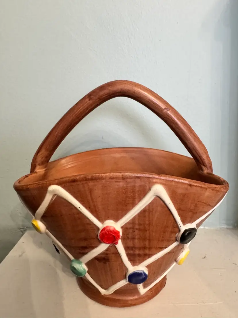 Charming vintage Italian pottery basket marked, made in Italy hand-painted p/13. This ceramic piece features a warm terracotta tone glaze with a raised white lattice design with colourful dots. Perfect as a planter or decorative accent. Note chip in photo. Approximately 5.5” x 5.5”