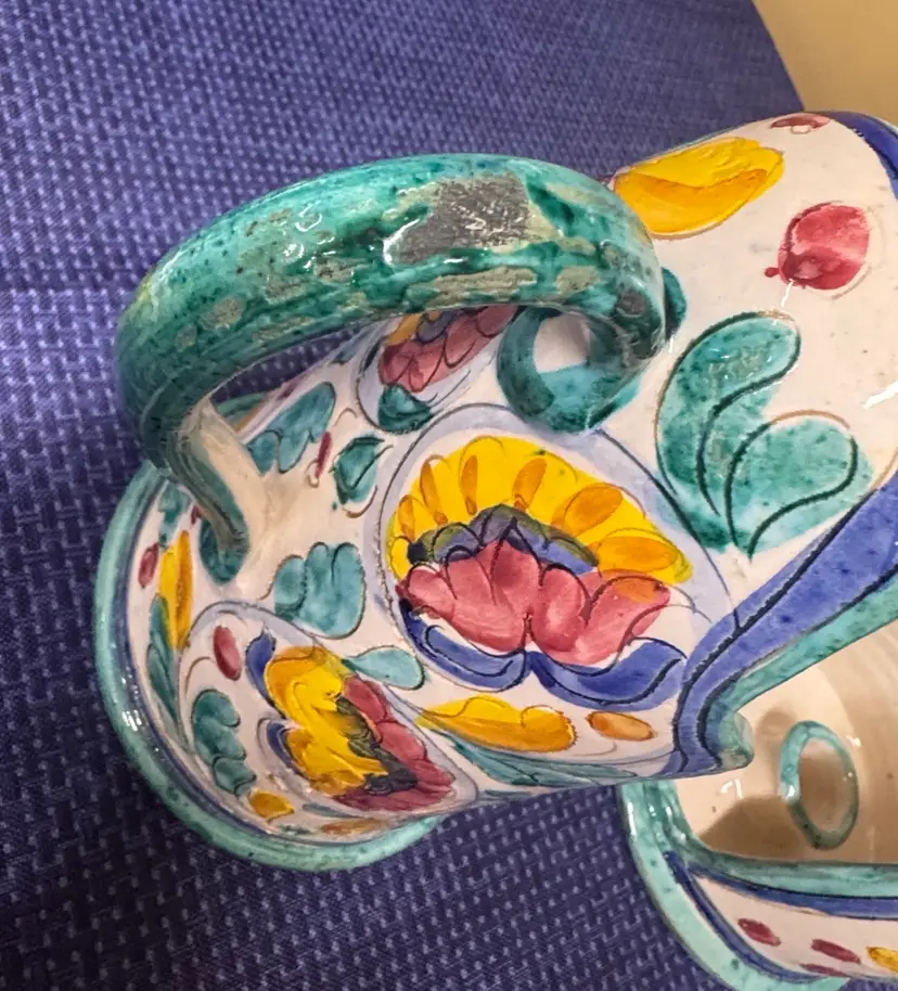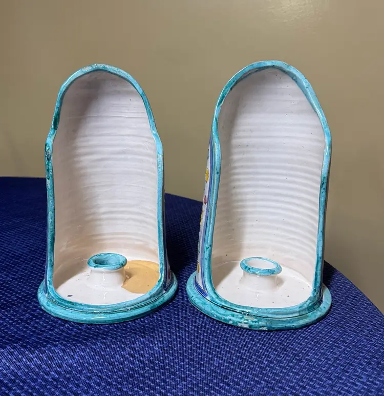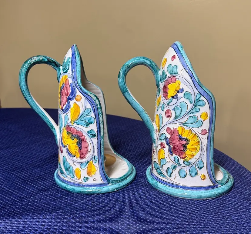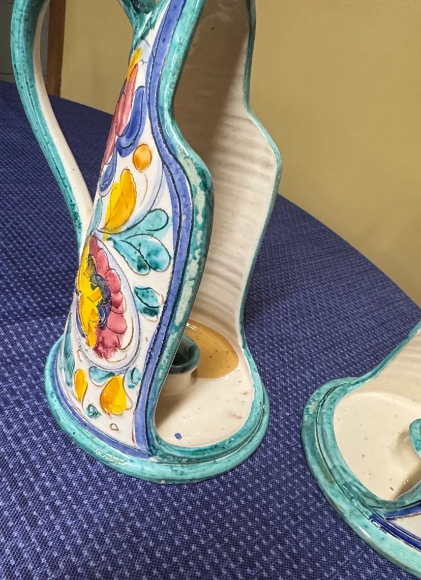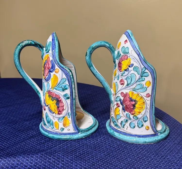 Add a touch of elegance to your home with this hand-painted floral ceramic set of Italian pottery candle holders with handles signed Italy 4059 8.5” tall Featuring vibrant yellow and blue hues, perfect for any decor. Excellent condition there is some age wear that I tried to photograph but no actual chips or breaks (11461022255)
