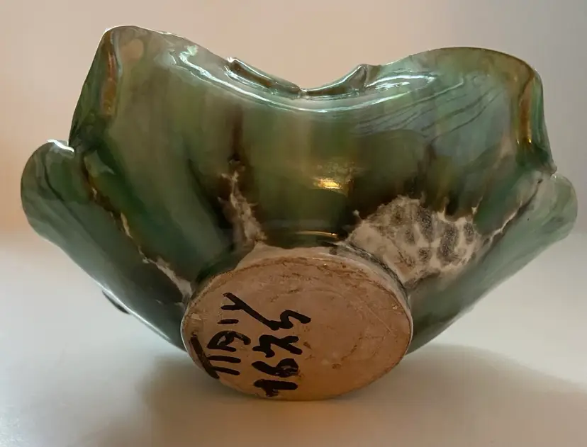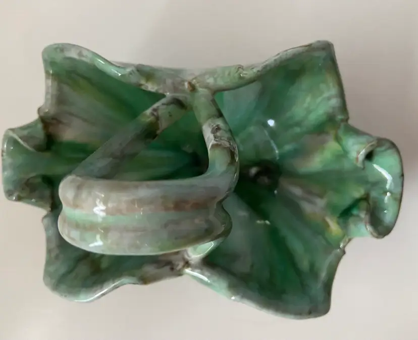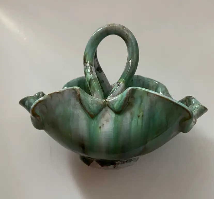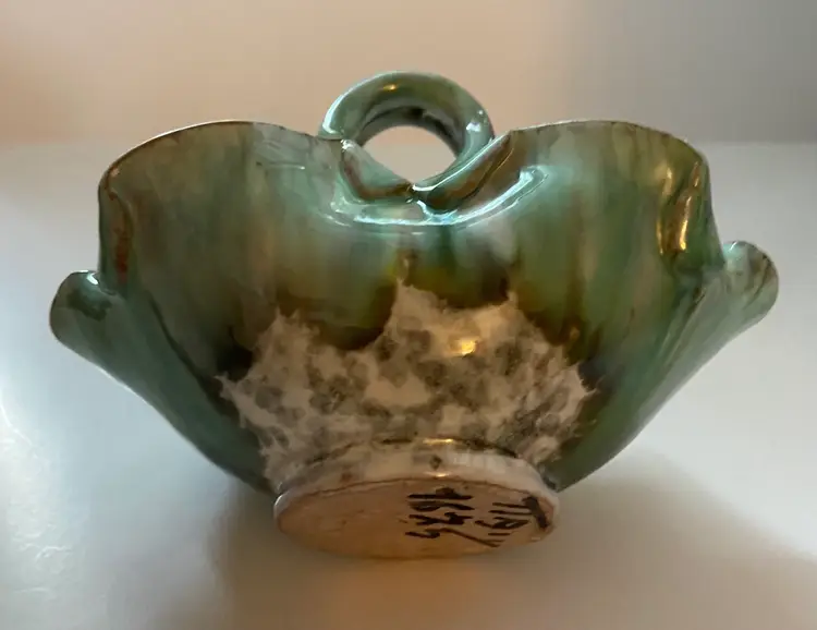 Beautifully glazed flower bowl with handles in blue, white and gray. Bowl is marked Italy and is in excellent condition with no chips or cracks. This would be a great piece for the dresser to keep track of rings or jewelry.
