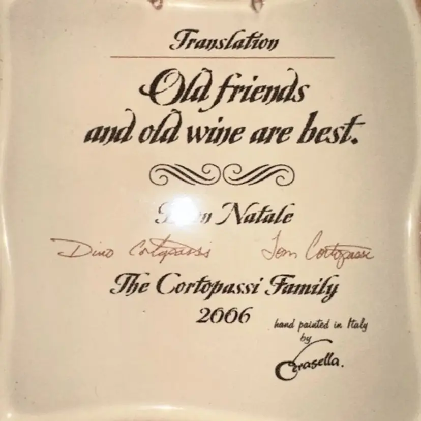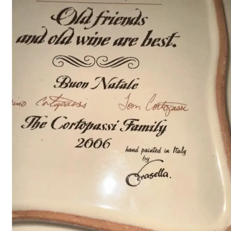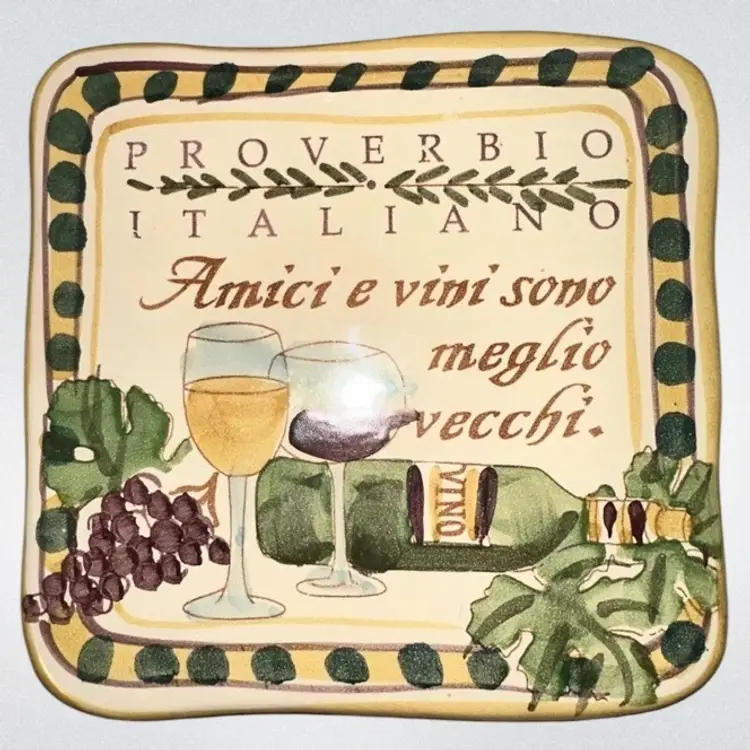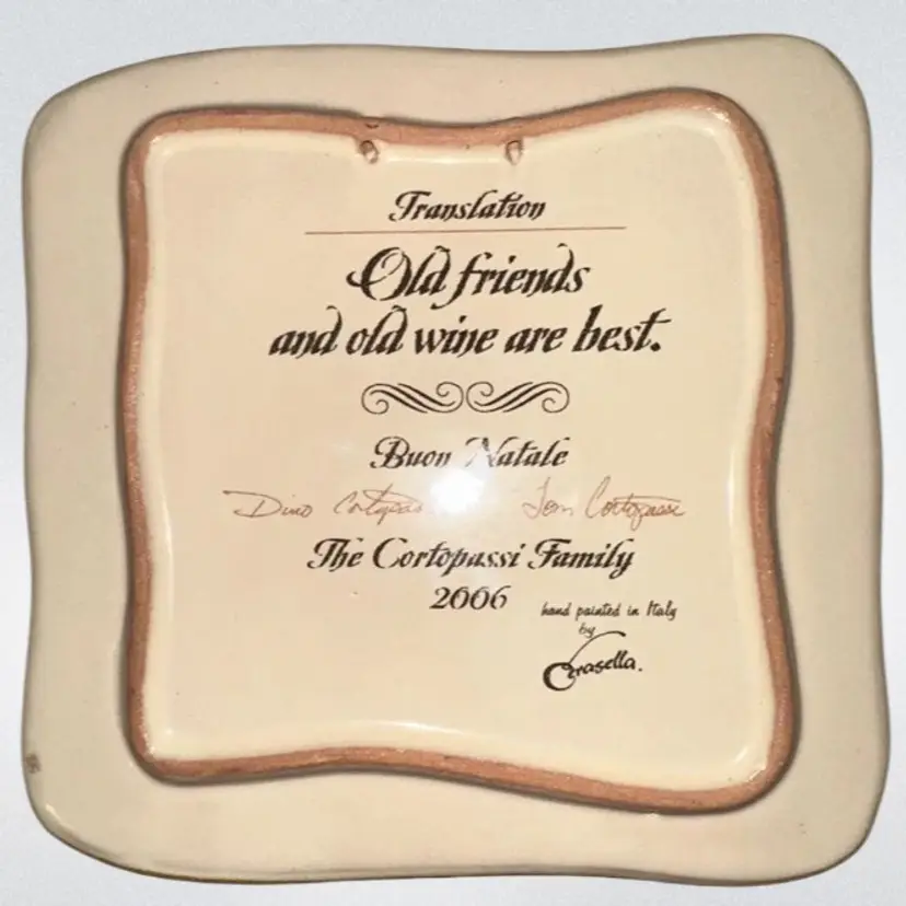 Italian Tile 2006 The Cortopassi Family Hand Painted Italy Needs hanger Proverbio Italiano “Amici e vini sono meglio vecchi” translates to “ old friends, and all the wine are the best”. Artist signed 6 1/2” x 6 3/4” One little manufacturers defect on backside looks like a chip but is actually glazed over