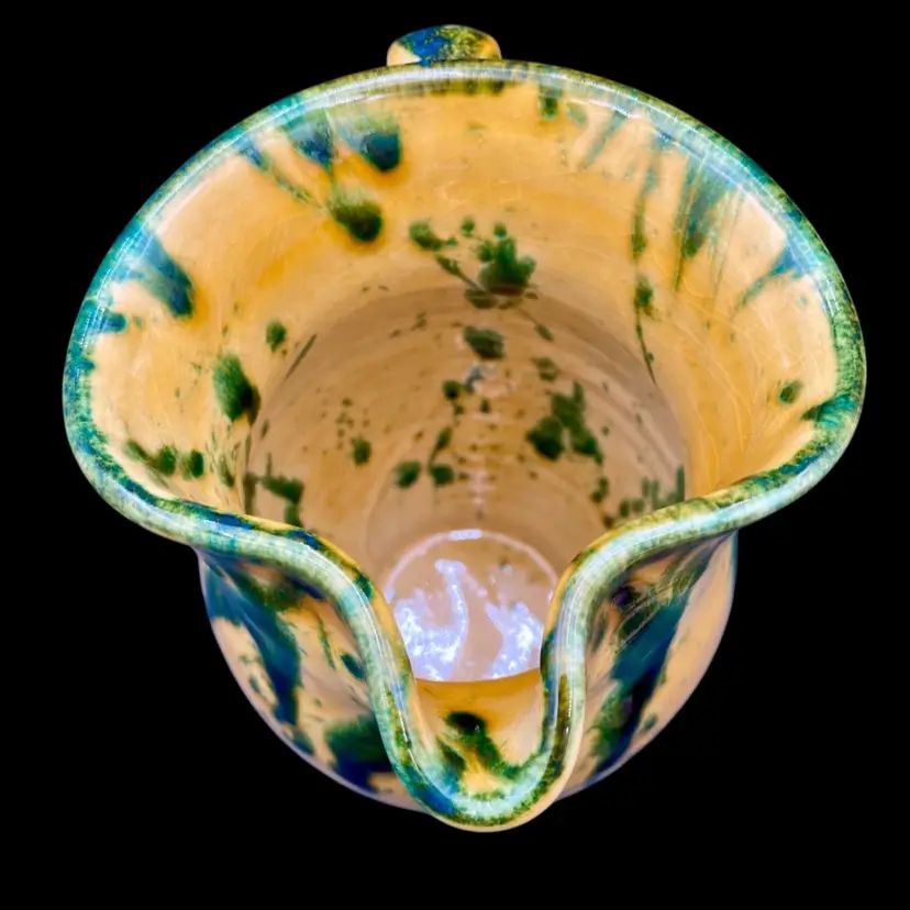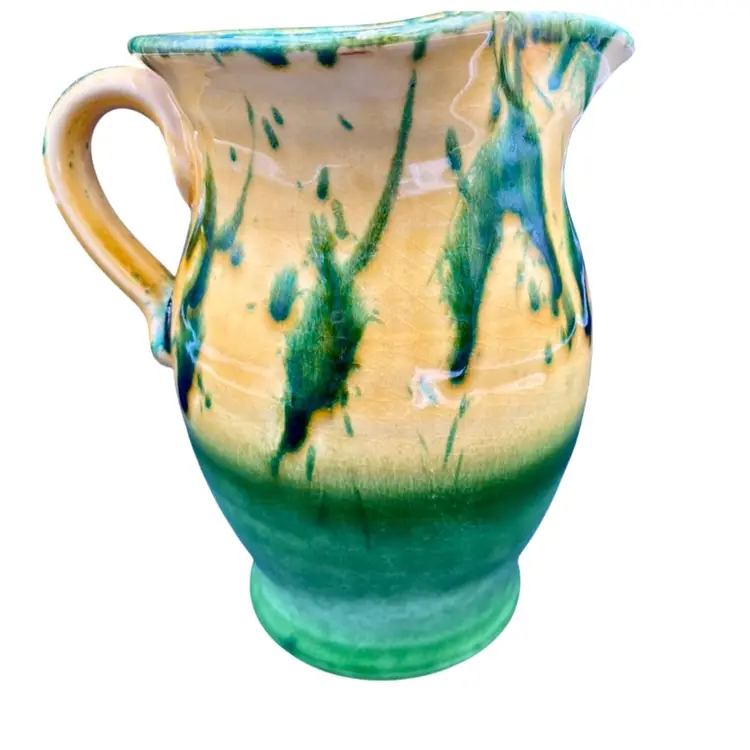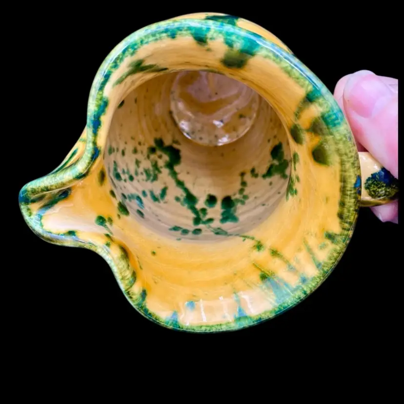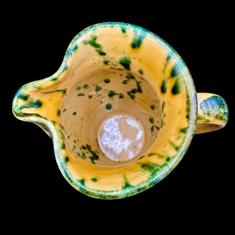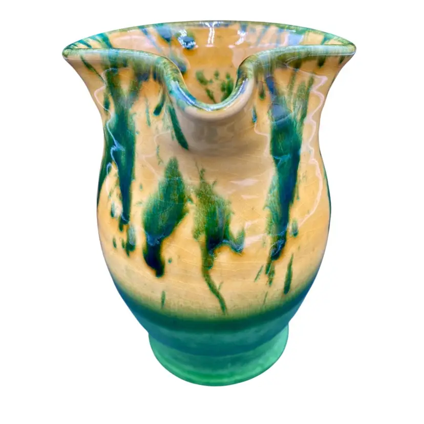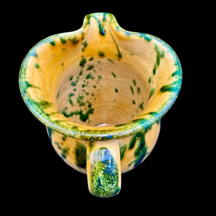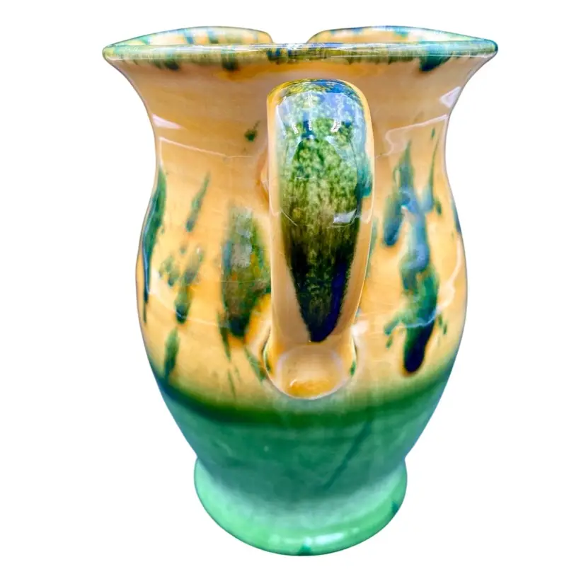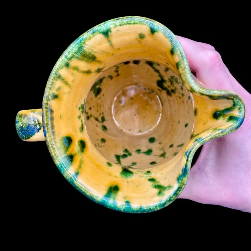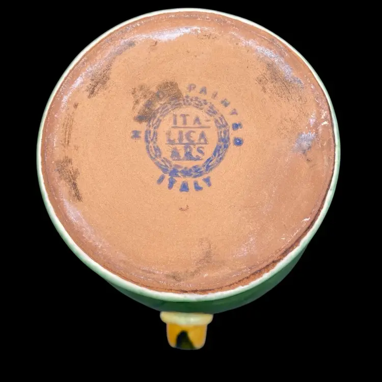This beautiful Italica Ars pitcher/vase is a hand-painted terracotta piece made in Italy. The unique green drip pattern on the yellow both outside and in gives it an abstract and artistic look, with the same shades of green mirrored on the base of the piece. With a height of 7 inches and a width of 6 inches, it can be used as a decorative vase or as a functional pitcher. The vintage item is an original piece from Italica Ars and weighs 1 pound and 13.7 ounces. The backstamp is printed, indicating its authenticity. The glossy finish adds to its charm, making it a perfect addition to any pottery collection.