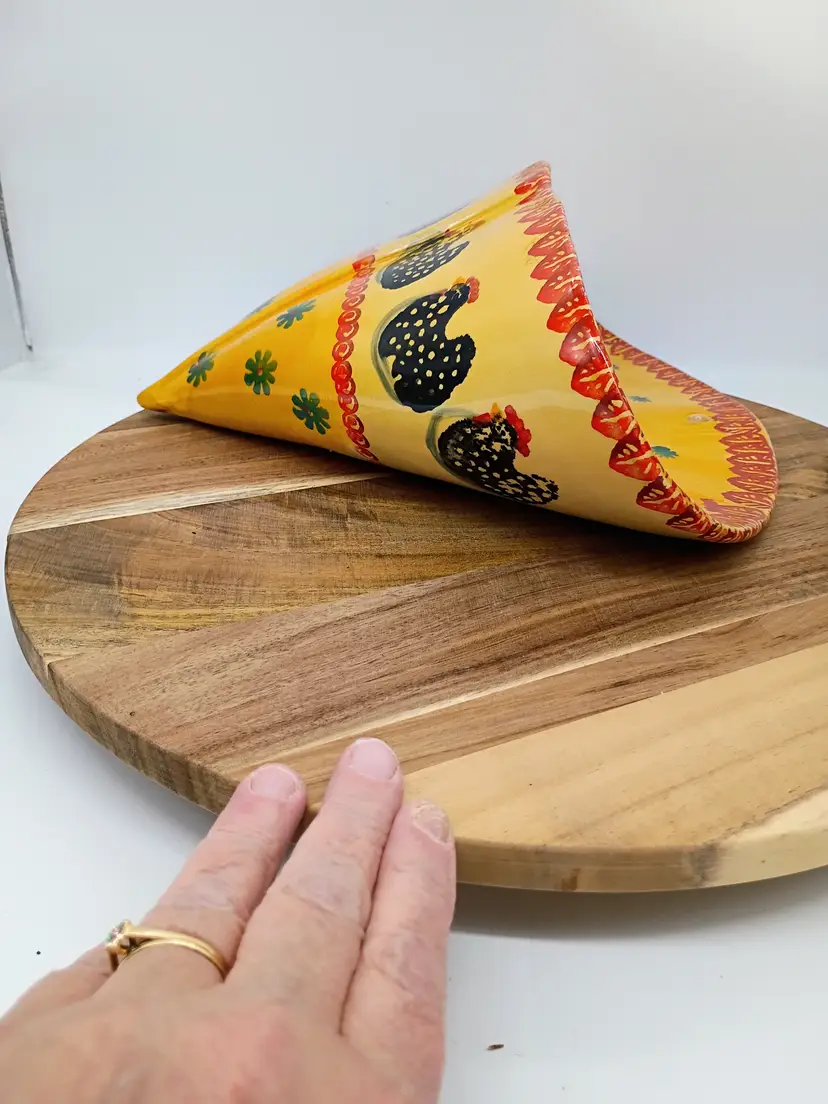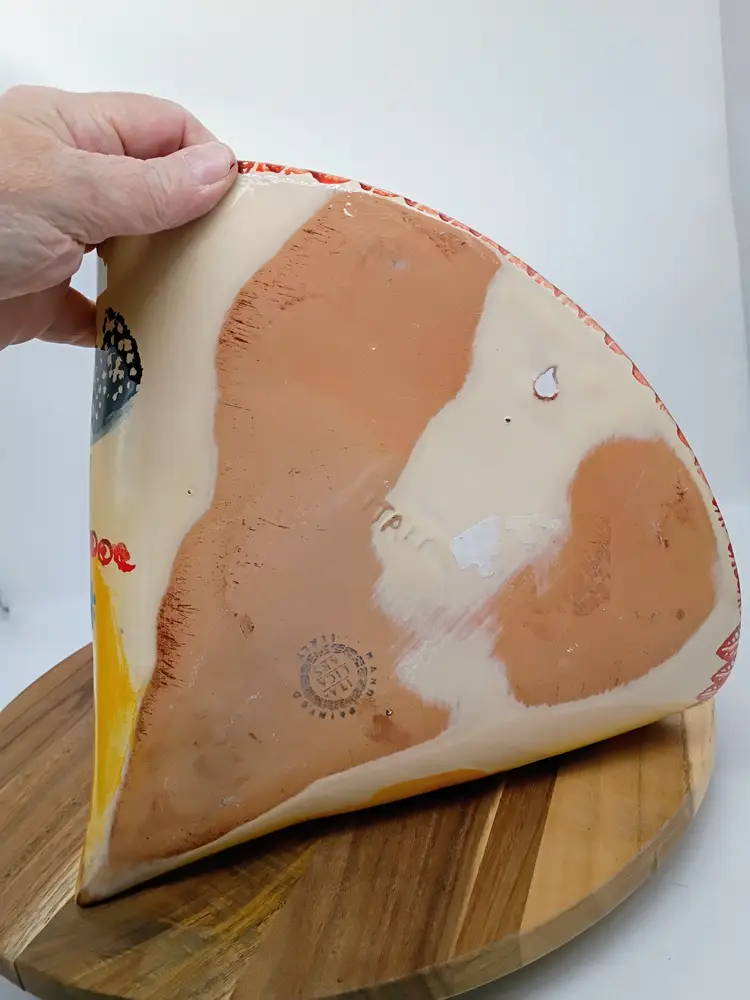 Italica ARS Wall Pocket Chickens & Flowers Art Pottery Italy Hand Painted. Circa 2000-2009. This is 11.5 inches tall 12 inches long and will project 6 inches out from wall. Terra Cotta. This is preowned but looks like it was never used. No interior stains, no chips cracks or flea bites, Excellent condition. Ships USPS