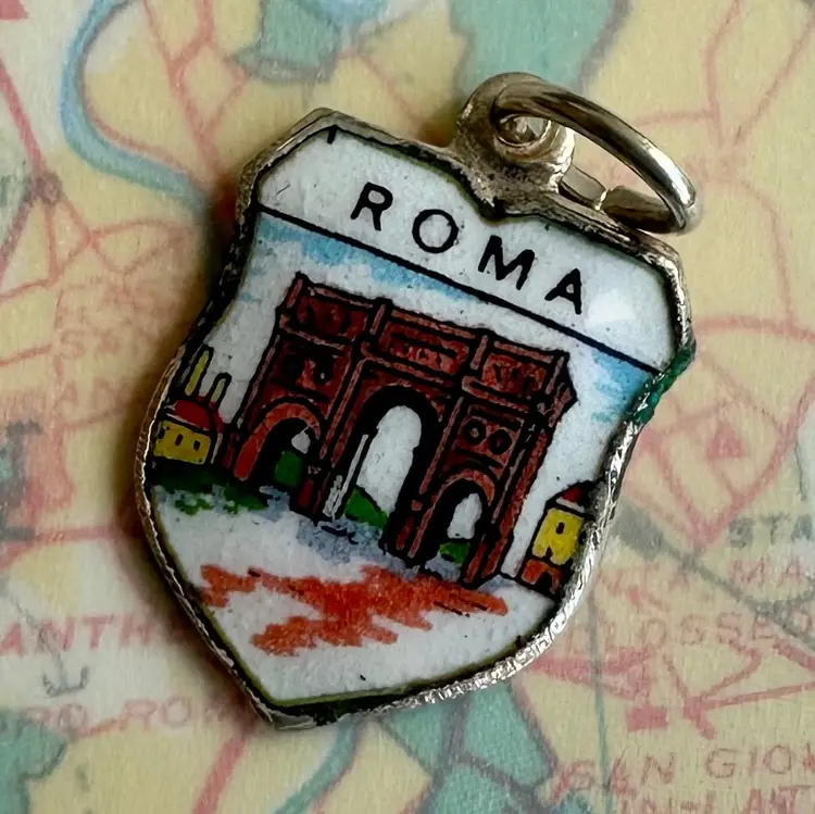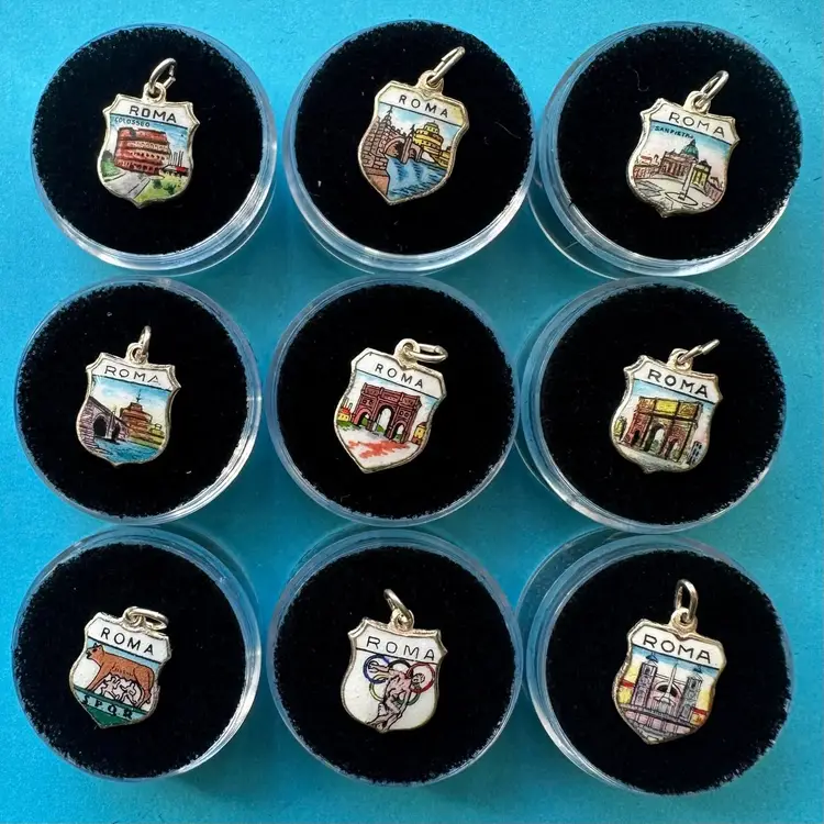TRAVEL SHIELD CHARMS Vintage Enamel Souvenir Travel Shield Bracelet Charms Vintage Shield Charms were made in the 1950’s-1970’s in Germany. (Manufactured until 1976). Shield Charms are highly collectible today and look great mixed in with silver charms on souvenir travel charm bracelets. eCharmony.com purchased the "New Old Stock” that sat in storage at the charm factory in Germany for 50 years, and also sells from a personal collection amassed from all over the world for the past 25 years. This collection of vintage travel shield charms includes themes of Travel Locations, Countries, Cities, States, Tourist Attractions, Monuments, Animals, Maps, Flags, Coat of Arms, State Seals, Flowers, Famous People, Boats, etc. Can’t find what you are looking for? We have thousands and thousands of charms available that are not listed for sale yet. If you don't see what you are looking for or are looking for a specific charm or location, feel free to contact us with your wishlist. Sometimes there are several different designs of each place, so we will send photos and you can decide which scene you like best. Send your requests to buy@eCharmony.com