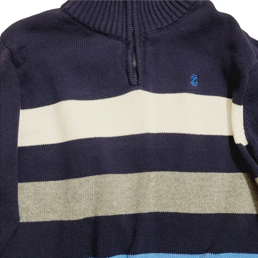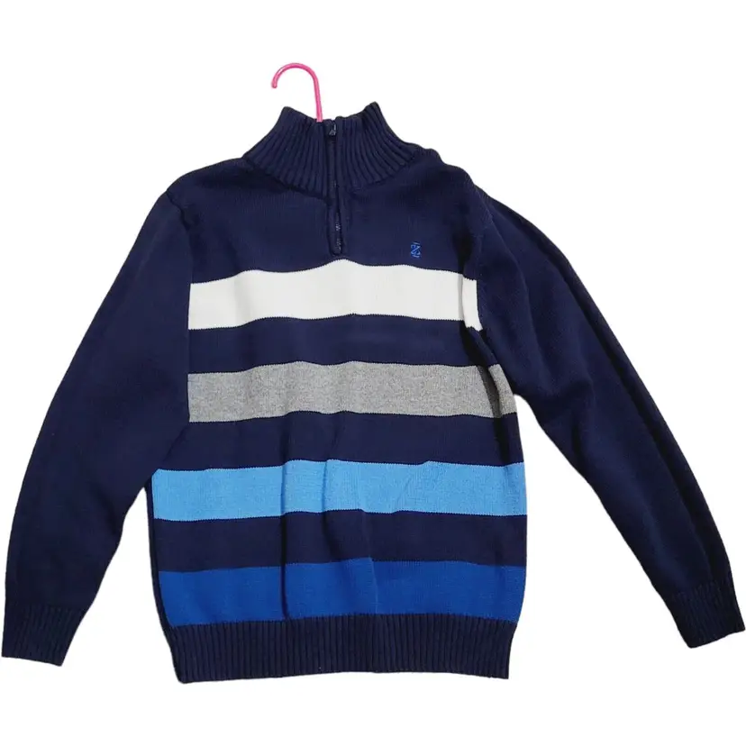 – Pattern: Striped – Knit Style: Cable-Knit – Sleeve Length: Long Sleeve – Character: Boy – Closure: Zip – Neckline: Mock Neck – Size: 10-12 – Color: Blue – Material: 100% Cotton – Fabric Type: Knit – Vintage: No – Brand: IZOD – Fit: Classic – Department: Boys – Type: Sweater – Style: Pullover – Theme: Classic, Preppy – Features: 1/4 Zip – Season: Fall, Winter