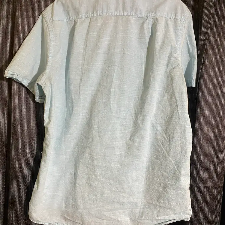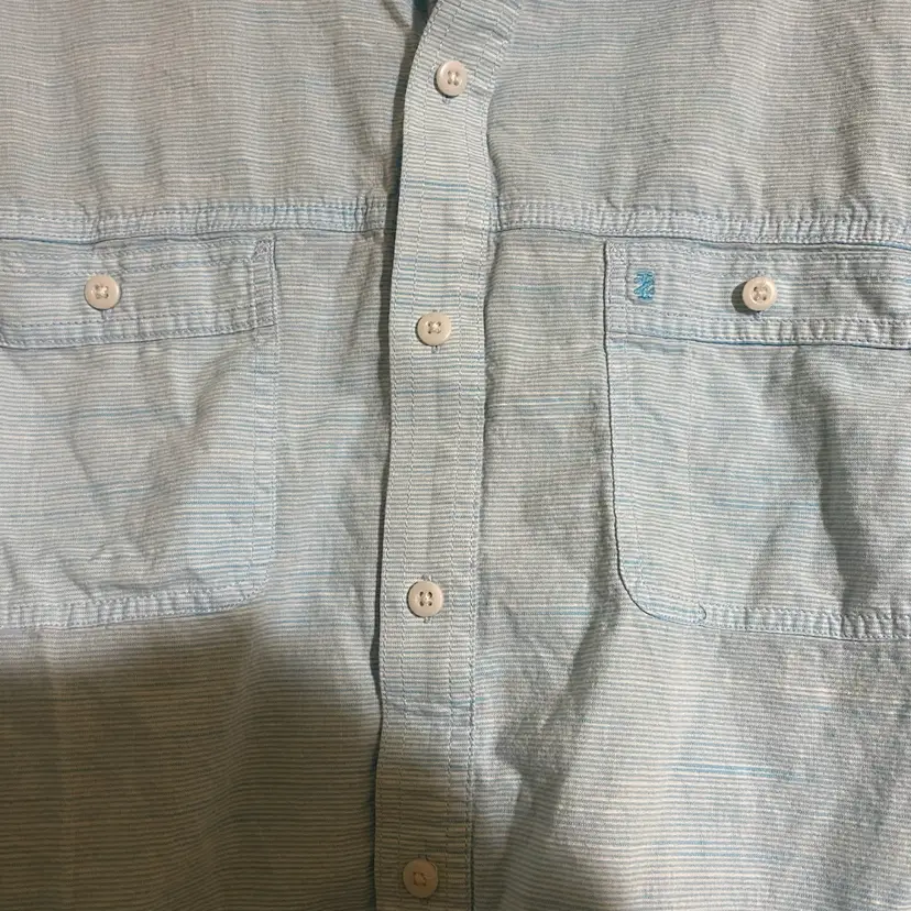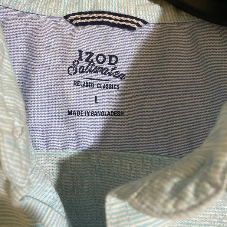 You are purchasing one Men's Size Large Light Blue & White Finely Striped Short Sleeve Button-Up Shirt by Izod and their 2020 Saltwater collection. Measurements: 22.5" chest and 29" length. This Shirt is in overall great condition with no rips, stains or holes.