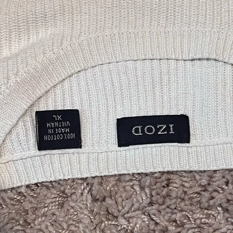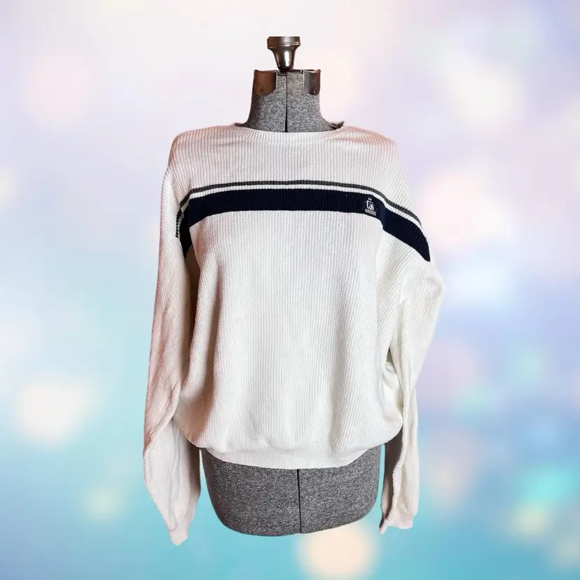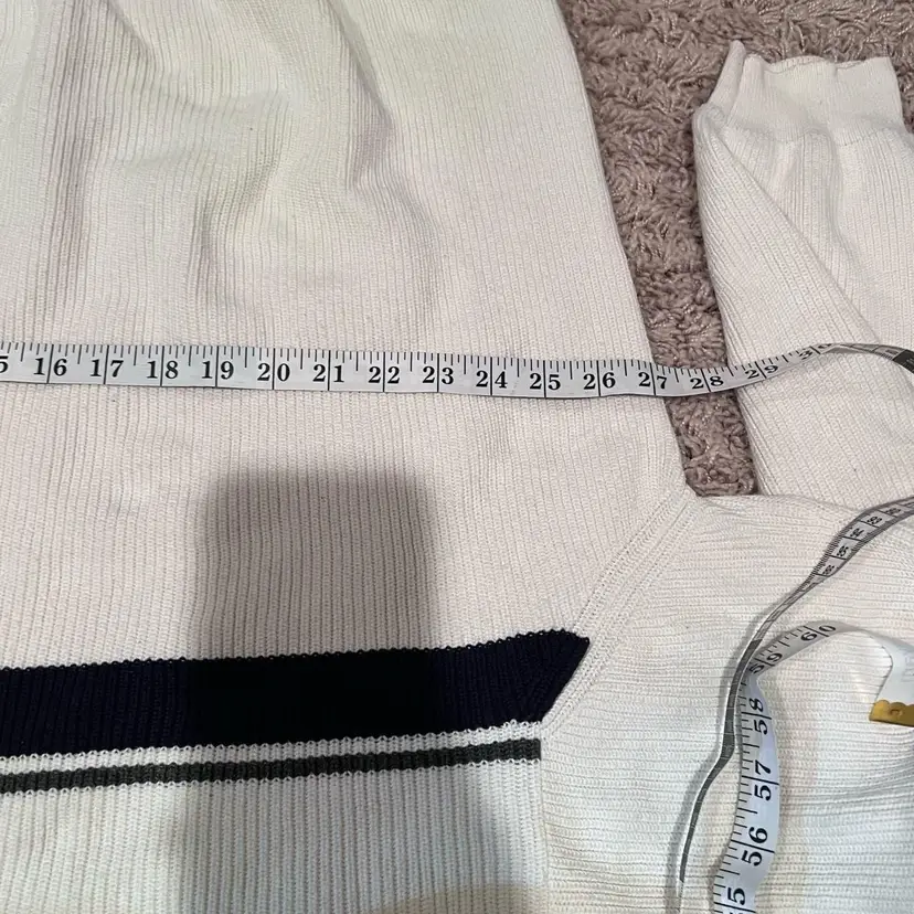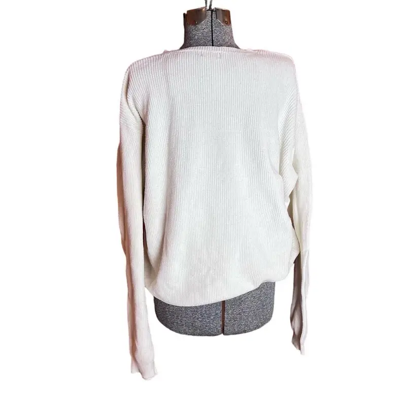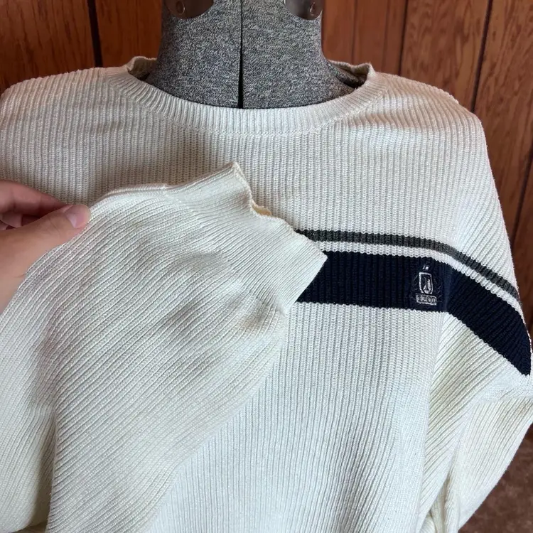Good used condition. There’s some pulled threads along the wrists and bottom hemline. No stains or holes to note.