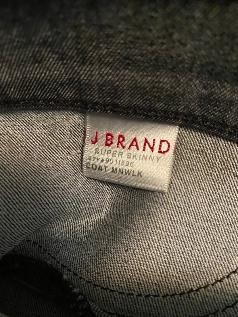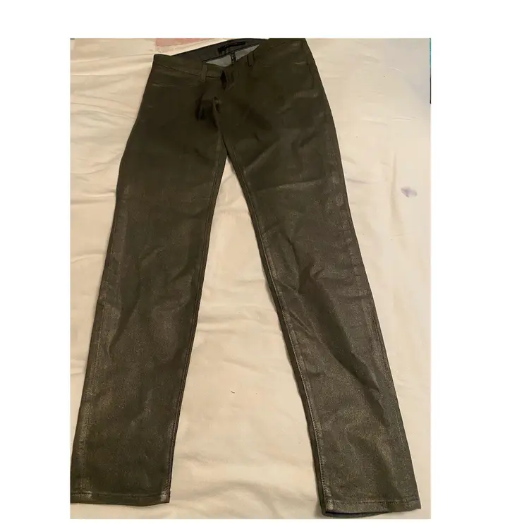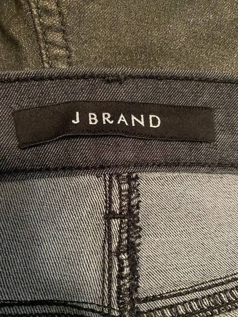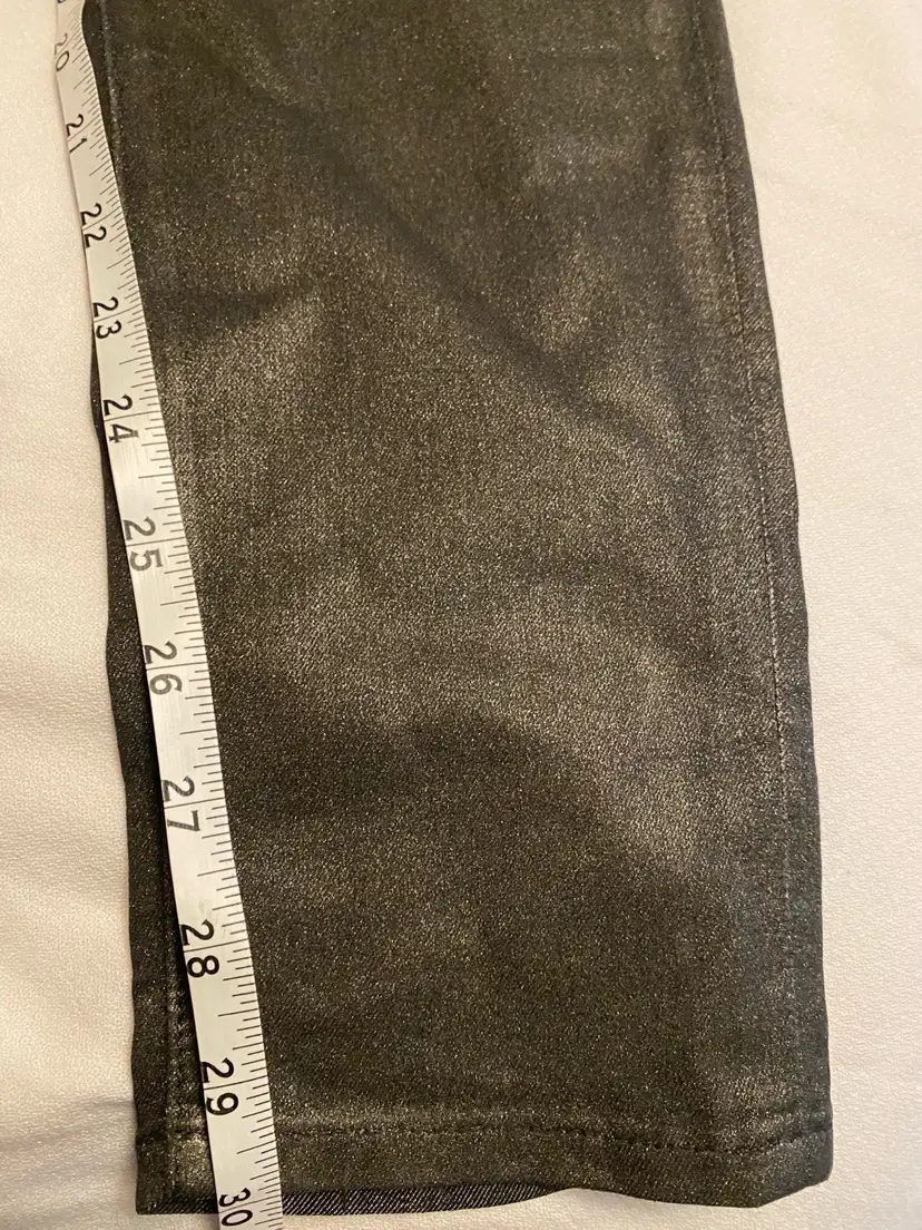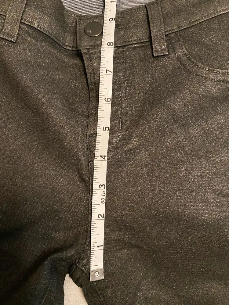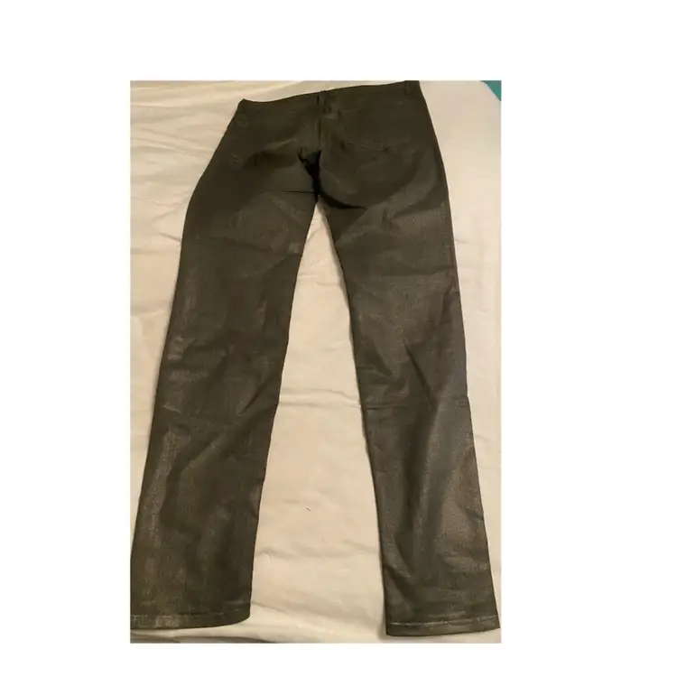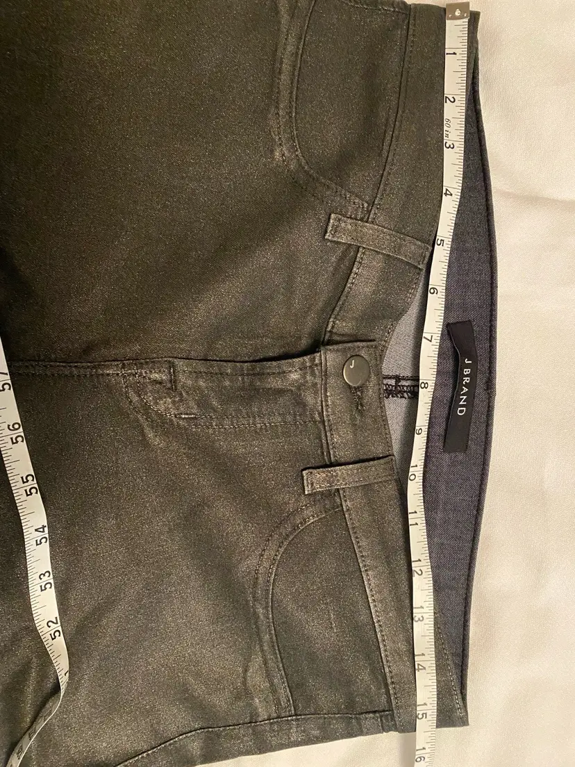 J Brand Super Skinny Moonwalk Leggings 901 moonwalk coated stretch denim Size 30 Color Black or Grey Metallic Low Rise Coat Moonwalk Faux pockets in front 2 functional pockets in back Zip Closure with button Coated wax denim Cotton/polyester/spandex Approximate Measurements Waist: 16 x 2= 32” Inseam: 29-30” Rise: 9” I also included pictures of the pant legs so I can show the color better Never worn cost $198