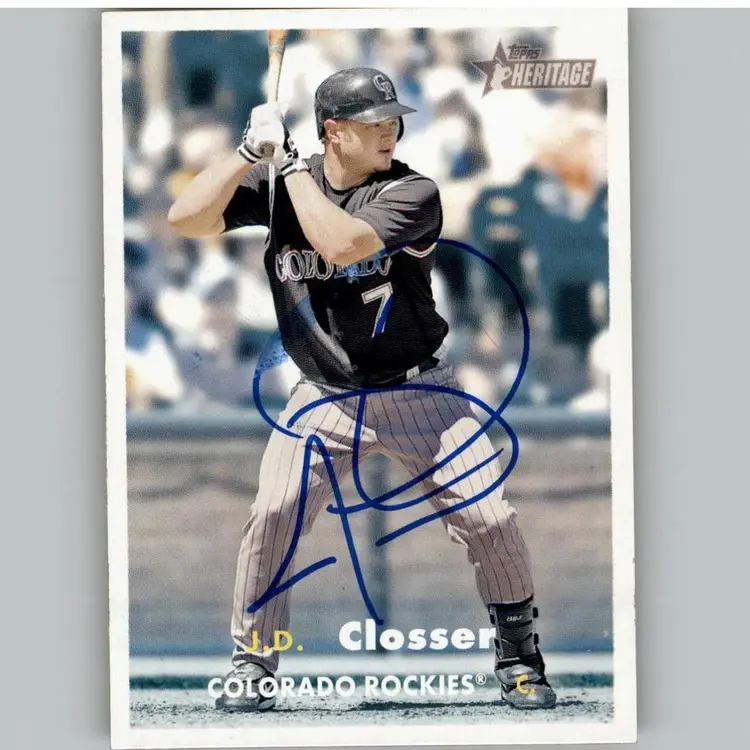 Authentic Topps Heritage baseball card featuring J.D. Closser of the Colorado Rockies, signed boldly in blue ink. A great addition for Rockies fans and autograph collectors. Your purchase supports Signatures For Soldiers in aiding homeless and disabled veterans.