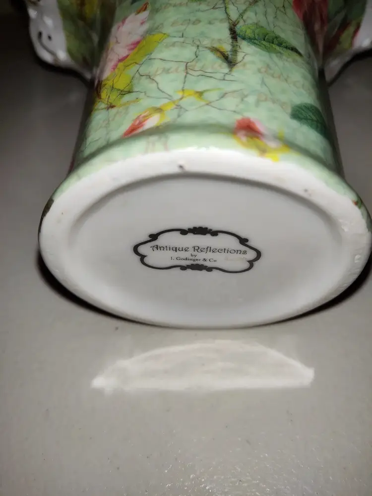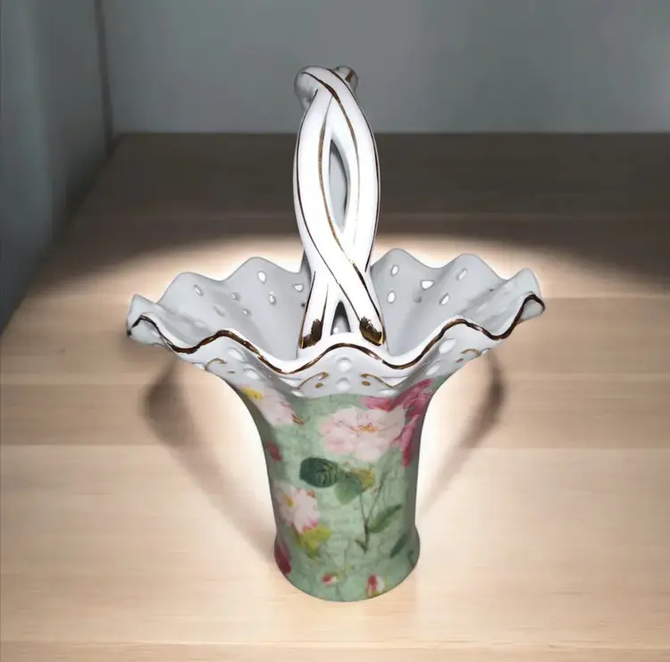 This exquisite pink roses reticulated basket from J. Godinger & Co is a stunning addition to any home. Made of antique reflections porcelain with a Victorian cottage design, it exudes elegance and charm. Stamped on the bottom for authenticity. Measures approximately 10 inches tall