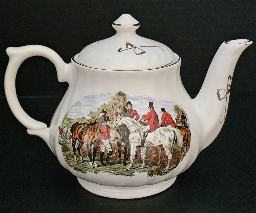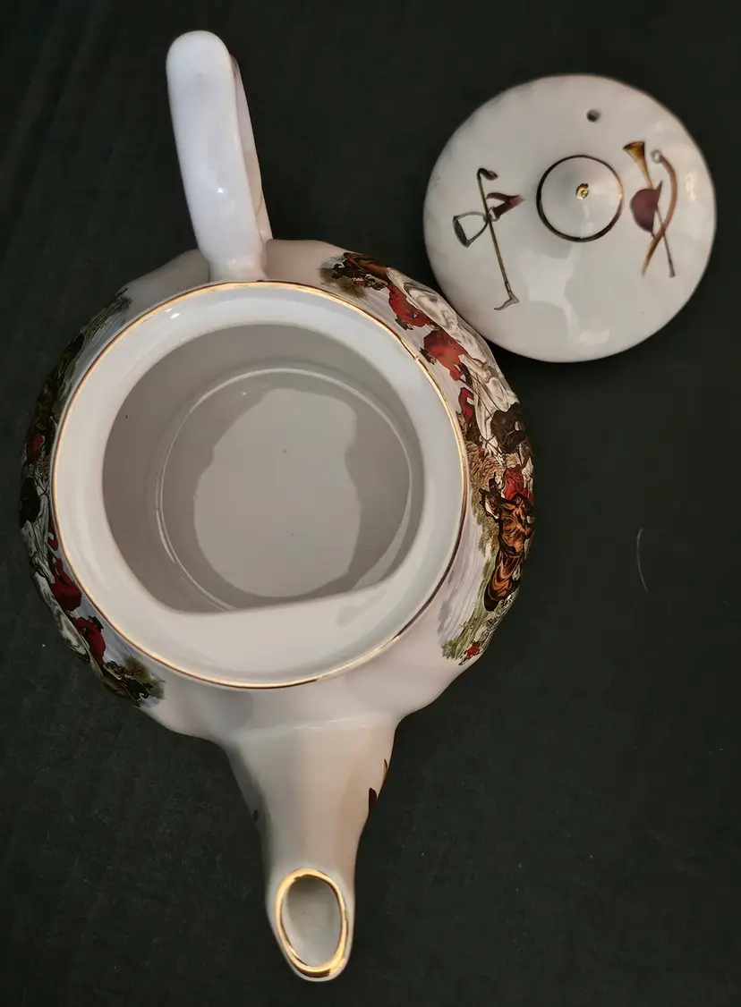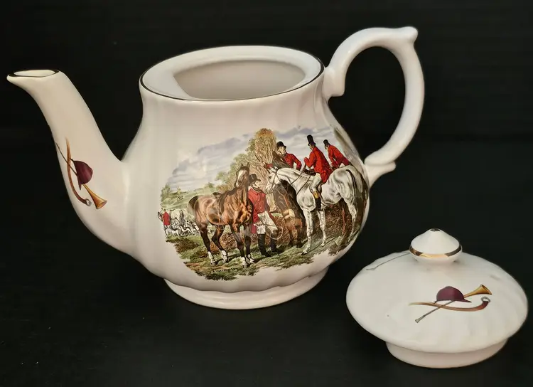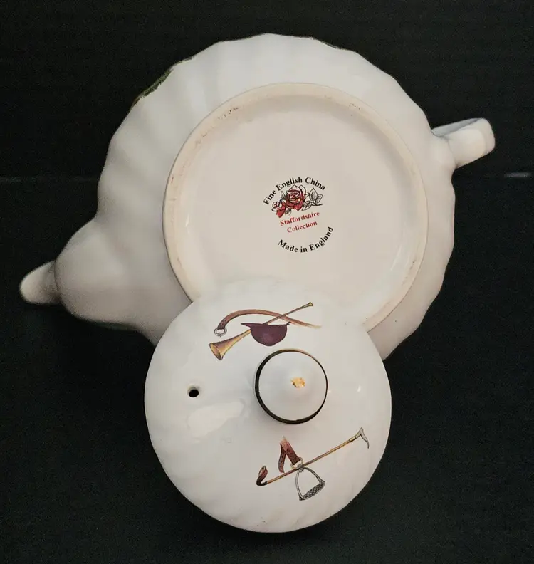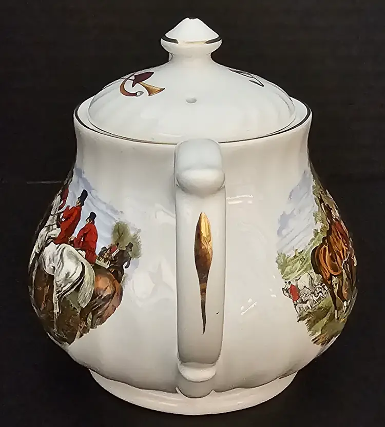 Made in England. Unlike most of these teapots, the lid portrays a helmet and horn, also on the tea spout. Gold trim lines both the lid and on the handle. Great condition. Not chips, cracks or scars. 5" high, 4 1/2" wide, 7" spout to handle.