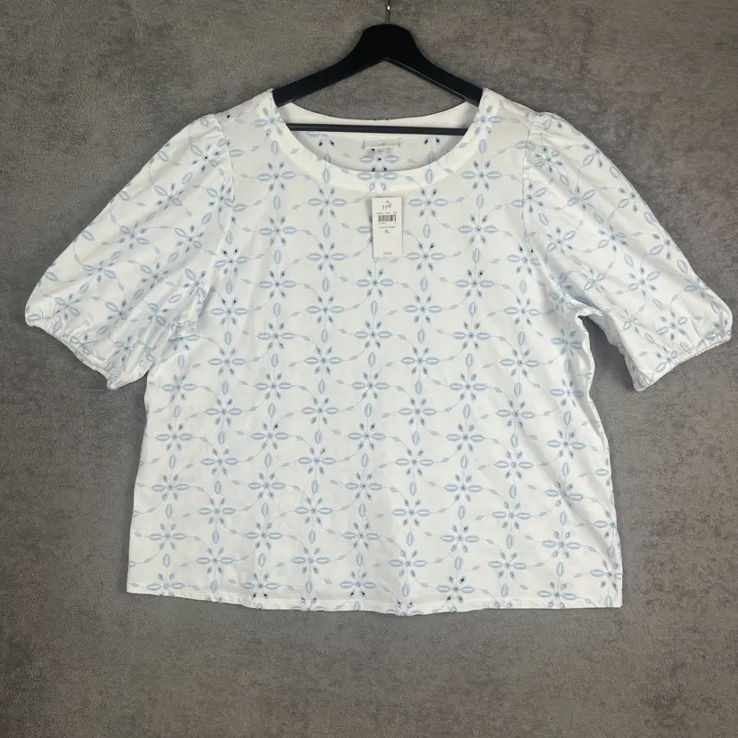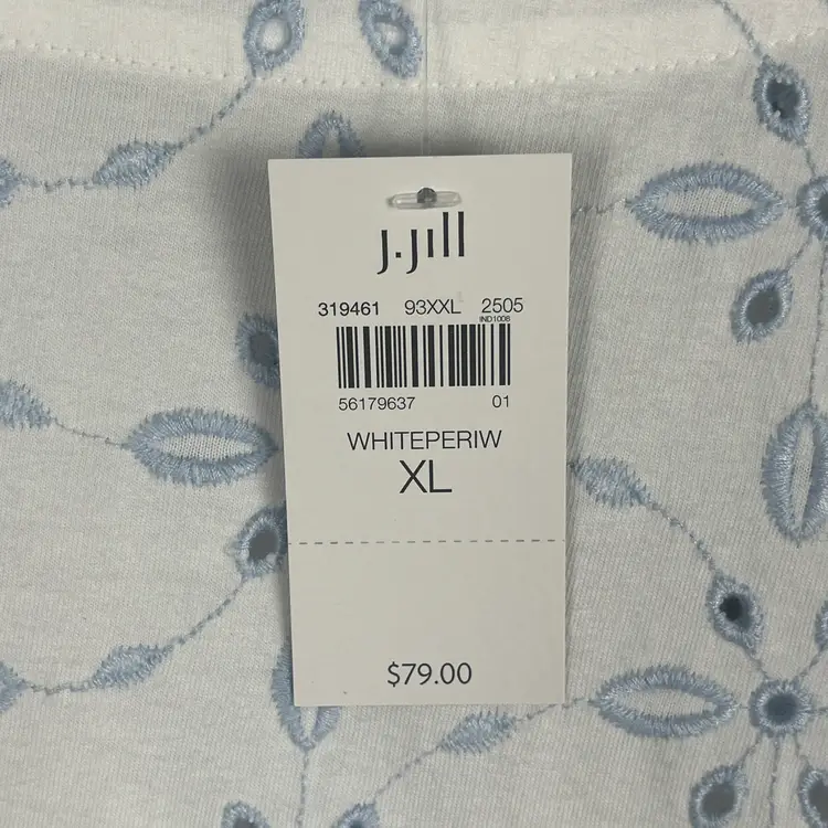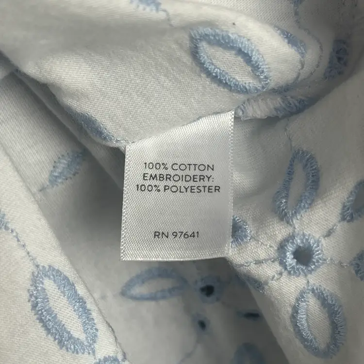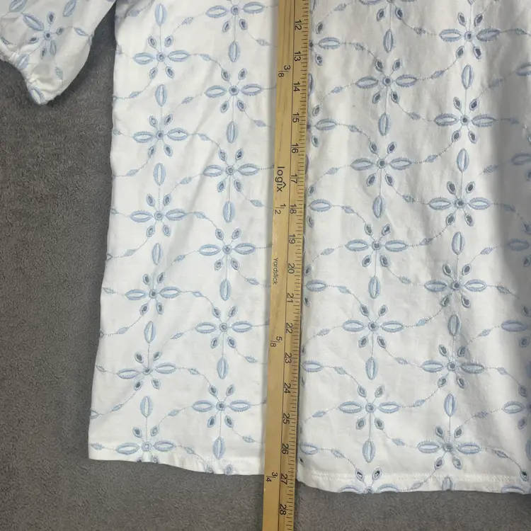 Details Size: Womens XL Color: White with Periwinkle Embroidery Fabric: 100% cotton; embroidery 100% polyester Original Retail: $79 Condition: New with tags. See pictures for measurements.