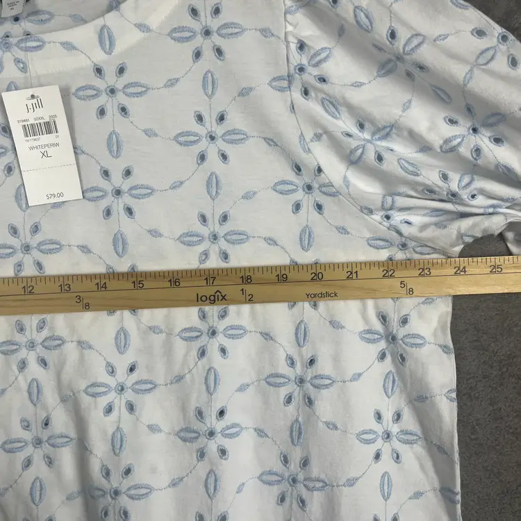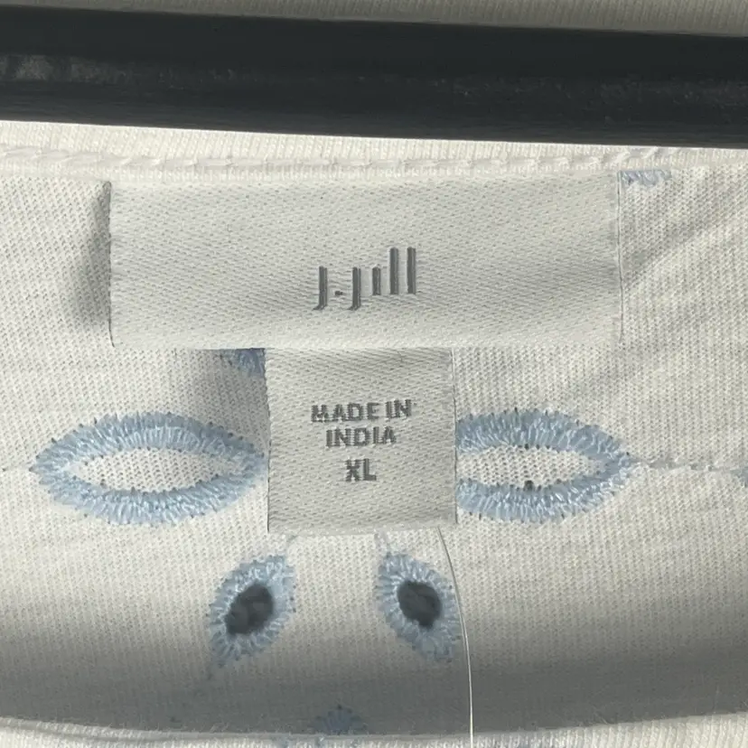 Beautiful J.Jill embroidered cotton top featuring a soft white base with delicate periwinkle eyelet stitching throughout. Lightweight, breathable, and gently structured with short puff sleeves and a relaxed silhouette. This piece brings the easy, elevated comfort J.Jill is known for—perfect for warm days and effortless everyday style.