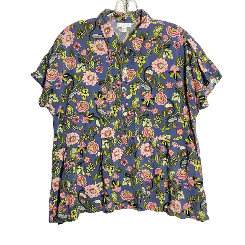 J. Jill Floral Blouse Casual Collared 1/4 Button Down Boxy Fit with Peplum flowy flare waist. This poised top is fun, flowy, and very soft from J. Jill. This blouse would be perfect with pants or a skirt for a comfy and cute summer outfit.