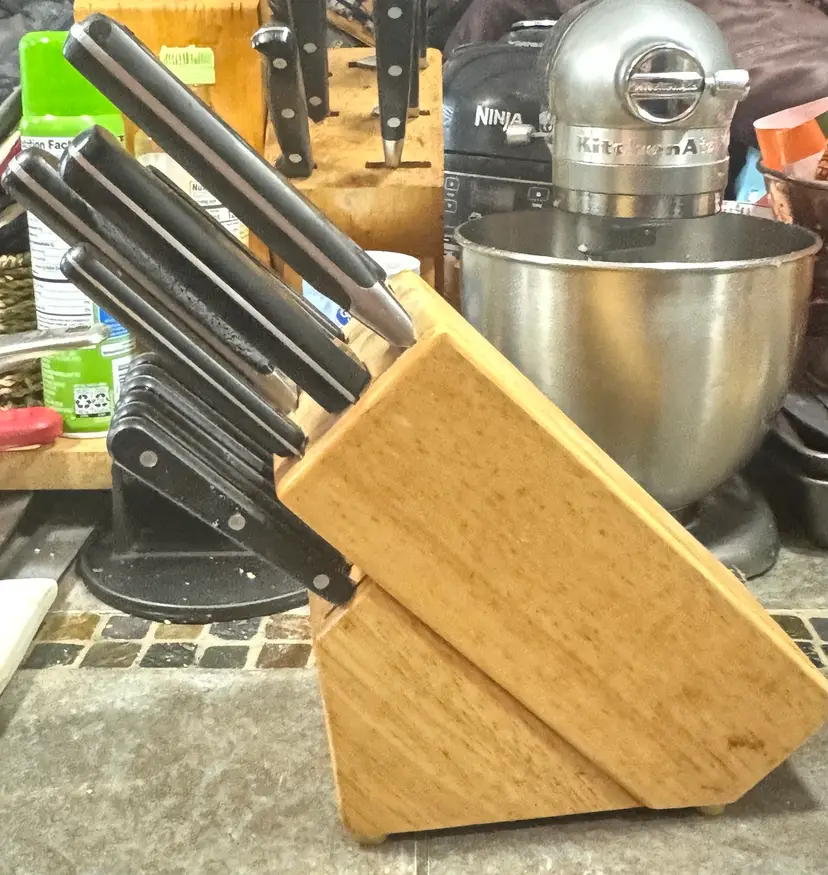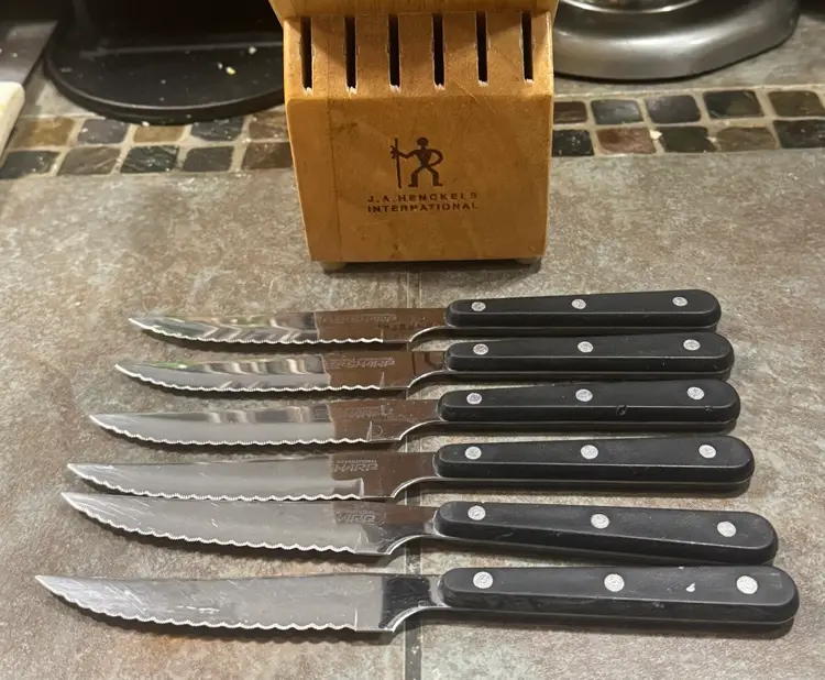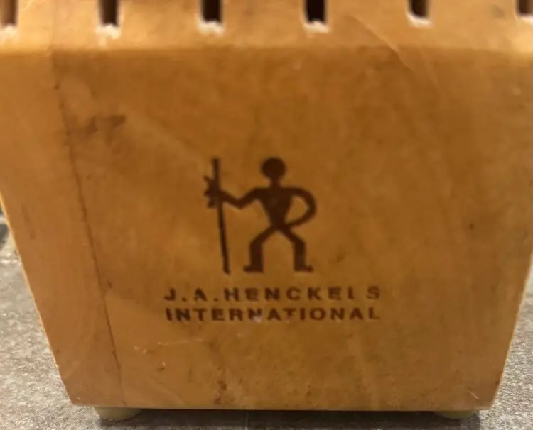 J.A. Henckels 13 Piece Knife Set includes 6 steak knives, Santuko, Bread knife, Boning knife, Utility knife, and wood branded storage block. It also includes a Chefs knife and a carving knife that match the set but are not Henckels.