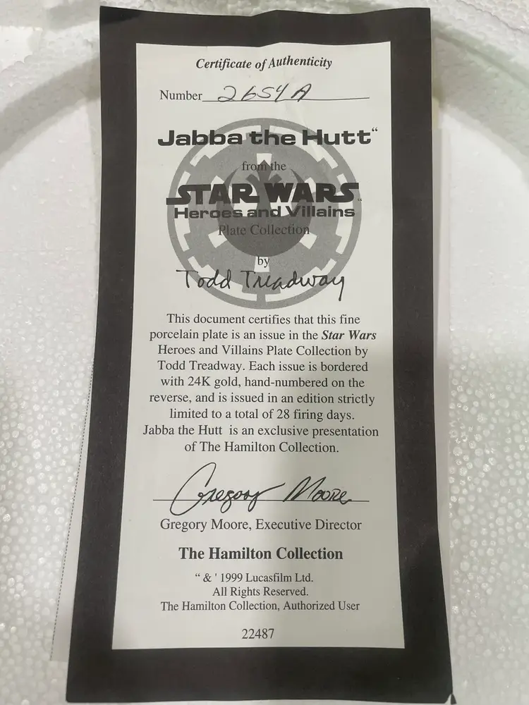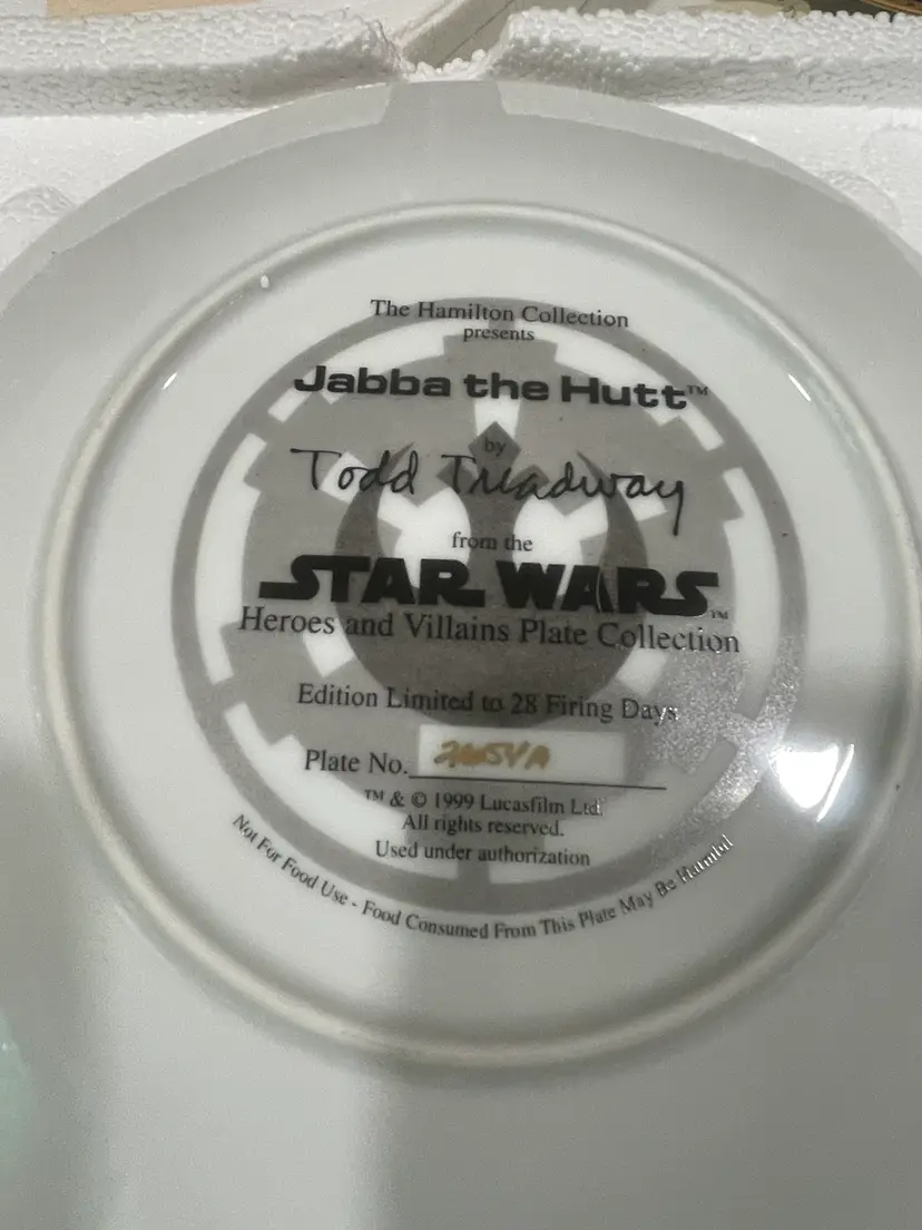 Jabba the hut Star Wars Hamilton Collection Plate Heroes & Villians NIB w/CoA Jabba the Hut plate of Star Wars from Heroes and Villians collection of Hamilton. All plates are New in original styrofoam and has CoA a shown.