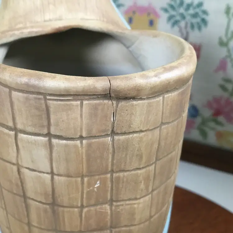 This signed and dated piece is 10" high. There is a vertical crack along the top of the basket, a bit over an inch long, but no other loss.