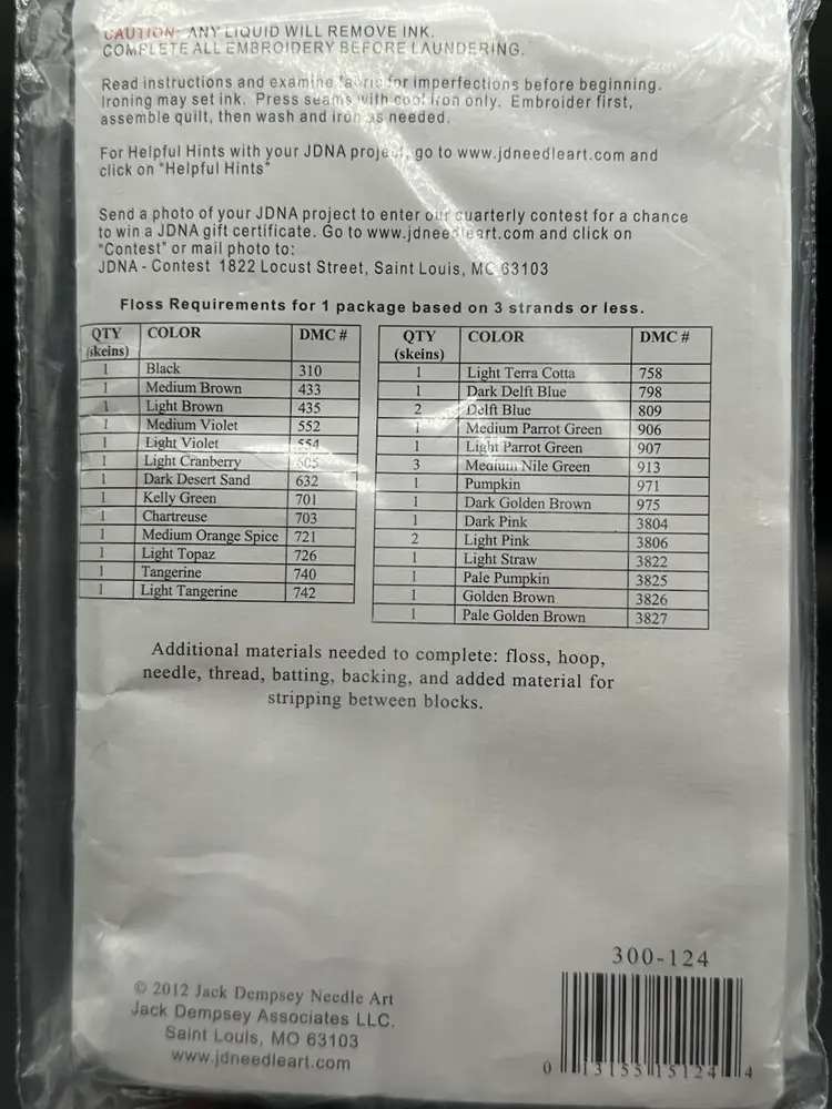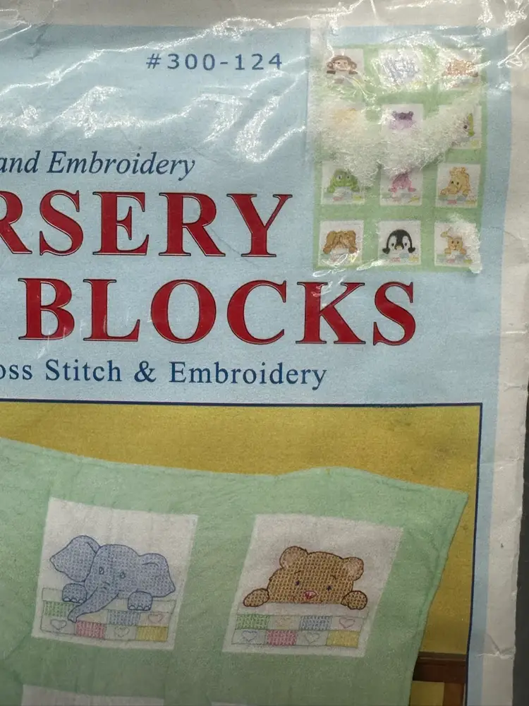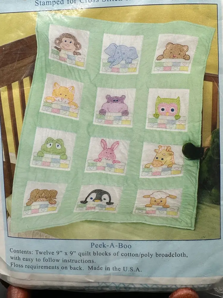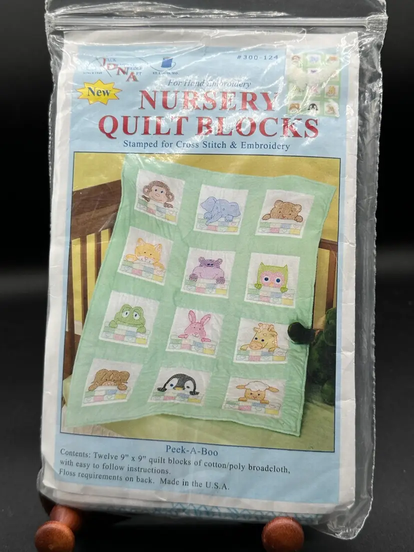 Jack Dempsey Stamped White Nursery Quilt Blocks 9"X9" 12/Pkg-Peek A Boo JACK DEMPSEY-Stamped Cross Stitch & Embroidery Quilt Blocks. Create a beautiful quilt top using this great kit. It consists of individual squares to stitch and join together to form a quilt top. The embroidery designs have been stamped using ink that washes away with any liquid and the fabric is a cotton/poly blend broadcloth. This package contains twelve 9x9 inch quilt squares, instructions for completion and care, and complete DMC floss requirements. Fabric, backing, batting, hoop, needle, thread, and floss all sold separately. Design: Peek-A-Boo. Made in USA.