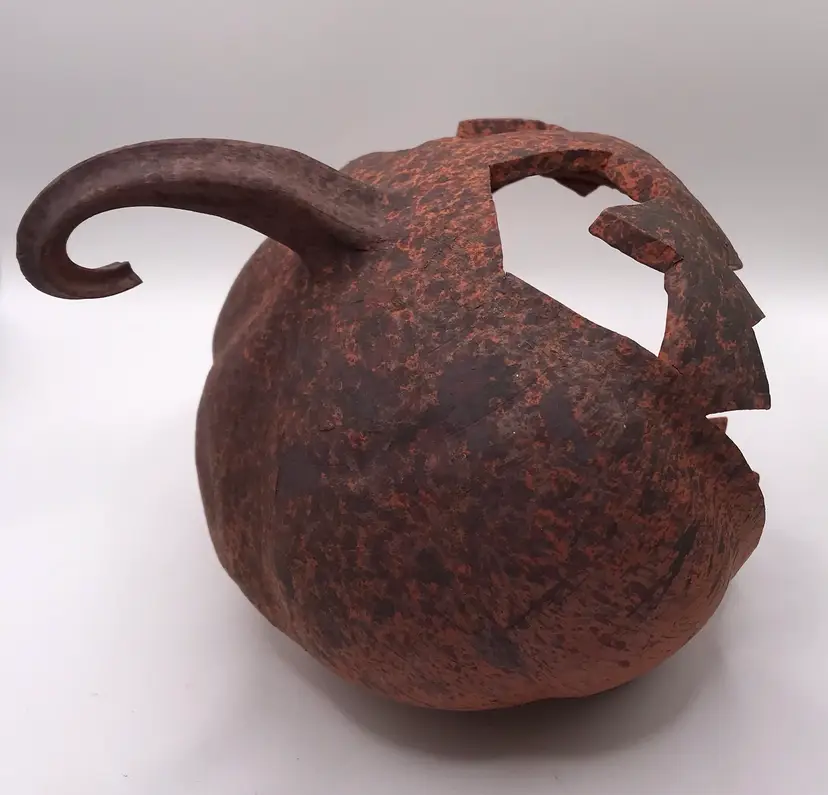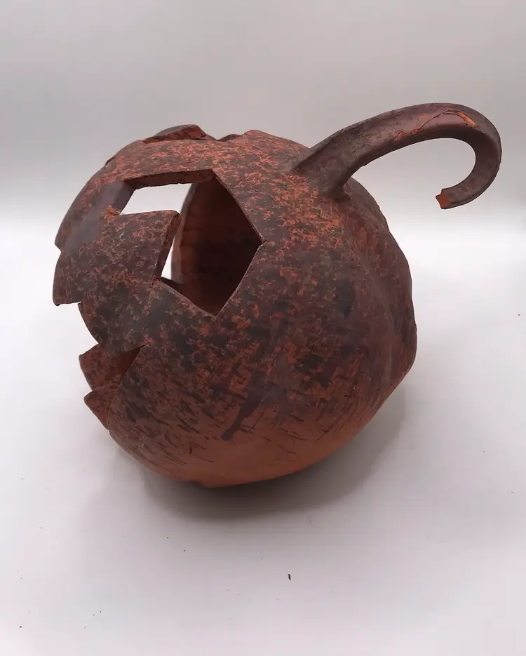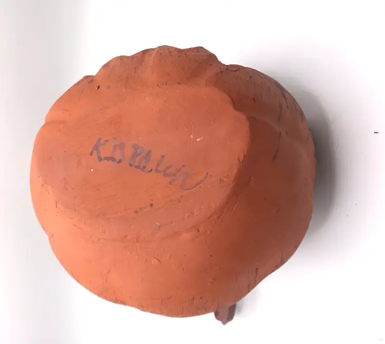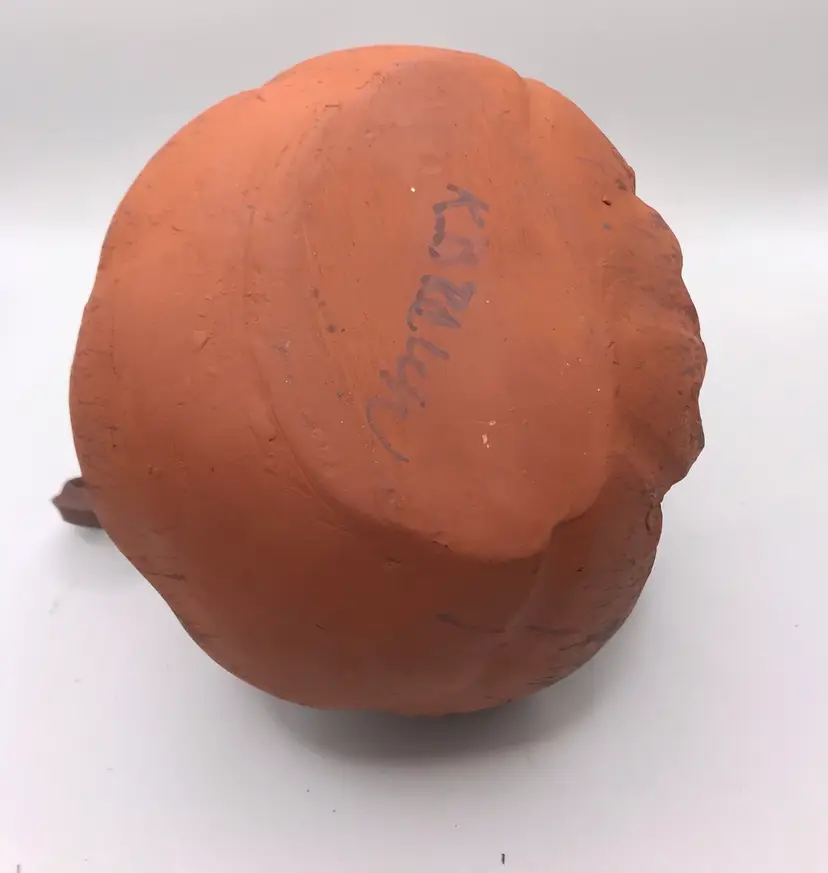 Jack o lantern pumpkin made of red earthenware clay. It is hand thrown on a potters wheel, then shaped into pumpkin, and it is hand carved with unique face. The potter is K Brown. 6”x 4.5”