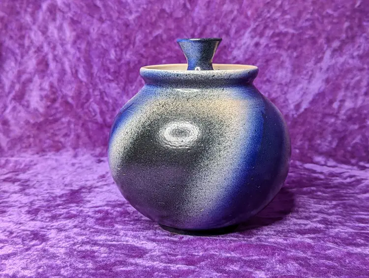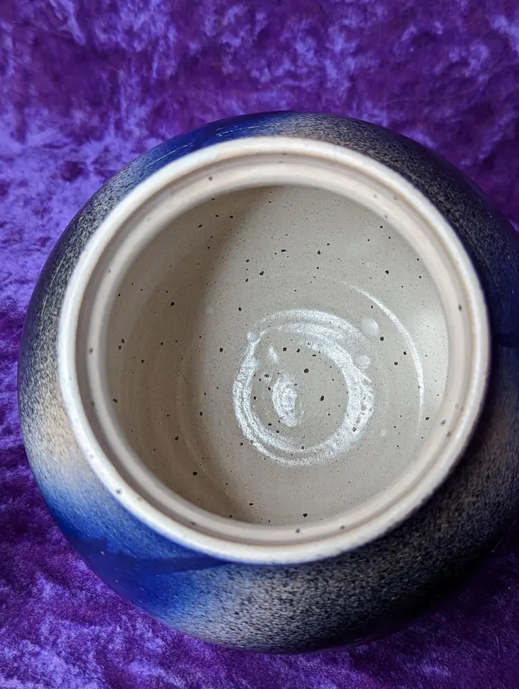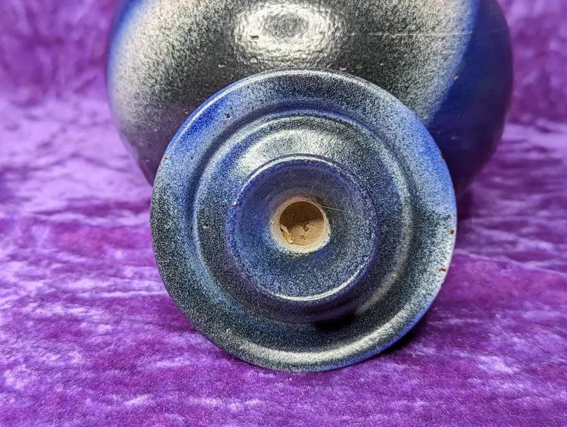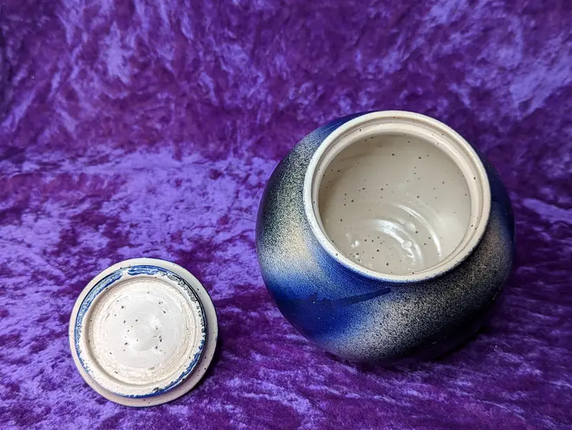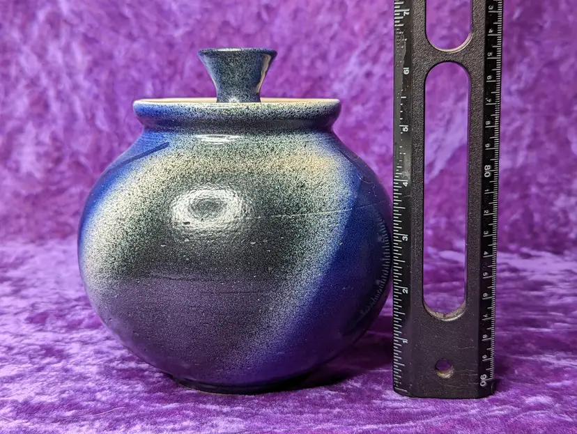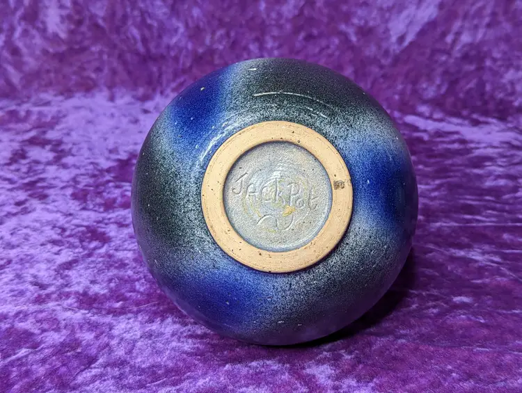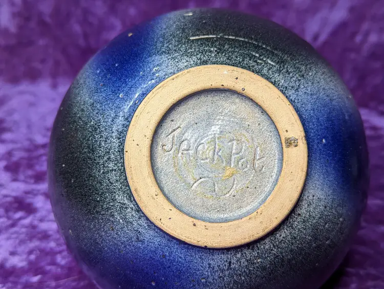 Jackpot Studio Pottery Stoneware Bean Pot Glazed Blue Canister By artist Julie Knight from NY. The pot can fit into many decors Country farmhouse,primitive and boho. The pot is glazed on the inside. Nice deep blue.Very good condition + no chips or cracks. Please check the photos for details.
