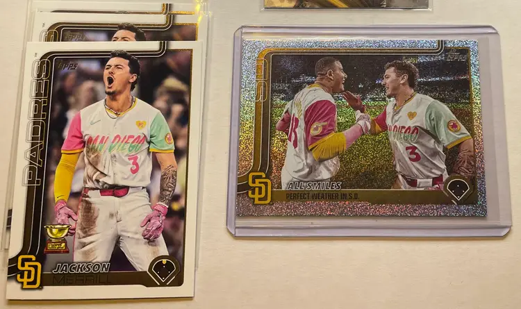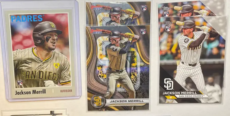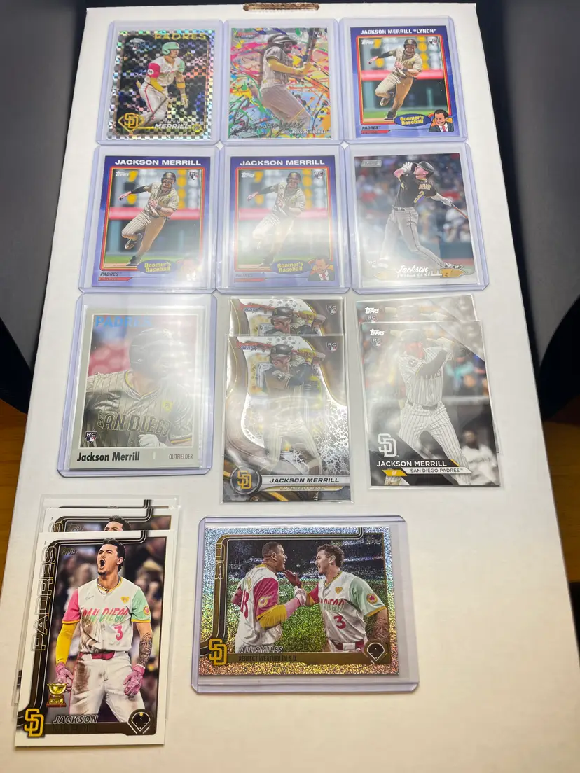 Jackson Merrill lot includes: -'24 Topps Chrome Update Xfractor RC -'24 Bowman's Best Showpieces insert RC -'24 Boomer's Baseball Jackson Merrill "Lynch" RC -'24 Boomer's Baseball RC (x2) -24 Topps Stadium Club RC -24 Topps Archives RC -'24 Topps Flagship RC (x2) -'24 Bowman's Best base (x2) -'25 Topps Series 1 All Star Rookie insert (x3) -'25 Topps Series 1 All Smiles Machado/Merrill Rainbow Foil