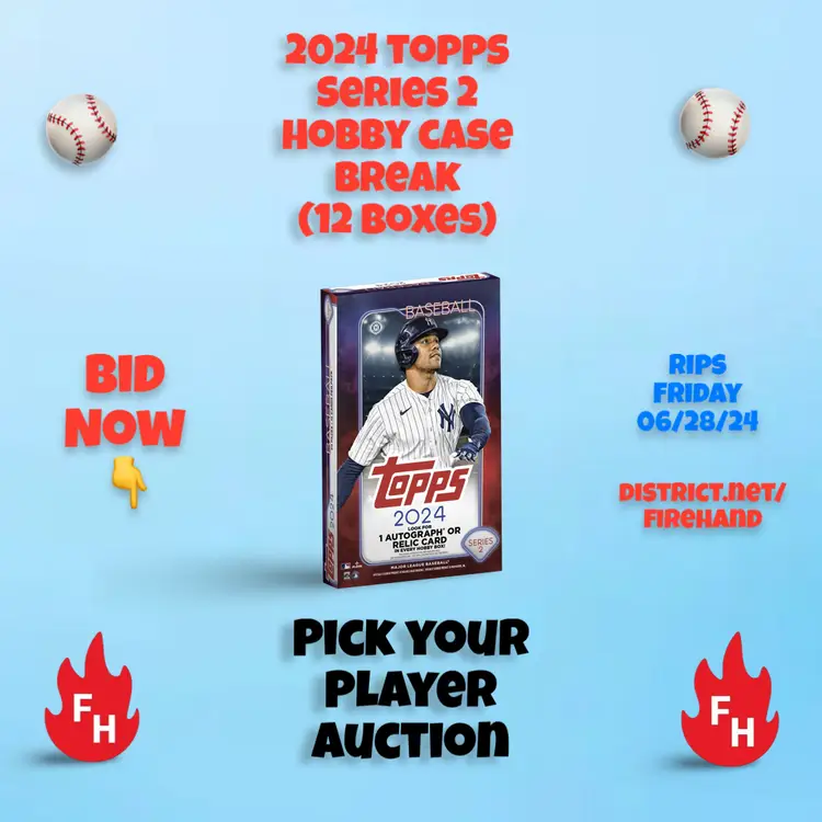 You are bidding on all the cards of the player listed in the title in this HOBBY Case (12x Hobby Boxes) of 2024 Topps Series 2 Baseball Cards. Auctions end Wednesday & Thursday evening and Case will be opened LIVE on Friday morning 6/28. Opening will be viewable & simulcast on Firehand Cards District as well as YouTube. US Shipping is $5.00 for your first auction spot won and only $.25 per additional spot won after that! Any spot won where no cards of the player are found in the box will receive a bonus card or pack from the Firehand collection. Any multi-player base cards will be split as fairly as possible between the spots of the players depicted on the card. Any hit pulled (Cut Signatures, Sketches, Hidden Gems etc) of a player who is NOT listed in the auction will be assigned by draw between all participants. Any dual or multi-player #'d or auto cards featuring multiple players will be assigned live between the spots depicted on the card.