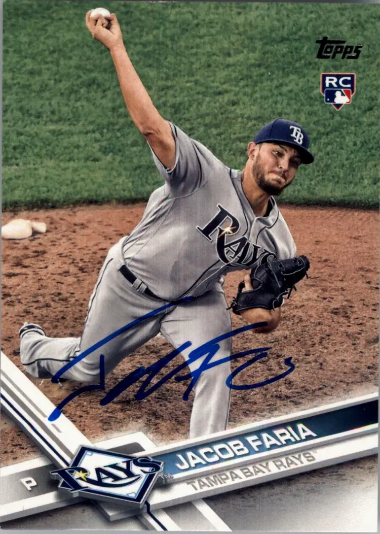 Authentic Topps baseball card featuring Jacob Faria of the Tampa Bay Rays, signed boldly in blue Sharpie. A great addition for Rays fans and autograph collectors. Your purchase supports Signatures For Soldiers in helping homeless and disabled veterans.