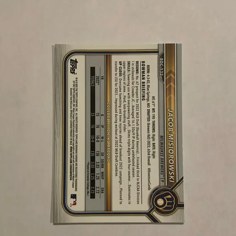 Jacob Misiorowski 2022 Bowman Draft Chrome #BDC-132 Milwaukee Brewers
