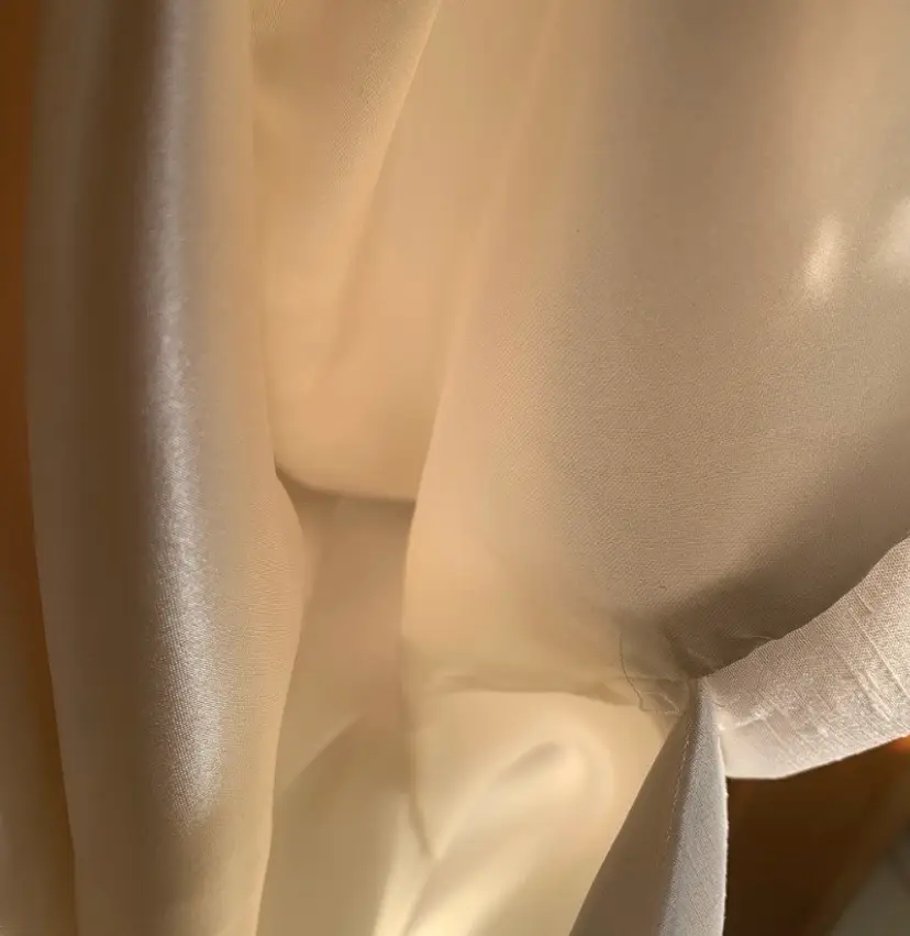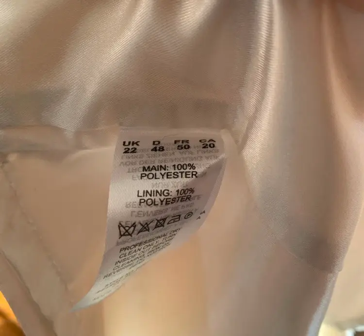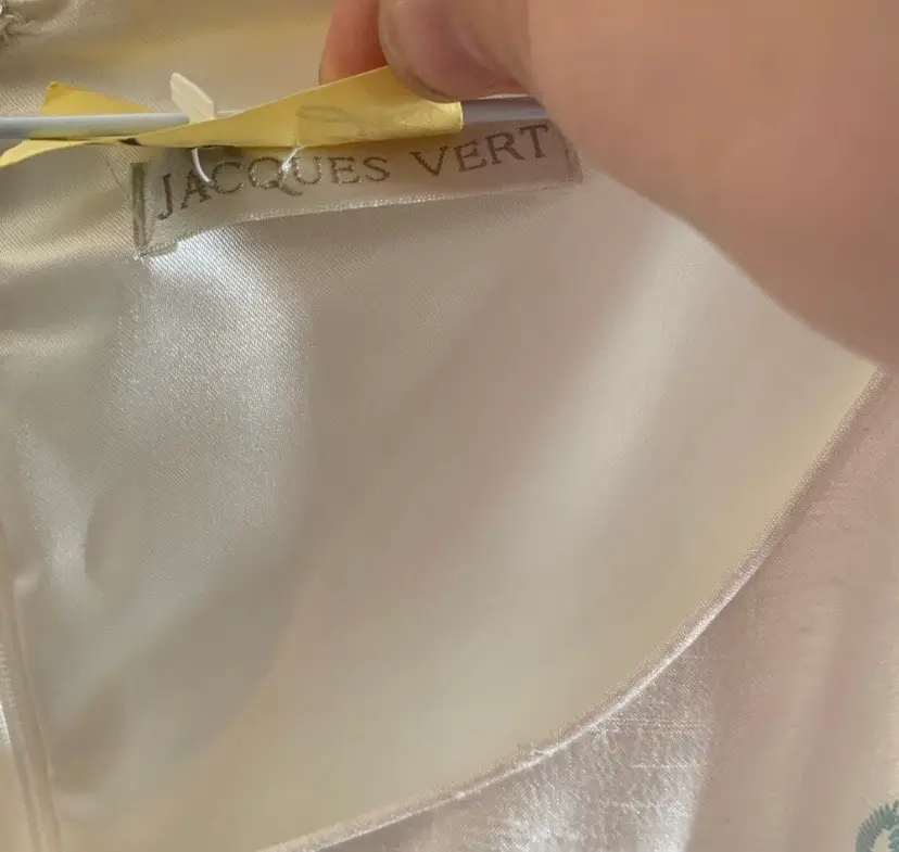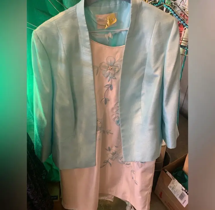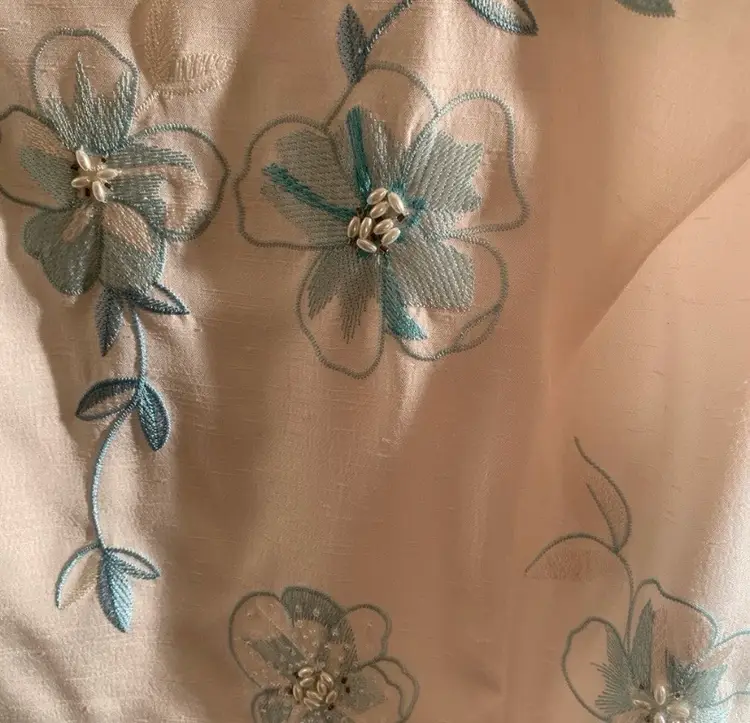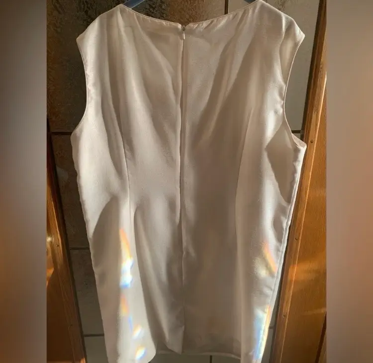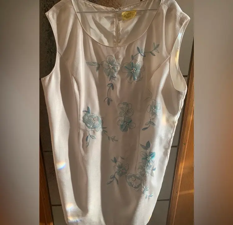 Sleeveless white dress with blue and white floral embroidery. Has a scoop neck. Made of 100% polyester. 23.5” pit to pit.
