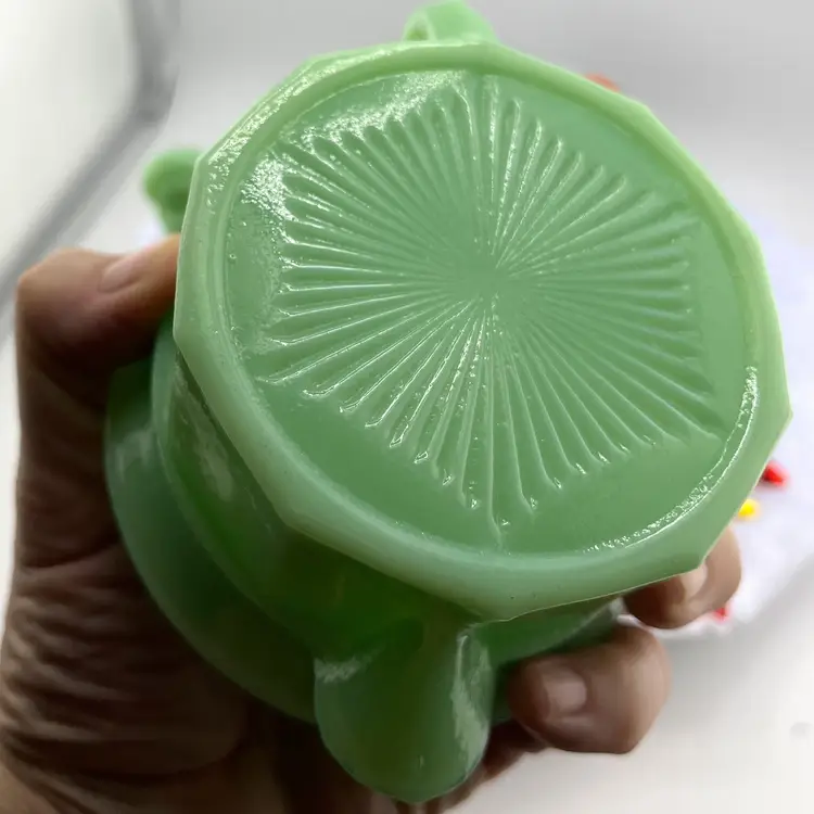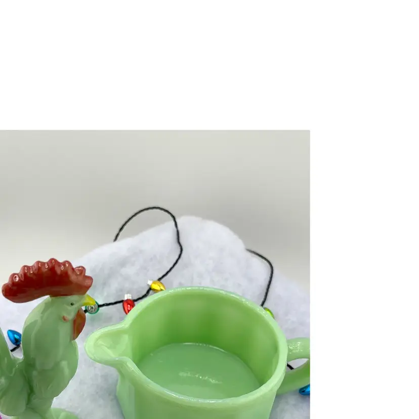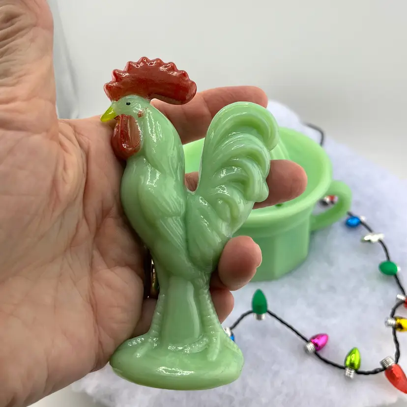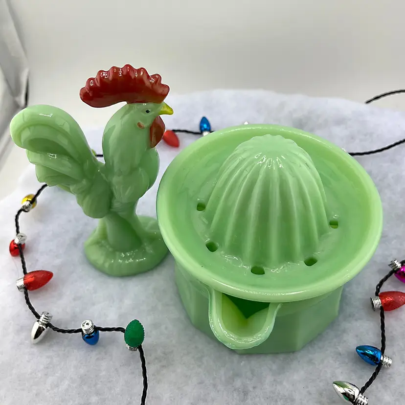 Green Jadeite Depression Style Glass Rooster Hand Painted Figurine, Vintage Jadeite Depression Style Glass Juicer & 1 C - Measuring Cup