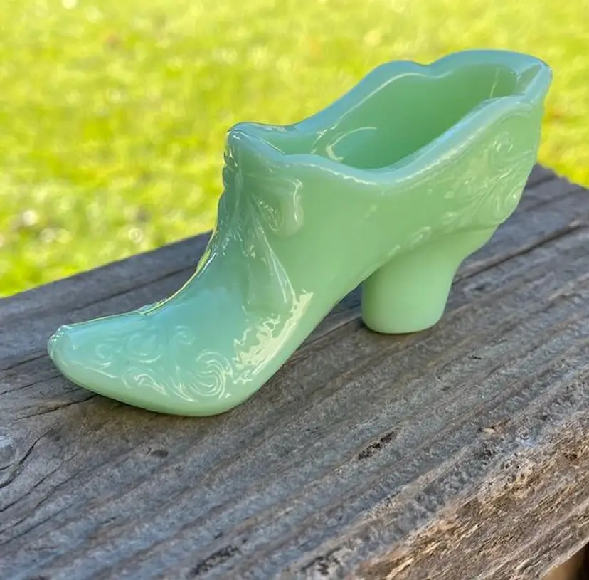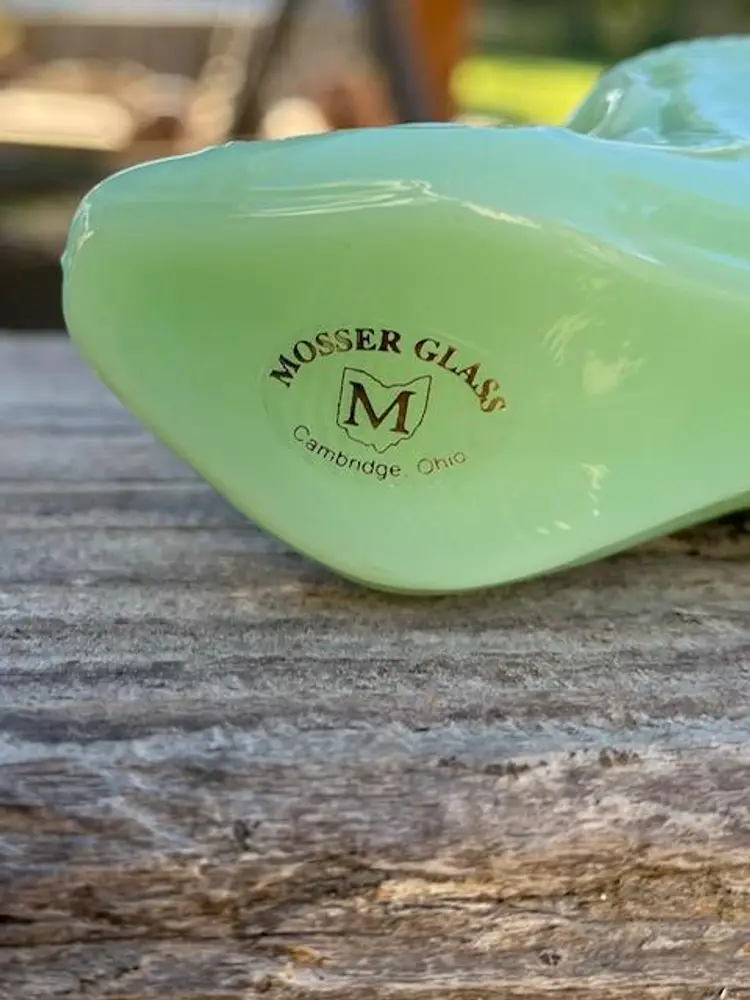 A beautiful Mosser Glass Shoe in Jadeite. Approximately 2 1/4" Tall, 5" Long and 1 1/2" Wide. Label on the bottom. Excellent Condition.