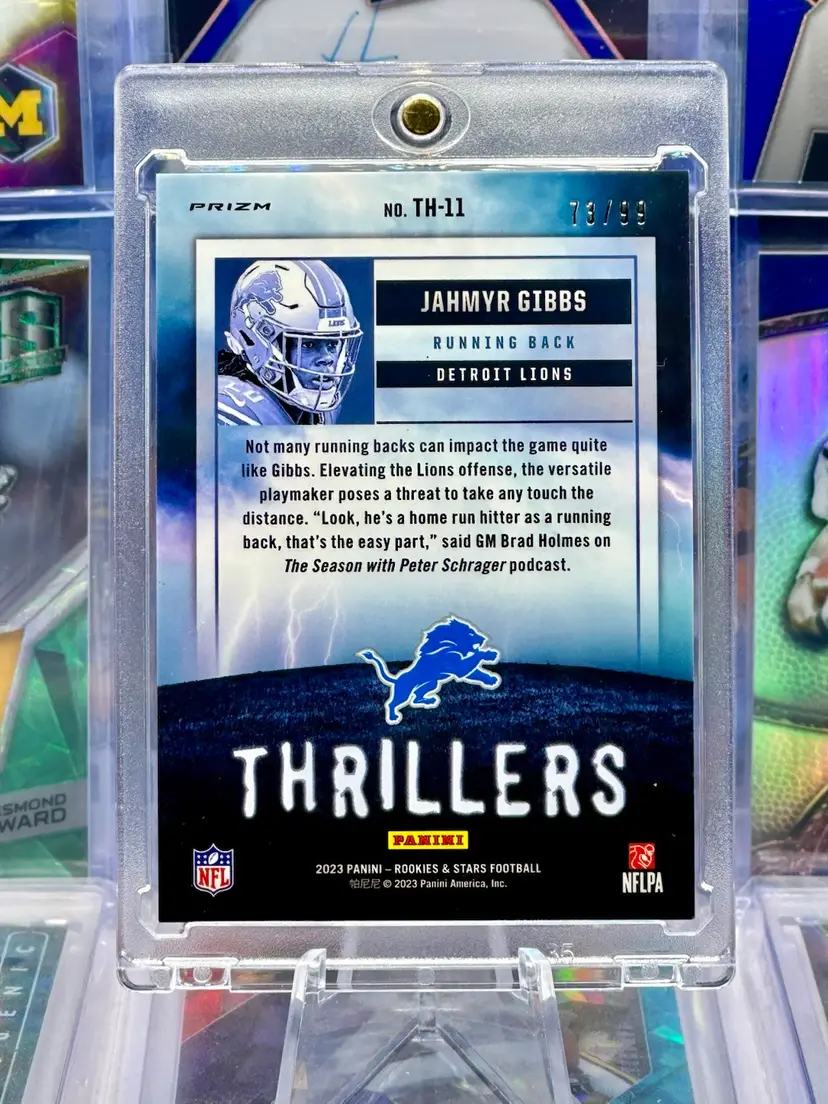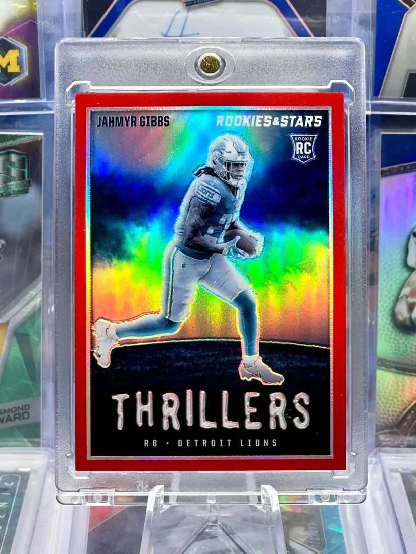 Jahmyr Gibbs 2023 Panini Rookies & Stars THRILLERS Serial Number Numbered #’d #d /99 Red Prizm Refractor Holo Parallel Insert SP Short Print Detroit Lions Alabama Crimson Tide RB Running Back Offense Offensive Player Rare NFL Football Card