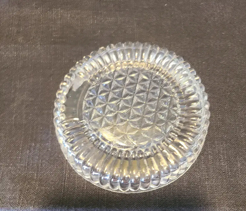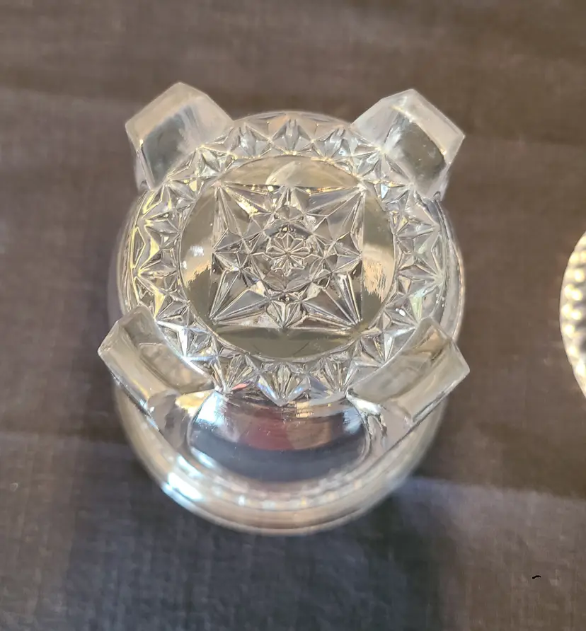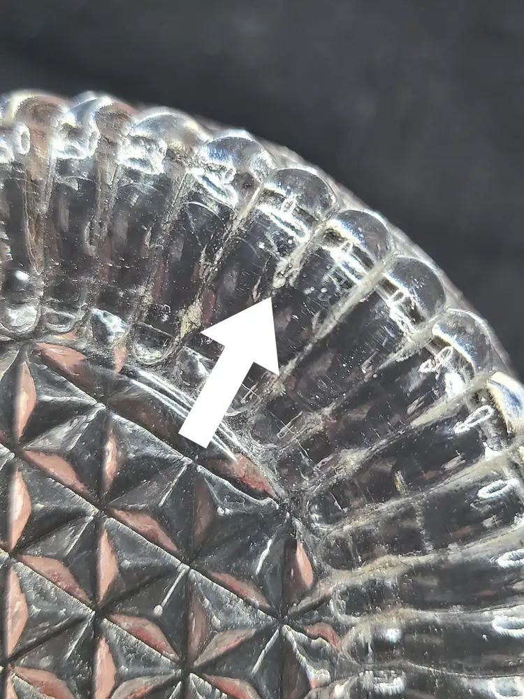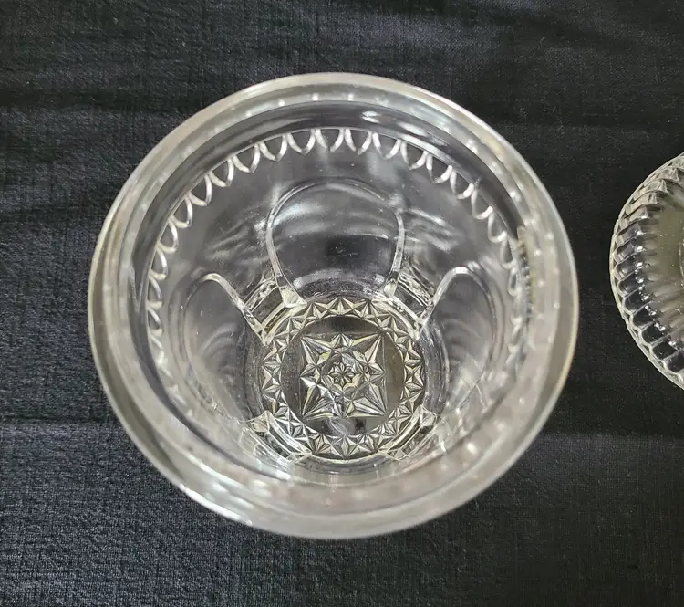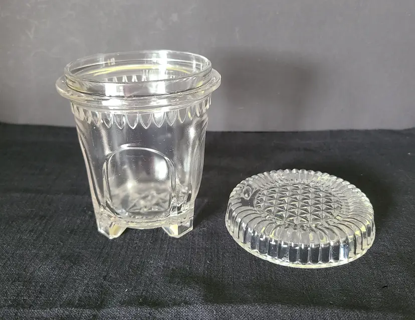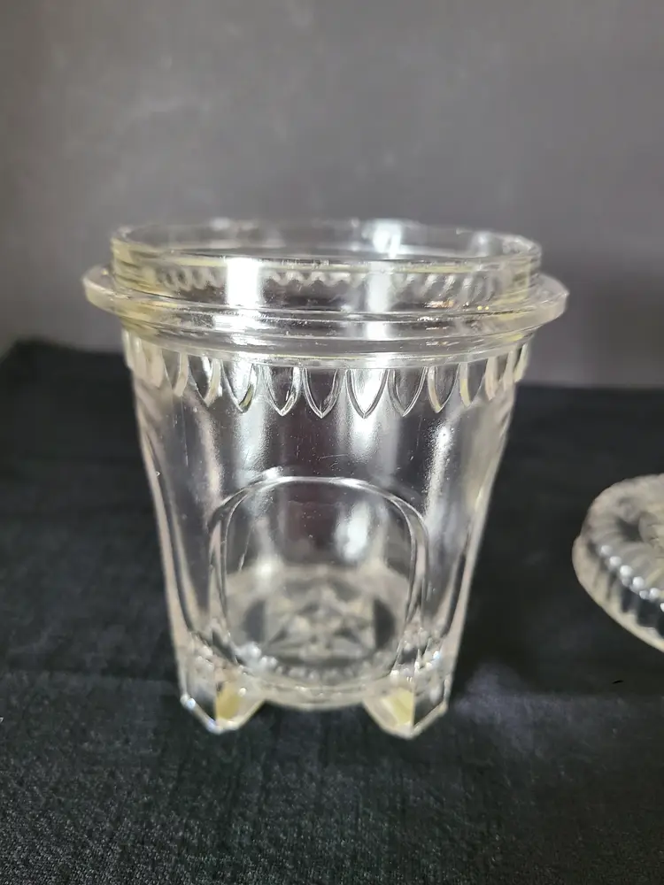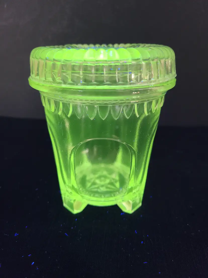 This is the pint size version of the Queen pattern by Adams & Co. Take a look at all pics, please. We do have a few chips along the top rim of the jar as shown. The lid is a little more chippy along the edge. Measures approx 4.5" tall (with lid on) and 3.75" wide at top. Has a nice manganese glow under 365nm and 395nm. Pic shows w/ 365.
