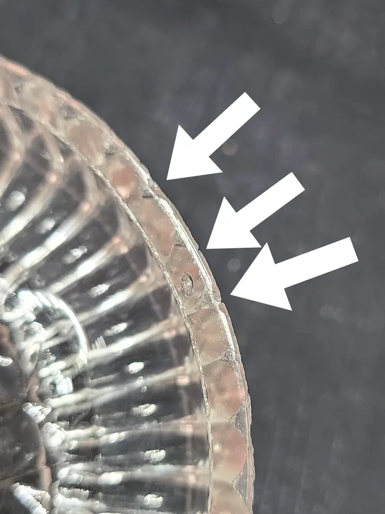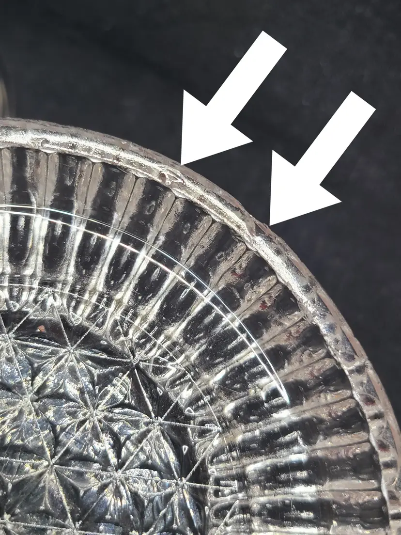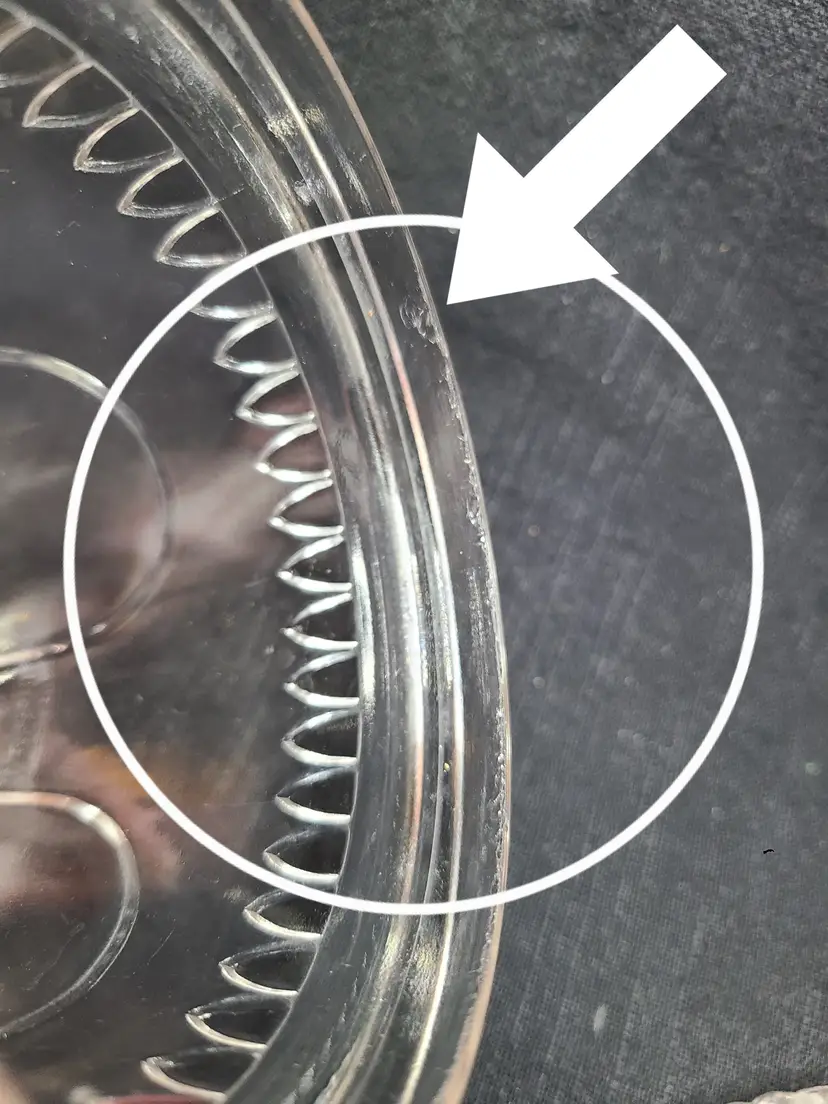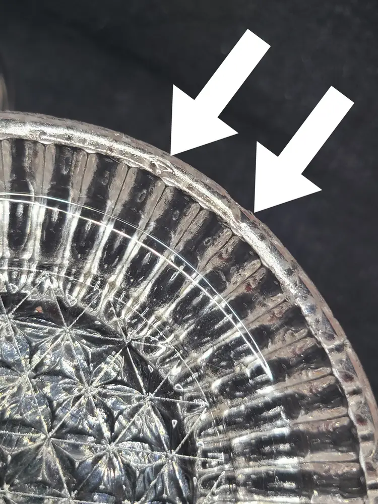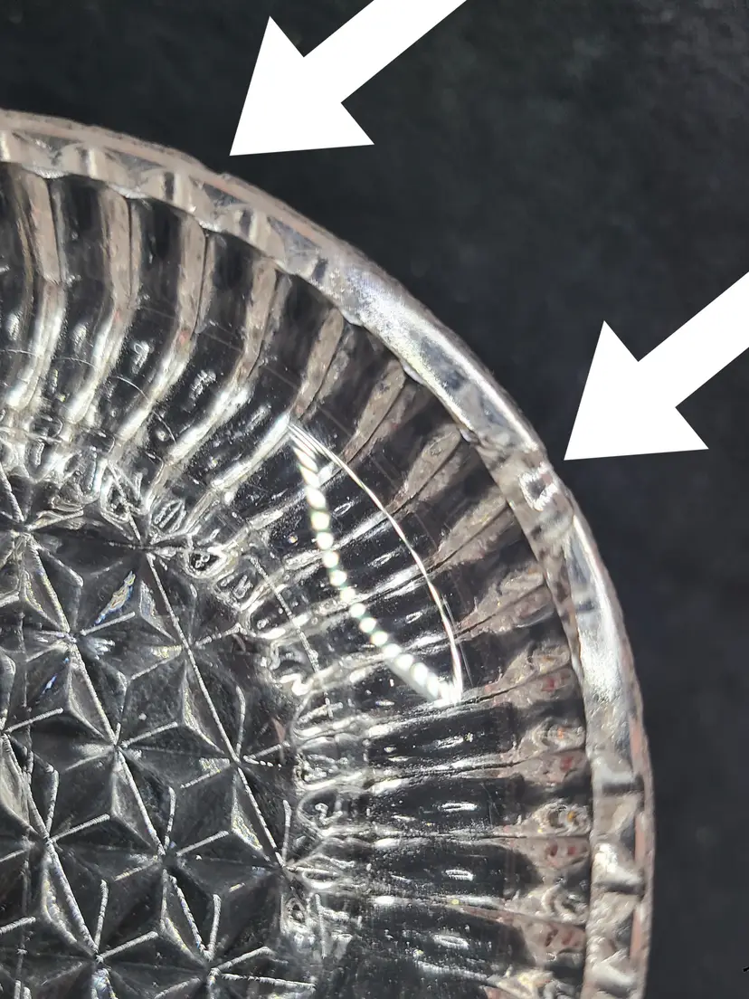 This is the pint size version of the Queen pattern by Adams & Co. Take a look at all pics, please. We do have a few chips along the top rim of the jar as shown. The lid is a little more chippy along the edge. Measures approx 4.5" tall (with lid on) and 3.75" wide at top. Has a nice manganese glow under 365nm and 395nm. Pic shows w/ 365.