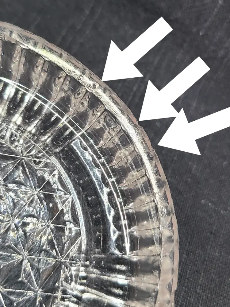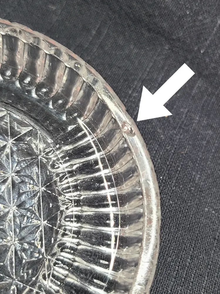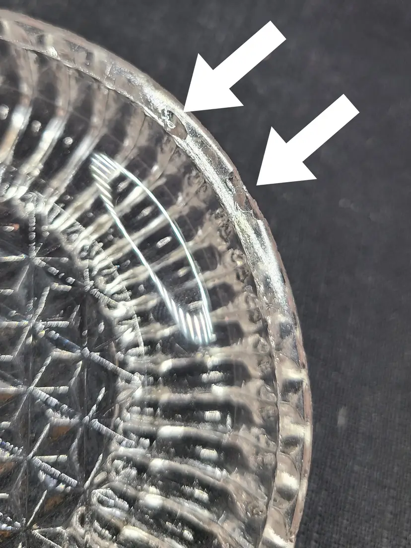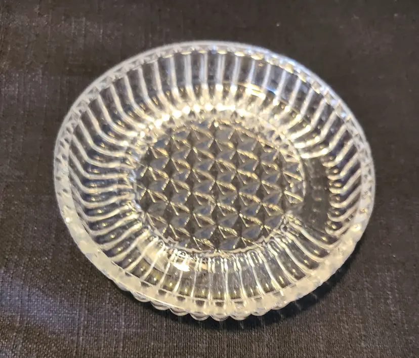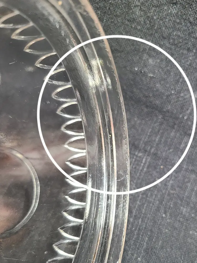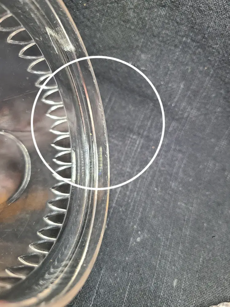 This is the pint size version of the Queen pattern by Adams & Co. Take a look at all pics, please. We do have a few chips along the top rim of the jar as shown. The lid is a little more chippy along the edge. Measures approx 4.5" tall (with lid on) and 3.75" wide at top. Has a nice manganese glow under 365nm and 395nm. Pic shows w/ 365.