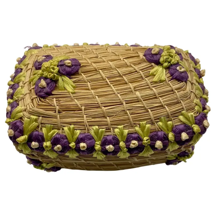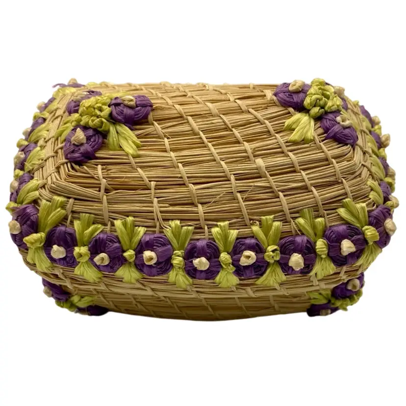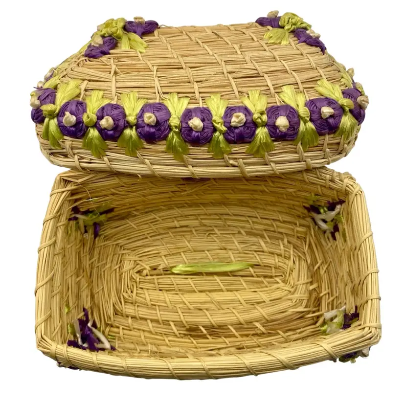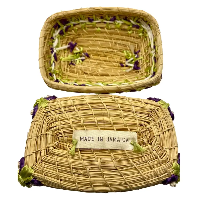 This beautiful Jamaican woven basket features a soft rectangular shape and is hand-decorated with delightful purple flowers accented with green leaves. The basket is made of high-quality raffia and features a natural finish that adds to its overall appeal. The basket is 5 inches long, 4 inches wide and 3 inches high (slightly domed). It can be used in a variety of ways, including as a dresser box or trinket box.